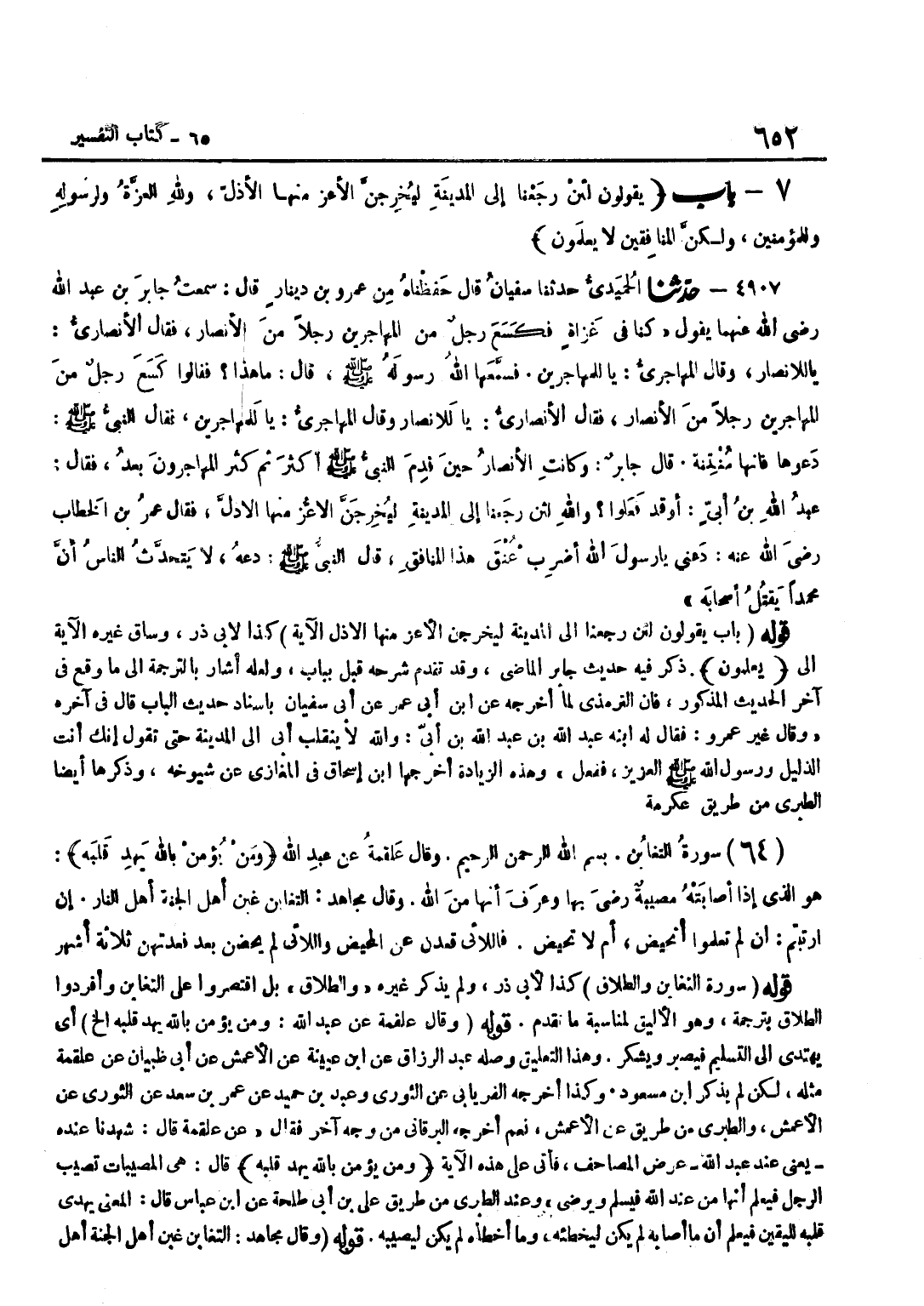 كَذَا لِأَبِي ذَرٍّ وَسَاقَ غَيْرُهُ الْآيَةَ إِلَى يَعْلَمُونَ ذَكَرَ فِيهِ حَدِيثَ جَابِرٍ الْمَاضِي وَقَدْ تَقَدَّمَ شَرْحُهُ قَبْلُ بِبَابٍ وَلَعَلَّهُ أَشَارَ بِالتَّرْجَمَةِ إِلَى مَا وَقَعَ فِي آخِرِ الْحَدِيثِ الْمَذْكُور فَإِن التِّرْمِذِيّ لما أخرجه عَن بن أَبِي عُمَرَ عَنْ أَبِي سُفْيَانَ بِإِسْنَادِ حَدِيثِ الْبَابِ قَالَ فِي آخِرِهِ وَقَالَ غَيْرُ عَمْرٍو فَقَالَ لَهُ ابْنُهُ عَبْدِ اللَّهِ بْنِ عَبْدِ اللَّهِ بْنِ أَبِي وَاللَّهِ لَا يَنْقَلِبُ أَبِي إِلَى الْمَدِينَةِ حَتَّى تَقُولَ إِنَّكَ أَنْتَ الذَّلِيلَ وَرَسُولُ اللَّهِ صَلَّى اللَّهُ عَلَيْهِ وَسَلَّمَ الْعَزِيزُ فَفعل وَهَذِه الزِّيَادَة أخرجهَا بن إِسْحَاقَ فِي الْمَغَازِي عَنْ شُيُوخِهِ وَذَكَرَهَا أَيْضًا الطَّبَرِيّ من طَرِيق عِكْرِمَة قَوْلُهُ سُورَةُ التَّغَابُنِ وَالطَّلَاقِ كَذَا لِأَبِي ذَرٍّ وَلَمْ يَذْكُرْ غَيْرَهُ وَالطَّلَاقِ بَلِ اقْتَصَرُوا عَلَى التَّغَابُنِ وَأَفْرَدُوا الطَّلَاقَ بِتَرْجَمَةٍ وَهُوَ الْأَلْيَقُ لِمُنَاسَبَةِ مَا تَقَدَّمَ قَوْلُهُ وَقَالَ عَلْقَمَةُ عَنْ عَبْدِ الله وَمن يُؤمن بِاللَّه يهد قلبه إِلَخْ أَيْ يَهْتَدِي إِلَى التَّسْلِيمِ فَيَصْبِرُ وَيَشْكُرُ وَهَذَا التَّعْلِيق وَصله عبد الرَّزَّاق عَن بن عُيَيْنَةَ عَنِ الْأَعْمَشِ عَنْ أَبِي ظَبْيَانَ عَنْ عَلْقَمَة مثله لَكِن لم يذكر بن مَسْعُودٍ وَكَذَا أَخْرَجَهُ الْفِرْيَابِيُّ عَنِ الثَّوْرِيِّ وَعَبْدُ بْنُ حُمَيْدٍ عَنْ عُمَرَ بْنِ سَعْدٍ عَنِ الثَّوْرِيِّ عَنِ الْأَعْمَشِ وَالطَّبَرِيُّ مِنْ طَرِيقٍ عَنِ الْأَعْمَشِ نَعَمْ أَخْرَجَهُ الْبَرْقَانِيُّ مِنْ وَجْهٍ آخَرَ فَقَالَ عَنْ عَلْقَمَةَ قَالَ شَهِدْنَا عِنْدَهُ يَعْنِي عِنْدَ عَبْدِ اللَّهِ عَرْضَ الْمَصَاحِفِ فَأَتَى عَلَى هَذِهِ الْآيَةِ وَمَنْ يُؤْمِنْ بِاللَّهِ يَهْدِ قَلْبَهُ قَالَ هِيَ الْمُصِيبَاتُ تُصِيبُ الرَّجُلَ فَيَعْلَمُ أَنَّهَا مِنْ عِنْدِ اللَّهِ فَيُسَلِّمْ وَيَرْضَى وَعِنْدَ الطَّبَرِيُّ مِنْ طَرِيقِ عَلِيِّ بْنِ أَبِي طَلْحَةَ عَنِ بن عَبَّاسٍ قَالَ الْمَعْنَى يَهْدِي قَلْبَهُ لِلْيَقِينِ فَيَعْلَمُ أَنَّ مَا أَصَابَهُ لَمْ يَكُنْ لِيُخْطِئَهُ وَمَا أَخْطَأَهُ لَمْ يَكُنْ لِيُصِيبَهُ قَوْلُهُ وَقَالَ مُجَاهِدٌ التَّغَابُنُ غَبْنُ أَهْلِ الْجَنَّةِ أَهْلَ