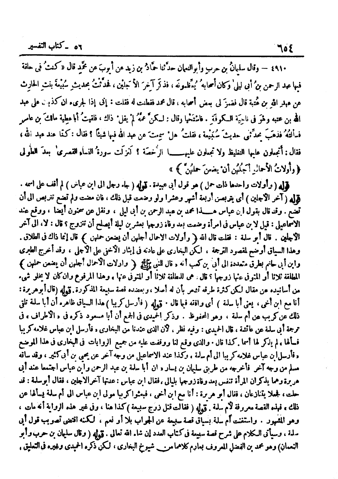 [4909] قَوْله جَاءَ رجل إِلَى بن عَبَّاسٍ لَمْ أَقِفْ عَلَى اسْمِهِ قَوْلُهُ آخِرُ الْأَجَلَيْنِ أَيْ يَتَرَبَّصْنَ أَرْبَعَةَ أَشْهُرٍ وَعَشْرًا وَلَوْ وَضَعَتْ قَبْلَ ذَلِكَ فَإِنْ مَضَتْ وَلَمْ تَضَعْ تَتَرَبَّصْ إِلَى أَنْ تَضَعَ وَقَدْ قَالَ بِقَوْلِ بن عَبَّاسٍ هَذَا مُحَمَّدُ بْنُ عَبْدِ الرَّحْمَنِ بْنِ أَبِي لَيْلَى وَنُقِلَ عَنْ سَحْنُونٍ أَيْضًا وَوَقَعَ عِنْدَ الْإِسْمَاعِيلِيِّ قِيلَ لِابْنِ عَبَّاسٍ فِي امْرَأَةٍ وَضَعَتْ بَعْدَ وَفَاةِ زَوْجِهَا بِعِشْرِينَ لَيْلَةً أَيَصْلُحُ أَنْ تَتَزَوَّجَ قَالَ لَا إِلَى آخِرِ الْأَجَلَيْنِ قَالَ أَبُو سَلَمَةَ فَقُلْتُ قَالَ اللَّهُ وَأُولَاتُ الْأَحْمَال أَجلهنَّ أَن يَضعن حَملهنَّ قَالَ إِنَّمَا ذَاكَ فِي الطَّلَاقِ وَهَذَا السِّيَاقُ أَوْضَحُ لِمَقْصُودِ التَّرْجَمَةِ لَكِنَّ الْبُخَارِيُّ عَلَى عَادَتِهِ فِي إِيثَارِ الْأَخْفَى عَلَى الْأَجْلَى وَقَدْ أَخْرَجَ الطَّبَرِيّ وبن أَبِي حَاتِمٍ بِطُرُقٍ مُتَعَدِّدَةٍ إِلَى أُبَيِّ بْنِ كَعْبٍ أَنَّهُ قَالَ لِلنَّبِيِّ صَلَّى اللَّهُ عَلَيْهِ وَسَلَّمَ وَأُولَاتُ الْأَحْمَالِ أَجَلُهُنَّ أَنْ يَضَعْنَ حَمْلَهُنَّ الْمُطَلَّقَةُ ثَلَاثًا أَوِ الْمُتَوَفَّى عَنْهَا زَوْجُهَا قَالَ هِيَ لِلْمُطَلَّقَةِ ثَلَاثًا أَوِ الْمُتَوَفَّى عَنْهَا وَهَذَا الْمَرْفُوعُ وَإِنْ كَانَ لَا يَخْلُو شَيْءٌ مِنْ أَسَانِيدِهِ عَنْ مَقَالٍ لَكِنَّ كَثْرَةَ طُرُقِهِ تُشْعِرُ بِأَنَّ لَهُ أَصْلًا وَيُعَضِّدُهُ قِصَّةُ سُبَيْعَةَ الْمَذْكُورَةُ قَوْله قَالَ أَبُو هُرَيْرَة أَنا مَعَ بن أَخِي يَعْنِي أَبَا سَلَمَةَ أَيْ وَافَقَهُ فِيمَا قَالَ قَوْلُهُ فَأَرْسَلَ كُرَيْبًا هَذَا السِّيَاقُ ظَاهِرُهُ أَنَّ أَبَا سَلَمَةَ تَلَقَّى ذَلِكَ عَنْ كُرَيْبٍ عَنْ أُمِّ سَلَمَةَ وَهُوَ الْمَحْفُوظُ وَذَكَرَ الْحُمَيْدِيُّ فِي الْجَمْعِ أَنَّ أَبَا مَسْعُودٍ ذَكَرَهُ فِي الْأَطْرَافِ فِي تَرْجَمَةِ أَبِي سَلَمَةَ عَنْ عَائِشَةَ قَالَ الْحُمَيْدِيُّ وَفِيهِ نَظَرٌ لِأَنَّ الَّذِي عِنْدَنَا من البُخَارِيّ فَأرْسل بن عَبَّاسٍ غُلَامَهُ كُرَيْبًا فَسَأَلَهَا لَمْ يَذْكُرْ لَهَا اسْمًا كَذَا قَالَ وَالَّذِي وَقَعَ لَنَا وَوَقَفْتُ عَلَيْهِ مِنْ جَمِيعِ الرِّوَايَاتِ فِي الْبُخَارِيِّ فِي هَذَا الْموضع فَأرْسل بن عَبَّاسٍ غُلَامَهُ كُرَيْبًا إِلَى أُمِّ سَلَمَةَ وَكَذَا عِنْدَ الْإِسْمَاعِيلِيِّ مِنْ وَجْهٍ آخَرَ عَنْ يَحْيَى بْنِ أَبِي كَثِيرٍ وَقَدْ سَاقَهُ مُسْلِمٌ مِنْ وَجْهٍ آخَرَ فَأَخْرَجَهُ مِنْ طَرِيقِ سُلَيْمَانَ بْنِ يَسَارٍ أَنَّ أَبَا سَلَمَةَ بْنَ عَبْدِ الرَّحْمَنِ وبن عَبَّاسٍ اجْتَمَعَا عِنْدَ أَبِي هُرَيْرَةَ وَهُمَا يَذْكُرَانِ الْمَرْأَةَ تُنْفَسُ بَعْدَ وَفَاةِ زَوْجِهَا بِلَيَالِي فَقَالَ بن عَبَّاسٍ عِدَّتُهَا آخِرُ الْأَجَلَيْنِ فَقَالَ أَبُو سَلَمَةَ قَدْ حَلَّتْ فَجَعَلَا يَتَنَازَعَانِ فَقَالَ أَبُو هُرَيْرَةَ أَنا مَعَ بن أخي فبعثوا كريبا مولى بن عَبَّاسٍ إِلَى أُمِّ سَلَمَةَ يَسْأَلُهَا عَنْ ذَلِكَ فَهَذِهِ الْقِصَّةُ مَعْرُوفَةٌ لِأُمِّ سَلَمَةَ قَوْلُهُ فَقَالَتْ قُتِلَ زَوْجُ سُبَيْعَةَ كَذَا هُنَا وَفِي غَيْرِ هَذِهِ الرِّوَايَةِ أَنَّهُ مَاتَ وَهُوَ الْمَشْهُورُ وَاسْتَغْنَتْ أُمُّ سَلَمَةَ بِسِيَاقِ قِصَّةِ سُبَيْعَةَ عَنِ الْجَوَابِ بِلَا أَوْ نَعَمْ لَكِنَّهُ اقْتَضَى تَصْوِيبَ قَوْلِ أَبِي سَلَمَةَ وَسَيَأْتِي الْكَلَامُ عَلَى شَرْحِ قِصَّةِ سُبَيْعَةَ فِي كِتَابِ الْعِدَدِ إِنْ شَاءَ اللَّهُ تَعَالَى قَوْلُهُ وَقَالَ سُلَيْمَانُ بْنُ حَرْبٍ وَأَبُو النُّعْمَانِ وَهُوَ مُحَمَّدُ بْنُ الْفَضْلِ الْمَعْرُوفُ بِعَارِمٍ كِلَاهُمَا مِنْ شُيُوخِ الْبُخ