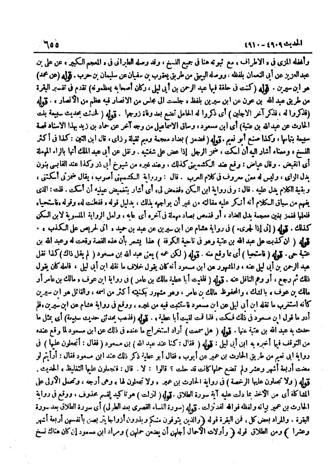 وَأَغْفَلَهُ الْمِزِّيُّ فِي الْأَطْرَافِ مَعَ ثُبُوتِهِ هُنَا فِي جَمِيعِ النُّسَخِ وَقَدْ وَصَلَهُ الطَّبَرَانِيُّ فِي الْمُعْجَمِ الْكَبِيرِ عَنْ عَلِيِّ بْنِ عَبْدِ الْعَزِيزِ عَنْ أَبِي النُّعْمَانِ بِلَفْظِهِ وَوَصَلَهُ الْبَيْهَقِيُّ مِنْ طَرِيقِ يَعْقُوبَ بْنِ سُفْيَانَ عَنْ سُلَيْمَانَ بْنِ حَرْب قَوْله عَن مُحَمَّد هُوَ بن سِيرِينَ قَوْلُهُ كُنْتُ فِي حَلْقَةٍ فِيهَا عَبْدُ الرَّحْمَنِ بْنُ أَبِي لَيْلَى وَكَانَ أَصْحَابُهُ يُعَظِّمُونَهُ تَقَدَّمَ فِي تَفْسِيرِ الْبَقَرَةِ مِنْ طَرِيقِ عَبْدِ اللَّهِ بْنِ عَوْنٍ عَنِ بن سِيرِينَ بِلَفْظِ جَلَسْتُ إِلَى مَجْلِسٍ مِنْ الْأَنْصَارِ فِيهِ عظم مِنْ الْأَنْصَارِ قَوْلُهُ فَذَكَرُوا لَهُ فَذَكَرَ آخِرَ الْأَجَلَيْنِ أَيْ ذَكَرُوا لَهُ الْحَامِلَ تَضَعُ بَعْدَ وَفَاةِ زَوْجِهَا قَوْلُهُ فَحَدَّثْتُ بِحَدِيثِ سُبَيْعَةَ بِنْتِ الْحَارِثِ عَنْ عَبْدِ اللَّهِ بْنِ عُتْبَةَ أَيِ بن مَسْعُودٍ وَسَاقَ الْإِسْمَاعِيلِيُّ مِنْ وَجْهٍ آخَرَ عَنْ حَمَّادِ بْنِ زَيْدٍ بِهَذَا الْإِسْنَادِ قِصَّةَ سُبَيْعَةَ بِتَمَامِهَا وَكَذَا صَنَعَ أَبُو نُعَيْمٍ قَوْلُهُ فَضَمَّزَ بضاد مُعْجمَة وَمِيم ثَقيلَة وزاي قَالَ بن التِّينِ كَذَا فِي أَكْثَرِ النُّسَخِ وَمَعْنَاهُ أَشَارَ إِلَيْهِ أَنِ اسْكُتْ ضَمَّزَ الرَّجُلُ إِذَا عَضَّ عَلَى شَفَتَيْهِ وَنُقِلَ عَنْ أَبِي عَبْدِ الْمَلِكِ أَنَّهَا بِالرَّاءِ الْمُهْمَلَةِ أَيِ انْقَبَضَ وَقَالَ عِيَاضٌ وَقَعَ عِنْدَ الْكُشْمِيهَنِيِّ كَذَلِكَ وَعِنْدَ غَيْرِهِ مِنْ شُيُوخِ أَبِي ذَرٍّ وَكَذَا عِنْدَ الْقَابِسِيِّ بِنُونٍ بَدَلَ الزَّايِ وَلَيْسَ لَهُ مَعْنًى مَعْرُوفٌ فِي كَلَامِ الْعَرَبِ قَالَ وَرِوَايَةُ الْكُشْمِيهَنِيِّ أَصْوَبُ يُقَالُ ضَمَّزَنِي أَسْكَتَنِي وَبَقِيَّةُ الْكَلَامِ يَدُلُّ عَلَيْهِ قَالَ وَفِي رِوَايَة بن السَّكَنِ فَغَمَّضَ لِي أَيْ أَشَارَ بِتَغْمِيضِ عَيْنَيْهِ أَنِ اسْكُتْ قُلْتُ الَّذِي يُفْهَمُ مِنْ سِيَاقِ الْكَلَامِ أَنَّهُ أَنْكَرَ عَلَيْهِ مَقَالَتَهُ مِنْ غَيْرِ أَن يواجهه بِذَلِكَ بِدَلِيلِ قَوْلِهِ فَفَطِنْتُ لَهُ وَقَوْلُهُ فَاسْتَحْيَا فَلَعَلَّهَا فَغَمَزَ بِغَيْنٍ مُعْجَمَةٍ بَدَلَ الضَّادِ أَوْ فَغَمَصَ بِصَادٍ مُهْمَلَةٍ فِي آخِرِهِ أَيْ عَابَهُ وَلَعَلَّ الرِّوَايَةَ الْمَنْسُوبَةَ لِابْنِ السَّكَنِ كَذَلِكَ قَوْلُهُ إِنِّي إِذًا لَجَرِيءٌ فِي رِوَايَةِ هِشَامٍ عَنِ بن سِيرِينَ عَنْ عَبْدِ بْنِ حُمَيْدٍ إِنِّي لَحَرِيصٌ عَلَى الْكَذِبِ قَوْلُهُ إِنْ كَذَبْتُ عَلَى عَبْدِ اللَّهِ بْنِ عُتْبَةَ وَهُوَ فِي نَاحِيَةِ الْكُوفَةِ هَذَا يُشْعِرُ بِأَنَّ هَذِهِ الْقِصَّةَ وَقَعَتْ لَهُ وَعَبْدُ اللَّهِ بْنُ عُتْبَةَ حَيٌّ قَوْلُهُ فَاسْتَحْيَا أَيْ مِمَّا وَقَعَ مِنْهُ قَوْلُهُ لَكِنَّ عَمَّهُ يَعْنِي عَبْدَ اللَّهِ بْنَ مَسْعُودٍ لَمْ يَقُلْ ذَاكَ كَذَا نَقَلَ عَبْدُ الرَّحْمَنِ بْنُ أَبِي ليلى عَنهُ وَالْمَشْهُور عَن بن مَسْعُودٍ أَنَّهُ كَانَ يَقُولُ خِلَافَ مَا نَقَلَهُ بن أَبِي لَيْلَى فَلَعَلَّهُ كَانَ يَقُولُ ذَلِكَ ثُمَّ رَجَعَ أَوْ وَهِمَ النَّاقِلُ عَنْهُ قَوْلُهُ فَلَقِيتُ أَبَا عَطِيَّةَ مَالِكَ بْنَ عَامِرٍ فِي رِوَايَةٍ بن عَوْفٍ مَالِكُ بْنُ عَامِرٍ أَوْ مَالِكُ بْنُ عَوْفٍ بِالشَّكِّ وَالْمَحْفُوظُ مَالِكُ بْنُ عَامِرٍ وَهُوَ مَشْهُورٌ بِكُنْيَتِهِ أَكْثَرُ مِنَ اسْمِهِ وَالْقَائِلُ هُوَ بن سِيرِين كَأَنَّهُ اسْتغْرب مَا نَقله بن أبي ليلى عَن بن مَسْعُودٍ فَاسْتَثْبَتَ فِيهِ مِنْ غَيْرِهِ وَوَقَعَ فِي رِوَايَة هِشَام عَن بن سِيرِين فَلم أدر مَا قَول بن مَسْعُودٍ فِي ذَلِكَ فَسَكَتَ فَلَمَّا قُمْتُ لَقِيتُ أَبَا عَطِيَّةَ 