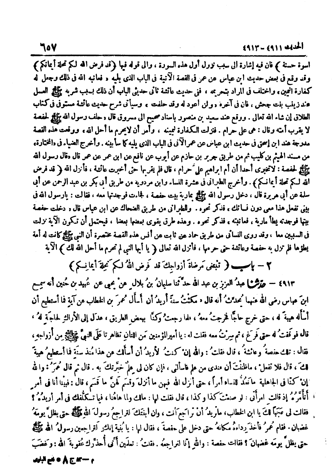 أُسْوَة حَسَنَة فَإِنَّ فِيهِ إِشَارَةٌ إِلَى سَبَبِ نُزُولِ أَوَّلِ هَذِهِ السُّورَةِ وَإِلَى قَوْلِهِ فِيهَا قَدْ فَرَضَ الله لكم تَحِلَّة أَيْمَانكُم وَقد وَقع فِي بعض حَدِيث بن عَبَّاسٍ عَنْ عُمَرَ فِي الْقِصَّةِ الْآتِيَةِ فِي الْبَابِ الَّذِي يَلِيهِ فَعَاتَبَهُ اللَّهُ فِي ذَلِكَ وَجَعَلَ لَهُ كَفَّارَةَ الْيَمِينِ وَاخْتُلِفَ فِي الْمُرَادِ بِتَحْرِيمِهِ فَفِي حَدِيثِ عَائِشَةَ ثَانِي حَدِيثَيِ الْبَابِ أَنَّ ذَلِكَ بِسَبَبِ شُرْبِهِ صَلَّى اللَّهُ عَلَيْهِ وَسَلَّمَ الْعَسَلَ عِنْدَ زَيْنَبَ بِنْتِ جَحْشٍ فَإِنَّ فِي آخِرِهِ وَلَنْ أَعُودَ لَهُ وَقَدْ حَلَفْتُ وَسَيَأْتِي شَرْحُ حَدِيثِ عَائِشَةَ مُسْتَوْفًى فِي كِتَابِ الطَّلَاقِ إِنْ شَاءَ اللَّهُ تَعَالَى وَوَقَعَ عِنْدَ سَعِيدِ بْنِ مَنْصُورٍ بِإِسْنَادٍ صَحِيحٍ إِلَى مَسْرُوقٍ قَالَ حَلَفَ رَسُولُ اللَّهِ صَلَّى اللَّهُ عَلَيْهِ وَسَلَّمَ لِحَفْصَةَ لَا يَقْرَبُ أَمَتَهُ وَقَالَ هِيَ عَلَيَّ حَرَامٌ فَنَزَلَتِ الْكَفَّارَةُ لِيَمِينِهِ وَأُمِرَ أَنْ لَا يُحَرِّمَ مَا أَحَلَّ اللَّهُ وَوَقَعَتْ هَذِهِ الْقِصَّة مدرجة عِنْد بن إِسْحَاق فِي حَدِيث بن عَبَّاسٍ عَنْ عُمَرَ الْآتِي فِي الْبَابِ الَّذِي يَلِيهِ كَمَا سَأُبَيِّنُهُ وَأَخْرَجَ الضِّيَاءُ فِي الْمُخْتَارَةِ مِنْ مُسْنَدِ الْهَيْثَمِ بْنِ كُلَيْبٍ ثُمَّ مِنْ طَرِيقِ جَرِيرِ بْنِ حَازِمٍ عَنْ أَيُّوبَ عَنْ نَافِع عَن بن عُمَرَ عَنْ عُمَرَ قَالَ قَالَ رَسُولُ اللَّهِ صَلَّى اللَّهُ عَلَيْهِ وَسَلَّمَ لِحَفْصَةَ لَا تُخْبِرِي أَحَدًا أَنَّ أُمَّ إِبْرَاهِيمَ عَلَيَّ حَرَامٌ قَالَ فَلَمْ يَقْرَبْهَا حَتَّى أَخْبَرَتْ عَائِشَةَ فَأَنْزَلَ اللَّهُ قد فرض الله لكم تَحِلَّة أَيْمَانكُم وَأخرج الطَّبَرَانِيّ فِي عشرَة النِّسَاء وبن مَرْدَوَيْهِ مِنْ طَرِيقِ أَبِي بَكْرِ بْنِ عَبْدِ الرَّحْمَنِ عَنْ أَبِي سَلَمَةَ عَنْ أَبِي هُرَيْرَةَ قَالَ دَخَلَ رَسُولُ اللَّهِ صَلَّى اللَّهُ عَلَيْهِ وَسَلَّمَ بِمَارِيَةَ بَيْتَ حَفْصَةَ فَجَاءَتْ فَوَجَدَتْهَا مَعَهُ فَقَالَتْ يَا رَسُولَ اللَّهِ فِي بَيْتِي تَفْعَلُ هَذَا مَعِي دُونَ نِسَائِكَ فَذَكَرَ نَحْوَهُ وَلِلطَّبَرَانِيِّ من طَرِيق الضَّحَّاك عَن بن عَبَّاسٍ قَالَ دَخَلَتْ حَفْصَةُ بَيْتَهَا فَوَجَدَتْهُ يَطَأُ مَارِيَةَ فَعَاتَبَتْهُ فَذَكَرَ نَحْوَهُ وَهَذِهِ طُرُقٌ يُقَوِّي بَعْضُهَا بَعْضًا فَيَحْتَمِلُ أَنْ تَكُونَ الْآيَةُ نَزَلَتْ فِي السَّبَبَيْنِ مَعًا وَقَدْ رَوَى النَّسَائِيُّ مِنْ طَرِيقِ حَمَّادٍ عَنْ ثَابِتٍ عَنْ أَنَسٍ هَذِهِ الْقِصَّةَ مُخْتَصَرَةً أَنَّ النَّبِيَّ صَلَّى اللَّهُ عَلَيْهِ وَسَلَّمَ كَانَتْ لَهُ أَمَةٌ يَطَؤُهَا فَلَمْ تَزَلْ بِهِ حَفْصَةُ وَعَائِشَةُ حَتَّى حَرَّمَهَا فَأَنْزَلَ اللَّهُ تَعَالَى يَا أَيُّهَا النَّبِيُّ لِمَ تُحَرِّمُ مَا أَحَلَّ اللَّهُ لَكَ الْآيَة