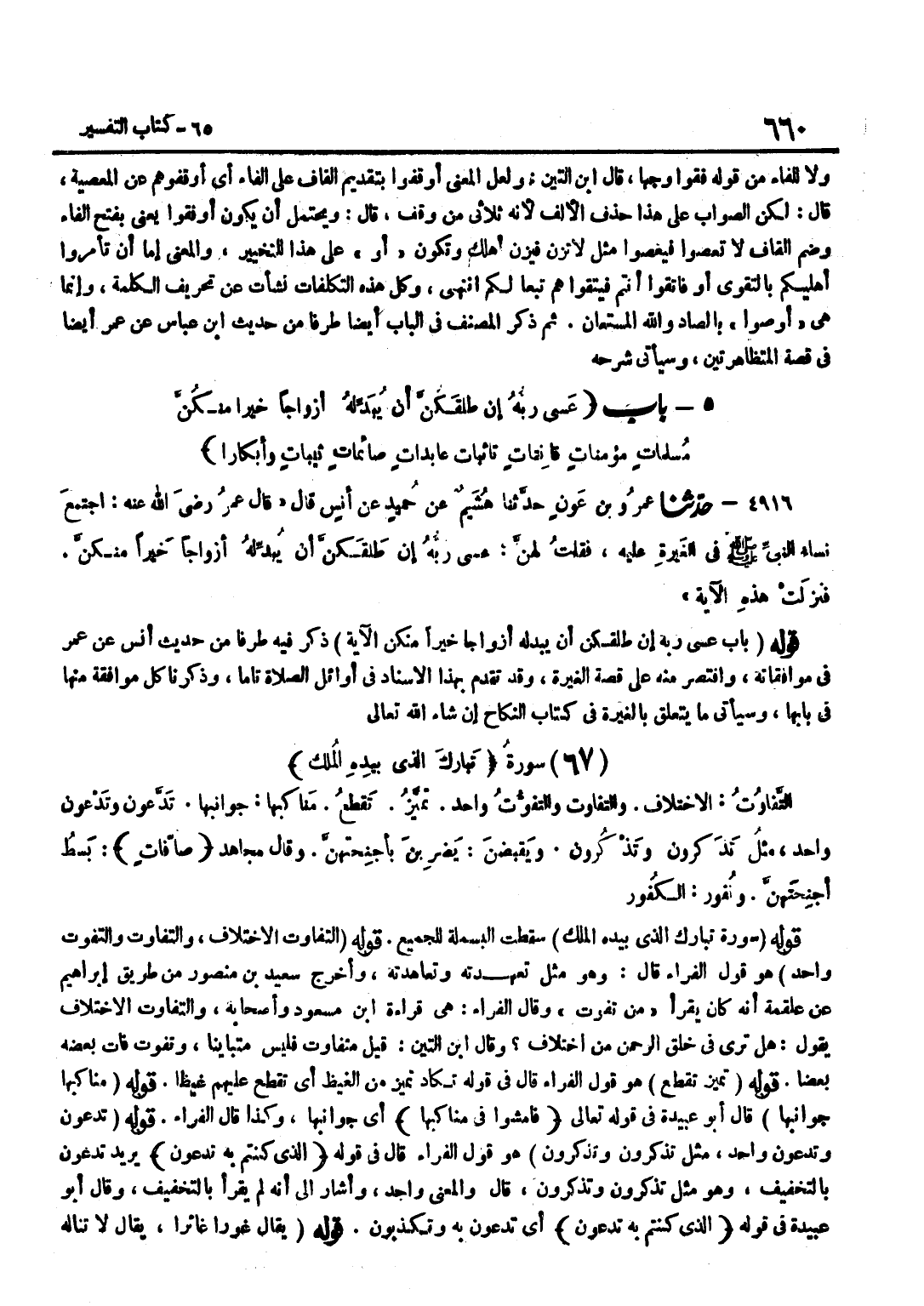 ذَكَرَ فِيهِ طَرَفًا مِنْ حَدِيثِ أَنَسٍ عَنْ عُمَرَ فِي مُوَافَقَاتِهِ وَاقْتَصَرَ مِنْهُ عَلَى قِصَّةِ الْغَيْرَةِ وَقَدْ تَقَدَّمَ بِهَذَا الْإِسْنَادِ فِي أَوَائِلِ الصَّلَاةِ تَامًّا وَذَكَرْنَا كُلَّ مُوَافَقَةٍ مِنْهَا فِي بَابِهَا وَسَيَأْتِي مَا يَتَعَلَّقُ بِالْغَيْرَةِ فِي كِتَابِ النِّكَاحِ إِنْ شَاءَ اللَّهُ تَعَالَى قَوْله سُورَة تبَارك الَّذِي بِيَدِهِ الْملك سَقَطَتِ الْبَسْمَلَةُ لِلْجَمِيعِ قَوْلُهُ التَّفَاوُتُ الِاخْتِلَافُ وَالتَّفَاوُتُ وَالتَّفَوُّتُ وَاحِدٌ هُوَ قَوْلُ الْفَرَّاءِ قَالَ وَهُوَ مِثْلُ تَعَهَّدْتُهُ وَتَعَاهَدْتُهُ وَأَخْرَجَ سَعِيدُ بْنُ مَنْصُورٍ مِنْ طَرِيقِ إِبْرَاهِيمَ عَنْ عَلْقَمَةَ أَنَّهُ كَانَ يَقْرَأُ مِنْ تَفَوُّتٍ وَقَالَ الْفَرَّاءُ هِيَ قِرَاءَة بن مَسْعُودٍ وَأَصْحَابِهِ وَالتَّفَاوُتُ الِاخْتِلَافُ يَقُولُ هَلْ تَرَى فِي خلق الرَّحْمَن من اخْتِلَاف وَقَالَ بن التِّين قيل مُتَفَاوِتٌ فَلَيْسَ مُتَبَايِنًا وَتَفَوَّتَ فَاتَ بَعْضُهُ بَعْضًا قَوْلُهُ تَمَيَّزُ تَقَطَّعُ هُوَ قَوْلُ الْفَرَّاءِ قَالَ فِي قَوْله تكَاد تميز من الغيظ أَيْ تَقَطَّعُ عَلَيْهِمْ غَيْظًا قَوْلُهُ مَنَاكِبِهَا جَوَانِبِهَا قَالَ أَبُو عُبَيْدَةَ فِي قَوْلِهِ تَعَالَى فَامْشُوا فِي مناكبها أَيْ جَوَانِبِهَا وَكَذَا قَالَ الْفَرَّاءُ قَوْلُهُ تَدَّعُونَ وَتَدْعُونَ وَاحِدٌ مِثْلُ تَذَّكَّرُونَ وَتَذْكُرُونَ هُوَ قَوْلُ الْفَرَّاءِ قَالَ فِي قَوْلِهِ الَّذِي كُنْتُمْ بِهِ تدعون يُرِيدُ تَدْعُونَ بِالتَّخْفِيفِ وَهُوَ مِثْلُ تَذَّكَّرُونَ وَتَذْكُرُونَ قَالَ وَالْمَعْنَى وَاحِدٌ وَأَشَارَ إِلَى أَنَّهُ لَمْ يُقْرَأْ بِالتَّخْفِيفِ وَقَالَ أَبُو عُبَيْدَةَ فِي قَوْلِهِ الَّذِي كُنْتُم بِهِ تدعون أَيْ تَدَّعُونَ بِهِ وَتُكَذِّبُونَ قَوْلُهُ يُقَالُ غَوْرًا غَائِرًا يُقَالُ لَا تَنَالُهُ