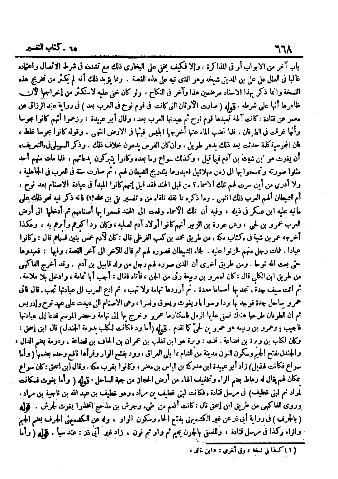 بَابٍ آخَرَ مِنَ الْأَبْوَابِ أَوْ فِي الْمُذَاكَرَةِ وَإِلَّا فَكَيْفَ يَخْفَى عَلَى الْبُخَارِيِّ ذَلِكَ مَعَ تَشَدُّدِهِ فِي شَرْطِ الِاتِّصَالِ وَاعْتِمَادِهِ غَالِبًا فِي الْعِلَلِ عَلَى عَلِيِّ بْنِ الْمَدِينِيِّ شَيْخِهِ وَهُوَ الَّذِي نَبَّهَ عَلَى هَذِهِ الْقِصَّةِ وَمِمَّا يُؤَيِّدُ ذَلِكَ أَنَّهُ لَمْ يُكْثِرْ مِنْ تَخْرِيجِ هَذِهِ النُّسْخَةِ وَإِنَّمَا ذَكَرَ بِهَذَا الْإِسْنَادِ مَوْضِعَيْنِ هَذَا وَآخَرَ فِي النِّكَاحِ وَلَوْ كَانَ خَفِيَ عَلَيْهِ لَاسْتَكْثَرَ مِنْ إِخْرَاجِهَا لِأَنَّ ظَاهِرَهَا أَنَّهَا عَلَى شَرْطِهِ قَوْلُهُ صَارَتِ الْأَوْثَانُ الَّتِي كَانَتْ فِي قَوْمِ نُوحٍ فِي الْعَرَبِ بَعْدُ فِي رِوَايَةِ عَبْدِ الرَّزَّاقِ عَنْ مَعْمَرٍ عَنِ قَتَادَة كَانَت آلِهَةٌ تَعْبُدُهَا قَوْمُ نُوحٍ ثُمَّ عَبَدَتْهَا الْعَرَبُ بَعْدُ وَقَالَ أَبُو عُبَيْدَةَ وَزَعَمُوا أَنَّهُمْ كَانُوا مَجُوسًا وَأَنَّهَا غَرِقَتْ فِي الطُّوفَانِ فَلَمَّا نَضَبَ الْمَاءُ عَنْهَا أَخْرَجَهَا إِبْلِيسُ فَبَثَّهَا فِي الْأَرْضِ انْتَهَى وَقَوْلُهُ كَانُوا مَجُوسًا غَلَطٌ فَإِنَّ الْمَجُوسِيَّةَ كَلِمَةٌ حَدَثَتْ بَعْدَ ذَلِكَ بِدَهْرٍ طَوِيلٍ وَإِنْ كَانَ الْفُرْسُ يَدَّعُونَ خِلَافَ ذَلِكَ وَذَكَرَ السُّهَيْلِيُّ فِي التَّعْرِيف أَن يَغُوث هُوَ بن شِيثَ بْنِ آدَمَ فِيمَا قِيلَ وَكَذَلِكَ سُوَاعٌ وَمَا بَعْدَهُ وَكَانُوا يَتَبَرَّكُونَ بِدُعَائِهِمْ فَلَمَّا مَاتَ مِنْهُم أحد مثلُوا صورته وتمسحوا بِهَا إِلَى زَمَنِ مَهْلَائِيلَ فَعَبَدُوهَا بِتَدْرِيجِ الشَّيْطَانِ لَهُمْ ثُمَّ صَارَتْ سُنَّةً فِي الْعَرَبِ فِي الْجَاهِلِيَّةِ وَلَا أَدْرِي مِنْ أَيْنَ سَرَتْ لَهُمْ تِلْكَ الْأَسْمَاءُ مِنْ قِبَلِ الْهِنْدِ فَقَدْ قِيلَ إِنَّهُمْ كَانُوا الْمَبْدَأَ فِي عِبَادَةِ الْأَصْنَامِ بَعْدَ نُوحٍ أَمِ الشَّيْطَانُ أَلْهَمَ الْعَرَبَ ذَلِكَ انْتَهَى وَمَا ذكره مِمَّا نَقَلَهُ تَلَقَّاهُ مِنْ تَفْسِيرِ بَقِيِّ بْنِ مخلد فَإِنَّهُ ذَكَرَ فِيهِ نَحْوَ ذَلِكَ عَلَى مَا نبه عَلَيْهِ بن عَسْكَرٍ فِي ذَيْلِهِ وَفِيهِ أَنَّ تِلْكَ الْأَسْمَاءَ وَقَعَتْ إِلَى الْهِنْدِ فَسَمَّوْا بِهَا أَصْنَامَهُمْ ثُمَّ أَدْخَلَهَا إِلَى أَرْضِ الْعَرَبِ عَمْرُو بْنُ لُحَيٍّ وَعَنْ عُرْوَةَ بْنِ الزُّبَيْرِ أَنَّهُمْ كَانُوا أَوْلَادَ آدم لصلبه وَكَانَ ودا أَكْبَرَهُمْ وَأَبَرَّهُمْ بِهِ وَهَكَذَا أَخْرَجَهُ عُمَرُ بْنُ شَبَّةَ فِي كِتَابِ مَكَّةَ مِنْ طَرِيقِ مُحَمَّدِ بْنِ كَعْبٍ الْقُرَظِيِّ قَالَ كَانَ لِآدَمَ خَمْسُ بَنِينَ فَسَمَّاهُمْ قَالَ وَكَانُوا عُبَّادًا فَمَاتَ رَجُلٌ مِنْهُمْ فَحَزِنُوا عَلَيْهِ فَجَاءَ الشَّيْطَانُ فَصَوَّرَهُ لَهُمْ ثُمَّ قَالَ لِلْآخَرِ إِلَى آخِرِ الْقِصَّةِ وَفِيهَا فَعَبَدُوهَا حَتَّى بَعَثَ اللَّهُ نُوحًا وَمِنْ طَرِيقٍ أُخْرَى أَنَّ الَّذِي صَوَّرَهُ لَهُمْ رَجُلٌ مِنْ وَلَدِ قَابِيلَ بْنِ آدَمَ وَقَدْ أَخْرَجَ الْفَاكِهِيُّ من طَرِيق بن الْكَلْبِيِّ قَالَ كَانَ لِعَمْرِو بْنِ رَبِيعَةَ رَئِيٌّ مِنَ الْجِنِّ فَأَتَاهُ فَقَالَ أَجِبْ أَبَا ثُمَامَةَ وَادْخُلْ بِلَا مَلَامَةَ ثُمَّ ائْتِ سَيْفَ جُدَّةٍ تَجِدْ بِهَا أَصْنَامًا مُعَدَّةً ثُمَّ أَوْرِدْهَا تِهَامَةَ وَلَا تَهَبْ ثُمَّ ادْعُ الْعَرَبَ إِلَى عِبَادَتِهَا تُجَبْ قَالَ فَأَتَى عَمْرٌو سَاحِلَ جُدَّةَ فَوَجَدَ بِهَا وَدًّا وَسُوَاعًا وَيَغُوثَ وَيَعُوقَ وَنَسْرًا وَهِيَ الْأَصْنَامُ الَّتِي عُبِدَتْ عَلَى عَهْدِ نُوحٍ وَإِدْرِيسَ ثُمَّ إِنَّ الطُّوفَانَ طَرَحَهَا هُنَاكَ فَسَفَى عَلَيْهَا الرَّمْلُ فَاسْتَثَارَهَا عَمْرٌو وَخَرَجَ بِهَا إِلَى تِهَامَةَ وَحَضَرَ الْمَوْسِمَ ف