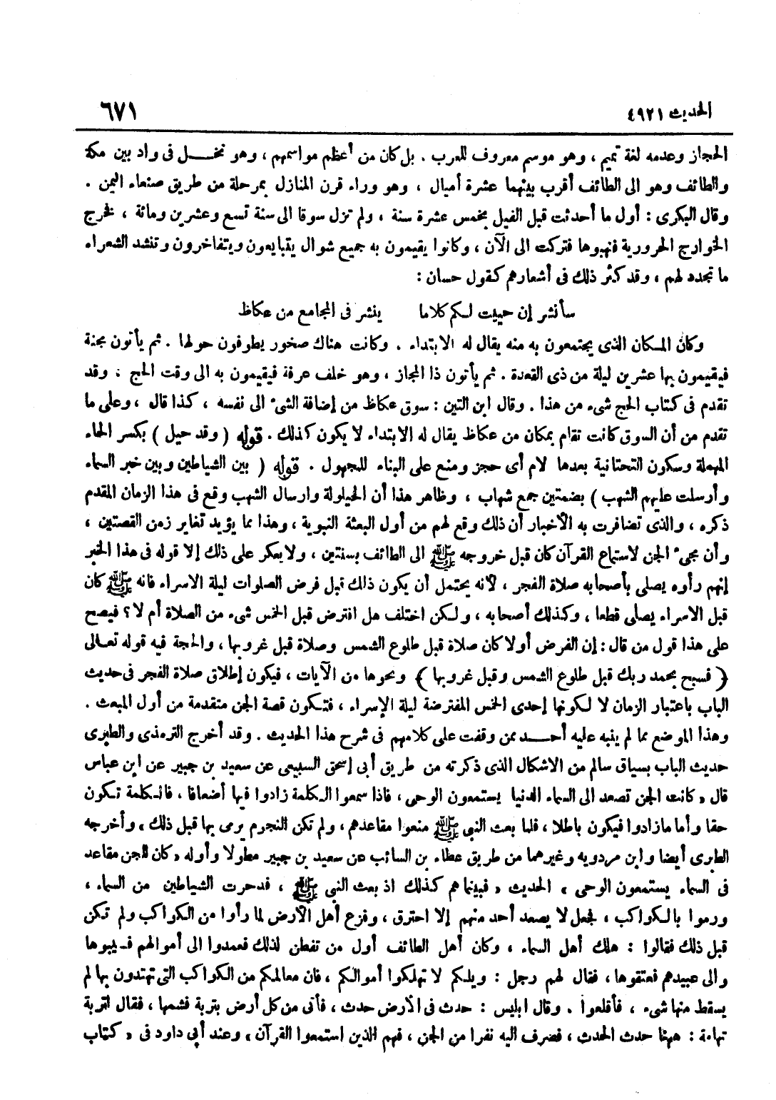 الْحِجَازِ وَعَدَمُهُ لُغَةُ تَمِيمٍ وَهُوَ مَوْسِمٌ مَعْرُوفٌ لِلْعَرَبِ بَلْ كَانَ مِنْ أَعْظَمِ مَوَاسِمِهِمْ وَهُوَ نَخْلٌ فِي وَادٍ بَيْنَ مَكَّةَ وَالطَّائِفِ وَهُوَ إِلَى الطَّائِفِ أَقْرَبُ بَيْنَهُمَا عَشَرَةُ أَمْيَالٍ وَهُوَ وَرَاءَ قَرْنِ الْمَنَازِلِ بِمَرْحَلَةٍ مِنْ طَرِيقِ صَنْعَاءِ الْيَمَنِ وَقَالَ الْبَكْرِيُّ أَوَّلُ مَا أُحْدِثَتْ قَبْلَ الْفِيلِ بِخَمْسَ عَشْرَةَ سَنَةً وَلَمْ تَزَلْ سُوقًا إِلَى سَنَةِ تِسْعٍ وَعِشْرِينَ وَمِائَةٍ فَخَرَجَ الْخَوَارِجُ الحرورية فنهبوها فَتركت إِلَى الْآن وَكَانُوا يُقِيمُونَ بِهِ جَمِيعَ شَوَّالٍ يَتَبَايَعُونَ وَيَتَفَاخَرُونَ وَتُنْشِدُ الشُّعَرَاءُ مَا تَجَدَّدَ لَهُمْ وَقَدْ كَثُرَ ذَلِكَ فِي أَشْعَارِهِمْ كَقَوْلِ حَسَّانَ سَأَنْشُرُ إِنْ حَيِيتُ لَكُمْ كَلَامًا يُنْشَرُ فِي الْمَجَامِعِ مِنْ عُكَاظٍ وَكَانَ الْمَكَانُ الَّذِي يَجْتَمِعُونَ بِهِ مِنْهُ يُقَالُ لَهُ الِابْتِدَاءُ وَكَانَتْ هُنَاكَ صُخُورٌ يَطُوفُونَ حَوْلَهَا ثُمَّ يَأْتُونَ مَجَنَّةَ فَيُقِيمُونَ بِهَا عِشْرِينَ لَيْلَةً مِنْ ذِي الْقِعْدَةِ ثُمَّ يَأْتُونَ ذَا الْمَجَازِ وَهُوَ خَلْفَ عَرَفَةَ فَيُقِيمُونَ بِهِ إِلَى وَقْتِ الْحَجِّ وَقَدْ تَقَدَّمَ فِي كِتَابِ الْحَجِّ شَيْءٌ من هَذَا وَقَالَ بن التِّينِ سُوقُ عُكَاظٍ مِنْ إِضَافَةِ الشَّيْءِ إِلَى نَفْسِهِ كَذَا قَالَ وَعَلَى مَا تَقَدَّمَ مِنْ أَنَّ السُّوقَ كَانَتْ تُقَامُ بِمَكَانٍ مِنْ عُكَاظٍ يُقَالُ لَهُ الِابْتِدَاءُ لَا يَكُونُ كَذَلِكَ قَوْلُهُ وَقَدْ حِيلَ بِكَسْرِ الْحَاءِ الْمُهْمَلَةِ وَسُكُونِ التَّحْتَانِيَّةِ بَعْدَهَا لَامٌ أَيْ حُجِزَ وَمُنِعَ عَلَى الْبِنَاءِ لِلْمَجْهُولِ قَوْلُهُ بَيْنَ الشَّيَاطِينِ وَبَيْنَ خَبَرِ السَّمَاءِ وَأُرْسِلَتْ عَلَيْهِمُ الشُّهُبَ بِضَمَّتَيْنِ جَمْعُ شِهَابٍ وَظَاهِرُ هَذَا أَنَّ الْحَيْلُولَةَ وَإِرْسَالَ الشُّهُبِ وَقَعَ فِي هَذَا الزَّمَانِ الْمُقَدَّمِ ذِكْرُهُ وَالَّذِي تَضَافَرَتْ بِهِ الْأَخْبَارُ أَنَّ ذَلِكَ وَقَعَ لَهُمْ مِنْ أَوَّلِ الْبَعْثَةِ النَّبَوِيَّةِ وَهَذَا مِمَّا يُؤَيِّدُ تَغَايُرَ زَمَنِ الْقِصَّتَيْنِ وَأَنَّ مَجِيءَ الْجِنِّ لِاسْتِمَاعِ الْقُرْآنِ كَانَ قَبْلَ خُرُوجِهِ صَلَّى اللَّهُ عَلَيْهِ وَسَلَّمَ إِلَى الطَّائِفِ بِسَنَتَيْنِ وَلَا يُعَكِّرُ عَلَى ذَلِكَ إِلَّا قَوْلُهُ فِي هَذَا الْخَبَرِ إِنَّهُمْ رَأَوْهُ يُصَلِّي بِأَصْحَابِهِ صَلَاةَ الْفَجْرِ لِأَنَّهُ يَحْتَمِلُ أَنْ يَكُونَ ذَلِكَ قَبْلَ فَرْضِ الصَّلَوَاتِ لَيْلَةَ الْإِسْرَاءِ فَإِنَّهُ صَلَّى اللَّهُ عَلَيْهِ وَسَلَّمَ كَانَ قَبْلَ الْإِسْرَاءِ يُصَلِّي قَطْعًا وَكَذَلِكَ أَصْحَابُهُ لَكِنِ اخْتُلِفَ هَلِ افْتُرِضَ قَبْلَ الْخَمْسِ شَيْءٌ مِنَ الصَّلَاةِ أَمْ لَا فَيَصِحُّ عَلَى هَذَا قَوْلُ مَنْ قَالَ إِنَّ الْفَرْضَ أَوَّلًا كَانَ صَلَاةً قَبْلَ طُلُوعِ الشَّمْسِ وَصَلَاةً قَبْلَ غُرُوبِهَا وَالْحُجَّةُ فِيهِ قَوْلُهُ تَعَالَى فَسَبِّحْ بِحَمْدِ رَبِّكَ قَبْلَ طُلُوعِ الشَّمْسِ وَقَبْلَ غُرُوبِهَا وَنَحْوُهَا مِنَ الْآيَاتِ فَيَكُونُ إِطْلَاقُ صَلَاةِ الْفَجْرِ فِي حَدِيثِ الْبَابِ بِاعْتِبَارِ الزَّمَانِ لَا لِكَوْنِهَا إِحْدَى الْخَمْسِ الْمُفْتَرَضَةِ لَيْلَةَ الْإِسْرَاءِ فَتَكُونُ قِصَّةُ الْجِنِّ مُتَقَدِّمَةً مِنْ أَوَّلِ الْمَبْعَثِ وَهَذَا الْمَوْضِعُ مِمَّا لَمْ يُنَبِّهْ عَلَيْهِ أَحَدٌ مِمَّنْ وَقَفْتُ عَلَى كَلَامِهِمْ فِي شَرْحِ هَذَا الْحَدِيثِ وَقَدْ أَخْرَجَ التِّرْمِذِيُّ وَالطَّبَرِيُّ حَدِيثَ الْبَابِ بِسِيَاقٍ سَالِمٍ مِنَ الْإِشْكَالِ الَّذِي ذَكَرْتُهُ مِنْ طَرِيقِ أَبِي إِسْح