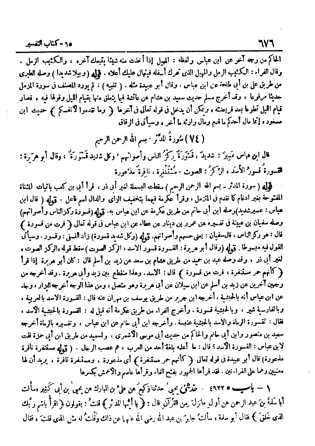 سَقَطَتِ الْبَسْمَلَةُ لِغَيْرِ أَبِي ذَرٍّ قَرَأَ أُبَيُّ بْنُ كَعْبٍ بِإِثْبَاتِ الْمُثَنَّاةِ الْمَفْتُوحَةِ بِغَيْرِ إِدْغَامٍ كَمَا تَقَدَّمَ فِي الْمُتَزَمِّلِ وَقَرَأَ عِكْرِمَةُ فِيهِمَا بِتَخَفِيفِ الزَّايِ وَالدَّالِ اسْمُ فَاعِلٍ قَوْلُهُ قَالَ بن عَبَّاس عسير شَدِيد وَصله بن أبي حَاتِم من طَرِيق عِكْرِمَة عَن بن عَبَّاسٍ بِهِ قَوْلُهُ قَسْوَرَةُ رِكْزُ النَّاسِ وَأَصْوَاتُهُمْ وَصَلَهُ سُفْيَانُ بْنُ عُيَيْنَةَ فِي تَفْسِيرِهِ عَنْ عَمْرِو بْنِ دِينَارٍ عَنْ عَطَاءٍ عَنِ بن عَبَّاسٍ فِي قَوْلِهِ تَعَالَى فَرَّتْ مِنْ قَسْوَرَةٍ قَالَ هُوَ رِكْزُ النَّاسِ قَالَ سُفْيَانُ يَعْنِي حِسَّهُمْ وَأَصْوَاتَهُمْ قَوْلُهُ وَكُلُّ شَدِيدٍ قَسْوَرَةٌ زَادَ النَّسَفِيُّ وَقَسْوَرٌ وَسَيَأْتِي الْقَوْلُ فِيهِ مَبْسُوطًا قَوْلُهُ وَقَالَ أَبُو هُرَيْرَة القسورة قسور الْأسد الركز الصَّوْتُ سَقَطَ قَوْلُهُ الرِّكْزُ الصَّوْتُ لِغَيْرِ أَبِي ذَرٍّ وَقَدْ وَصَلَهُ عَبْدُ بْنُ حُمَيْدٍ مِنْ طَرِيقِ هِشَامِ بْنِ سَعْدٍ عَنْ زَيْدِ بْنِ أَسْلَمَ قَالَ كَانَ أَبُو هُرَيْرَةَ إِذَا قَرَأَ كَأَنَّهُمْ حمر مستنفرة فرت من قسورة قَالَ الْأَسَدُ وَهَذَا مُنْقَطِعٌ بَيْنَ زَيْدٍ وَأَبِي هُرَيْرَةَ وَقَدْ أَخْرَجَهُ مِنْ وَجْهَيْنِ آخَرَيْنِ عَنْ زيد بن أسلم عَن بن سِيلَانَ عَنْ أَبِي هُرَيْرَةَ وَهُوَ مُتَّصِلٌ وَمِنْ هَذَا الْوَجْه أخرجه الْبَزَّار وَجَاء عَن بن عَبَّاس أَنه بالحبشية أخرجه بن جَرِيرٍ مِنْ طَرِيقِ يُوسُفَ بْنِ مِهْرَانَ عَنْهُ قَالَ الْقَسْوَرَةُ الْأَسَدُ بِالْعَرَبِيَّةِ وَبِالْفَارِسِيَّةِ شير وَبِالْحَبَشِيَّةِ قَسْوَرَةٌ وَأَخْرَجَ الْفَرَّاءُ مِنْ طَرِيقِ عِكْرِمَةَ أَنَّهُ قِيلَ لَهُ الْقَسْوَرَةُ بِالْحَبَشِيَّةِ الْأَسَدُ فَقَالَ الْقَسْوَرَةُ الرُّمَاة والأسد بالحبشية عَنْبَسَة وَأخرجه بن أبي حَاتِم عَن بن عَبَّاسٍ وَتَفْسِيرُهُ بِالرُّمَاةِ أَخْرَجَهُ سَعِيدُ بْنُ مَنْصُورٍ وبن أَبِي حَاتِمٍ وَالْحَاكِمُ مِنْ حَدِيثِ أَبِي مُوسَى الْأَشْعَرِيّ ولسعيد من طَرِيق بن أَبِي حَمْزَةَ قُلْتُ لِابْنِ عَبَّاسٍ الْقَسْوَرَةُ الْأَسَدُ قَالَ مَا أَعْلَمُهُ بِلُغَةِ أَحَدٍ مِنَ الْعَرَبِ هُمْ عَصَبُ الرِّجَالِ قَوْلُهُ مُسْتَنْفِرَةٌ نَافِرَةٌ مَذْعُورَةٌ قَالَ أَبُو عُبَيْدَةَ فِي قَوْلِهِ تَعَالَى كَأَنَّهُمْ حمر مستنفرة أَيْ مَذْعُورَةٌ وَمُسْتَنْفِرَةٌ نَافِرَةٌ يُرِيدُ أَنَّ لَهَا مَعْنَيَيْنِ وَهُمَا عَلَى الْقِرَاءَتَيْنِ فَقَدْ قَرَأَهَا الْجُمْهُورُ بِفَتْحِ الْفَاءِ وَقَرَأَهَا عَاصِمٌ وَالْأَعْمَشُ بِكَسْرِهَا قَوْلُهُ