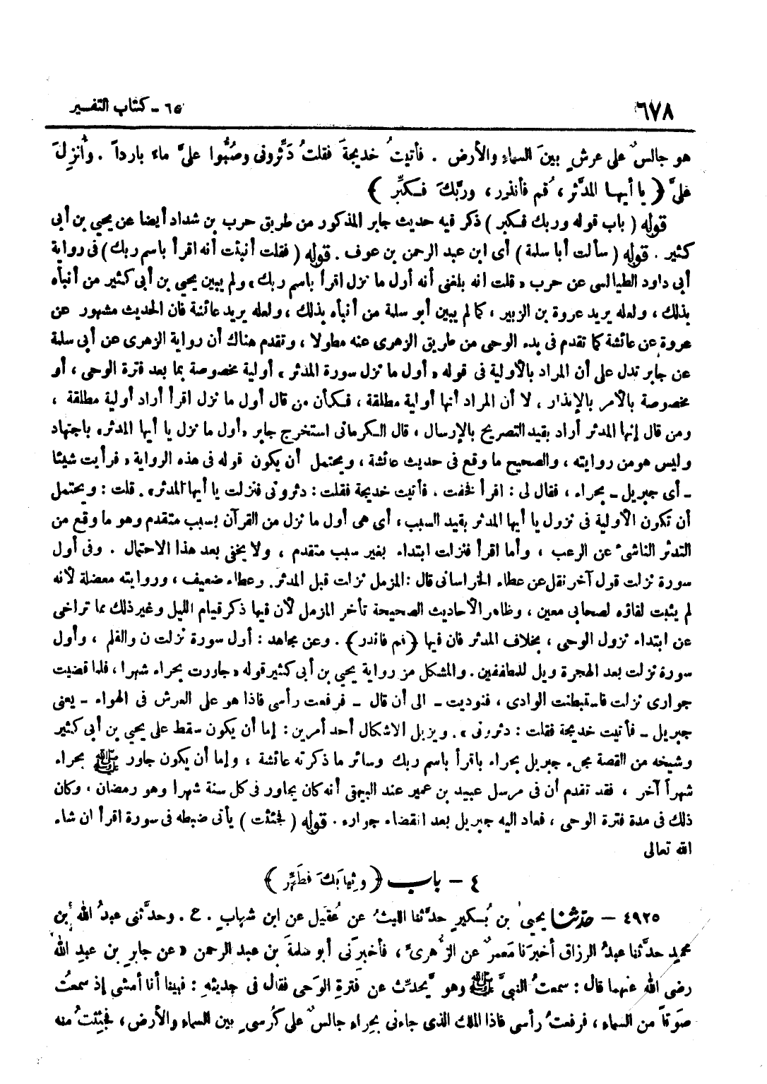 [4924] قَوْلُهُ سَأَلْتُ أَبَا سَلَمَةَ أَيِ بن عَبْدِ الرَّحْمَنِ بْنِ عَوْفٍ قَوْلُهُ فَقُلْتُ أُنْبِئْتُ أَنه قَرَأَ باسم رَبك فِي رِوَايَةِ أَبِي دَاوُدَ الطَّيَالِسِيِّ عَنْ حَرْبٍ قُلْتُ إِنَّهُ بَلَغَنِي أَنَّهُ أَوَّلُ مَا نَزَلَ اقْرَأْ بِاسْمِ رَبِّكَ وَلَمْ يُبَيِّنْ يَحْيَى بْنُ أَبِي كَثِيرٍ مَنْ أَنْبَأَهُ بِذَلِكَ وَلَعَلَّهُ يُرِيدُ عُرْوَةَ بْنَ الزُّبَيْرِ كَمَا لَمْ يُبَيِّنْ أَبُو سَلَمَةَ مَنْ أَنْبَأَهُ بِذَلِكَ وَلَعَلَّهُ يُرِيدُ عَائِشَةَ فَإِنَّ الْحَدِيثَ مَشْهُورٌ عَنْ عُرْوَةَ عَنْ عَائِشَةَ كَمَا تَقَدَّمَ فِي بَدْءِ الْوَحْيِ مِنْ طَرِيقِ الزُّهْرِيِّ عَنْهُ مُطَوَّلًا وَتَقَدَّمَ هُنَاكَ أَنَّ رِوَايَةَ الزُّهْرِيِّ عَنْ أَبِي سَلَمَةَ عَنْ جَابِرٍ تَدُلُّ عَلَى أَنَّ الْمُرَادَ بِالْأَوَّلِيَّةِ فِي قَوْلِهِ أَوَّلُ مَا نَزَلَ سُورَةُ الْمُدَّثِّرِ أَوَّلِيَّةٌ مَخْصُوصَةٌ بِمَا بَعْدَ فَتْرَةِ الْوَحْيِ أَوْ مَخْصُوصَةٌ بِالْأَمْرِ بِالْإِنْذَارِ لَا أَنَّ الْمُرَادَ أَنَّهَا أَوَّلِيَّةٌ مُطْلَقَةٌ فَكَأَنَّ مَنْ قَالَ أَوَّلُ مَا نَزَلَ اقْرَأْ أَرَادَ أَوَّلِيَّةً مُطْلَقَةً وَمَنْ قَالَ إِنَّهَا الْمُدَّثِّرُ أَرَادَ بِقَيْدِ التَّصْرِيحِ بِالْإِرْسَالِ قَالَ الْكِرْمَانِيُّ اسْتَخْرَجَ جَابِرٌ أول مَا نزل يَا أَيهَا المدثر بِاجْتِهَادٍ وَلَيْسَ هُوَ مِنْ رِوَايَتِهِ وَالصَّحِيحُ مَا وَقَعَ فِي حَدِيثِ عَائِشَةَ وَيَحْتَمِلُ أَنْ يَكُونَ قَوْلُهُ فِي هَذِهِ الرِّوَايَةِ فَرَأَيْتُ شَيْئًا أَيْ جِبْرِيلَ بِحِرَاءَ فَقَالَ لِيَ اقْرَأْ فَخِفْتُ فَأَتَيْتُ خَدِيجَةَ فَقُلْتُ دَثِّرُونِي فَنَزَلَتْ يَا أَيُّهَا المدثر قُلْتُ وَيَحْتَمِلُ أَنْ تَكُونَ الْأَوَّلِيَّةُ فِي نزُول يَا أَيهَا المدثر بِقَيْدِ السَّبَبِ أَيْ هِيَ أَوَّلُ مَا نَزَلَ مِنَ الْقُرْآنِ بِسَبَبٍ مُتَقَدِّمٍ وَهُوَ مَا وَقَعَ مِنَ التَّدَثُّرِ النَّاشِئِ عَنِ الرُّعْبِ وَأَمَّا اقْرَأْ فَنَزَلَتِ ابْتِدَاءً بِغَيْرِ سَبَبٍ مُتَقَدِّمٍ وَلَا يَخْفَى بُعْدُ هَذَا الِاحْتِمَالِ وَفِي أَوَّلِ سُورَةٍ نزلت قَول آخر نقل عَن عَطاء الخرساني قَالَ الْمُزَّمِّلُ نَزَلَتْ قَبْلَ الْمُدَّثِّرِ وَعَطَاءٌ ضَعِيفٌ وَرِوَايَتُهُ مُعْضِلَةٌ لِأَنَّهُ لَمْ يَثْبُتْ لِقَاؤُهُ لِصَحَابِيٍّ مُعَيَّنٍ وَظَاهِرُ الْأَحَادِيثِ الصَّحِيحَةِ تَأَخُّرُ الْمُزَّمِّلِ لِأَنَّ فِيهَا ذِكْرُ قِيَامِ اللَّيْلِ وَغَيْرِ ذَلِكَ مِمَّا تَرَاخَى عَنِ ابْتِدَاءِ نُزُولِ الْوَحْيِ بِخِلَافِ الْمُدَّثِّرِ فَإِنَّ فِيهَا قُمْ فَأَنْذِرْ وَعَنْ مُجَاهِدٍ أَوَّلُ سُورَةٍ نَزَلَتْ ن وَالْقَلَمِ وَأَوَّلُ سُورَةٍ نَزَلَتْ بَعْدَ الْهِجْرَةِ وَيْلٌ لِلْمُطَفِّفِينَ وَالْمُشْكِلُ مِنْ رِوَايَةِ يَحْيَى بْنِ أَبِي كَثِيرٍ قَوْلُهُ جَاوَرْتُ بِحِرَاءَ شَهْرًا فَلَمَّا قَضَيْتُ جِوَارِي نَزَلْتُ فَاسْتَبْطَنْتُ الْوَادِيَ فَنُودِيتُ إِلَى أَنْ قَالَ فَرَفَعْتُ رَأْسِيَ فَإِذَا هُوَ عَلَى الْعَرْشِ فِي الْهَوَاءِ يَعْنِي جِبْرِيلَ فَأَتَيْتُ خَدِيجَةَ فَقُلْتُ دَثِّرُونِي وَيُزِيلُ الْإِشْكَالَ أَحَدُ أَمْرَيْنِ إِمَّا أَنْ يَكُونَ سَقَطَ عَلَى يَحْيَى بْنِ أَبِي كَثِيرٍ وَشَيْخِهِ مِنَ الْقِصَّةِ مَجِيءُ جِبْرِيلَ بِحِرَاءَ بِاقْرَأْ بِاسْمِ رَبِّكَ وَسَائِرُ مَا ذَكَرَتْهُ عَائِشَةُ وَإِمَّا أَنْ يَكُونَ جَاوَرَ صَلَّى اللَّهُ عَلَيْهِ وَسَلَّمَ بِحِرَاءَ شَهْرًا آخَرَ فَقَدْ تَقَدَّمَ أَنَّ فِي مُرْسَلِ عُبَيْدِ بْنِ عُمَيْرٍ عِنْدَ الْبَيْهَقِيِّ أَنَّهُ كَانَ يُجَاوِرُ فِي كُلِّ سَنَةٍ شَهْرًا وَهُوَ رَمَضَانُ وَكَانَ ذَلِكَ فِي مُدَّةِ فَتْرَةِ الْوَحْيِ فَعَادَ إِلَيْهِ جِبْر