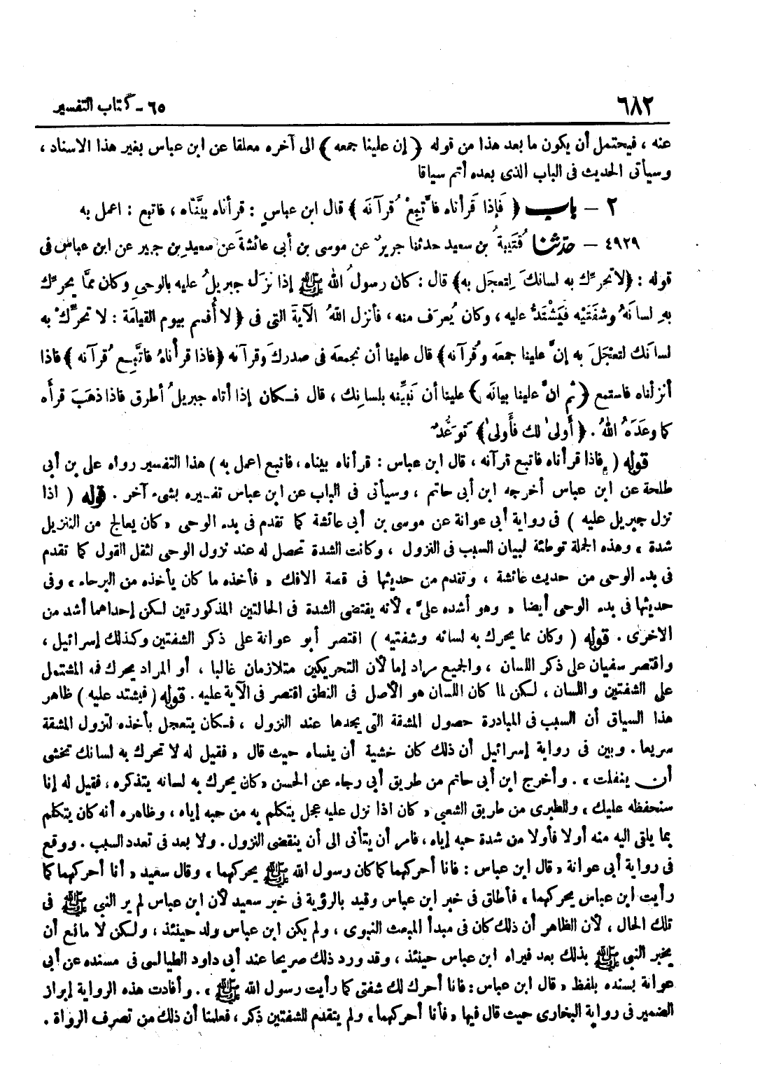 [4929] قَوْلُهُ إِذَا نَزَلَ جِبْرِيلُ عَلَيْهِ فِي رِوَايَةِ أَبِي عَوَانَةَ عَنْ مُوسَى بْنِ أَبِي عَائِشَةَ كَمَا تَقَدَّمَ فِي بَدْءِ الْوَحْيِ كَانَ يُعَالِجُ مِنَ التَّنْزِيلِ شِدَّةً وَهَذِهِ الْجُمْلَةُ تَوْطِئَةٌ لِبَيَانِ السَّبَبِ فِي النُّزُولِ وَكَانَتِ الشِّدَّةُ تَحْصُلُ لَهُ عِنْدَ نُزُولِ الْوَحْيِ لِثِقَلِ الْقَوْلِ كَمَا تَقَدَّمَ فِي بَدْءِ الْوَحْيِ مِنْ حَدِيثِ عَائِشَةَ وَتَقَدَّمَ مِنْ حَدِيثِهَا فِي قِصَّةِ الْإِفْكِ فَأَخَذَهُ مَا كَانَ يَأْخُذُهُ مِنَ الْبُرَحَاءِ وَفِي حَدِيثِهَا فِي بَدْءِ الْوَحْيِ أَيْضًا وَهُوَ أَشَدُّهُ عَلَيَّ لِأَنَّهُ يَقْتَضِي الشِّدَّةَ فِي الْحَالَتَيْنِ الْمَذْكُورَتَيْنِ لَكِنَّ إِحْدَاهُمَا أَشَدُّ مِنَ الْأُخْرَى قَوْلُهُ وَكَانَ مِمَّا يُحَرِّكُ بِهِ لِسَانَهُ وَشَفَتَيْهِ اقْتَصَرَ أَبُو عَوَانَةَ عَلَى ذِكْرِ الشَّفَتَيْنِ وَكَذَلِكَ إِسْرَائِيلُ وَاقْتَصَرَ سُفْيَانُ عَلَى ذِكْرِ اللِّسَانِ وَالْجَمِيعُ مُرَادٌ إِمَّا لِأَنَّ التَّحْرِيكَيْنِ مُتَلَازِمَانِ غَالِبًا أَوِ الْمُرَادُ يُحَرِّكُ فَمَهُ الْمُشْتَمِلَ عَلَى الشَّفَتَيْنِ وَاللِّسَانِ لَكِنْ لَمَّا كَانَ اللِّسَانُ هُوَ الْأَصْلُ فِي النُّطْقِ اقْتَصَرَ فِي الْآيَةِ عَلَيْهِ قَوْلُهُ فَيَشْتَدُّ عَلَيْهِ ظَاهِرُ هَذَا السِّيَاقِ أَنَّ السَّبَبَ فِي الْمُبَادَرَةِ حُصُولُ الْمَشَقَّةِ الَّتِي يَجِدُهَا عِنْدَ النُّزُولِ فَكَانَ يَتَعَجَّلُ بِأَخْذِهِ لِتَزُولَ الْمَشَقَّةُ سَرِيعًا وَبَيَّنَ فِي رِوَايَةِ إِسْرَائِيلَ أَنَّ ذَلِكَ كَانَ خَشْيَةَ أَنْ يَنْسَاهُ حَيْثُ قَالَ فَقِيلَ لَهُ لَا تحرّك بِهِ لسَانك تخشي أَن ينفلت وَأخرج بن أَبِي حَاتِمٍ مِنْ طَرِيقِ أَبِي رَجَاءٍ عَنِ الْحَسَنِ كَانَ يُحَرِّكْ بِهِ لِسَانَهُ يَتَذَكَّرُهُ فَقِيلَ لَهُ إِنَّا سَنَحْفَظُهُ عَلَيْكَ وَلِلطَّبَرِيِّ مِنْ طَرِيقِ الشَّعْبِيِّ كَانَ إِذَا نَزَلَ عَلَيْهِ عَجَّلَ يَتَكَلَّمُ بِهِ مِنْ حُبِّهِ إِيَّاهُ وَظَاهِرُهُ أَنَّهُ كَانَ يَتَكَلَّمُ بِمَا يُلْقَى إِلَيْهِ مِنْهُ أَوَّلًا فَأَوَّلًا مِنْ شِدَّةِ حُبِّهِ إِيَّاهُ فَأُمِرَ أَنْ يَتَأَنَّى إِلَى أَنْ يَنْقَضِيَ النُّزُولُ وَلَا بُعْدَ فِي تَعَدُّدِ السَّبَبِ وَوَقَعَ فِي رِوَايَةِ أَبِي عَوَانَةَ قَالَ بن عَبَّاسٍ فَأَنَا أُحَرِّكُهُمَا كَمَا كَانَ رَسُولُ اللَّهِ صَلَّى اللَّهُ عَلَيْهِ وَسَلَّمَ يُحَرِّكُهُمَا وَقَالَ سَعِيدٌ أَنا أحركهما كَمَا رَأَيْت بن عَبَّاس يحركهما فَأطلق فِي خبر بن عَبَّاسٍ وَقُيِّدَ بِالرُّؤْيَةِ فِي خَبَرِ سَعِيدٍ لِأَنَّ بن عَبَّاسٍ لَمْ يَرَ النَّبِيَّ صَلَّى اللَّهُ عَلَيْهِ وَسَلَّمَ فِي تِلْكَ الْحَالِ لِأَنَّ الظَّاهِرَ أَنَّ ذَلِكَ كَانَ فِي مَبْدَأِ الْمَبْعَثِ النَّبَوِيِّ وَلَمْ يكن بن عَبَّاسٍ وُلِدَ حِينَئِذٍ وَلَكِنْ لَا مَانِعَ أَنْ يُخْبِرَ النَّبِيَّ صَلَّى اللَّهُ عَلَيْهِ وَسَلَّمَ بِذَلِكَ بعد فيراه بن عَبَّاسٍ حِينَئِذٍ وَقَدْ وَرَدَ ذَلِكَ صَرِيحًا عِنْدَ أَبِي دَاوُدَ الطَّيَالِسِيُّ فِي مُسْنَدِهِ عَنْ أَبِي عَوَانَةَ بِسَنَدِهِ بِلَفْظ قَالَ بن عَبَّاسٍ فَأَنَا أُحَرِّكُ لَكَ شَفَتَيَّ كَمَا رَأَيْتُ رَسُولَ اللَّهِ صَلَّى اللَّهُ عَلَيْهِ وَسَلَّمَ وَأَفَادَتْ هَذِهِ الرِّوَايَةُ إِبْرَازَ الضَّمِيرِ فِي رِوَايَةِ الْبُخَارِيِّ حَيْثُ قَالَ فِيهَا فَأَنَا أُحَرِّكُهُمَا وَلَمْ يَتَقَدَّمْ لِلشَّفَتَيْنِ ذِكْرٌ فَعَلِمْنَا أَنَّ ذَلِكَ مِنْ تَصَرُّفِ الروَاة