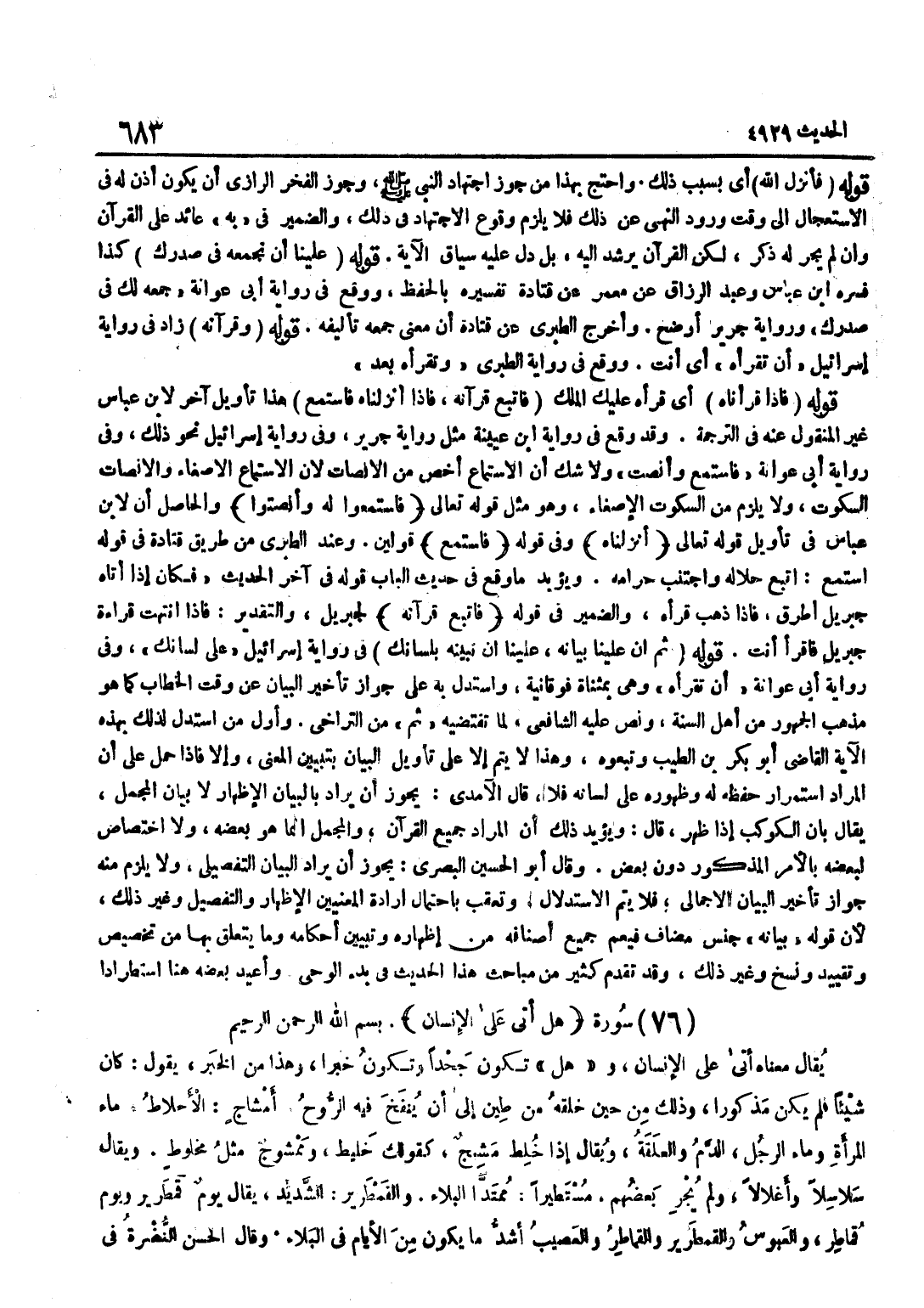 قَوْلُهُ فَأَنْزَلَ اللَّهُ أَيْ بِسَبَبِ ذَلِكَ وَاحْتَجَّ بِهَذَا مَنْ جَوَّزَ اجْتِهَادَ النَّبِيِّ صَلَّى اللَّهُ عَلَيْهِ وَسَلَّمَ وَجَوَّزَ الْفَخْرُ الرَّازِيُّ أَنْ يَكُونَ أُذِنَ لَهُ فِي الِاسْتِعْجَالِ إِلَى وَقْتِ وُرُودِ النَّهْيِ عَنْ ذَلِكَ فَلَا يَلْزَمُ وُقُوعُ الِاجْتِهَادِ فِي ذَلِكَ وَالضَّمِيرُ فِي بِهِ عَائِدٌ عَلَى الْقُرْآنِ وَإِنْ لَمْ يَجْرِ لَهُ ذِكْرٌ لَكِنَّ الْقُرْآنَ يُرْشِدُ إِلَيْهِ بَلْ دَلَّ عَلَيْهِ سِيَاقُ الْآيَةِ قَوْلُهُ عَلَيْنَا أَنْ نَجْمَعَهُ فِي صَدْرِكَ كَذَا فَسَّرَهُ ابْنُ عَبَّاسٍ وَعَبْدُ الرَّزَّاقِ عَنْ مَعْمَرٍ عَنْ قَتَادَةَ تَفْسِيرُهُ بِالْحِفْظِ وَوَقَعَ فِي رِوَايَةِ أَبِي عَوَانَةَ جَمْعُهُ لَكَ فِي صَدْرِكِ وَرِوَايَةُ جَرِيرٍ أَوْضَحُ وَأَخْرَجَ الطَّبَرِيُّ عَنْ قَتَادَةَ أَنَّ مَعْنَى جَمْعَهُ تَأْلِيفَهُ قَوْلُهُ وَقُرْآنَهُ زَادَ فِي رِوَايَةِ إِسْرَائِيلَ أَنْ تَقْرَأَهُ أَيْ أَنْتَ وَوَقَعَ فِي رِوَايَةِ الطَّبَرِيِّ وَتَقْرَأَهُ بَعْدُ قَوْلُهُ فَإِذا قرأناه أَي قَرَأَهُ عَلَيْك الْملك فَاتبع قرآنه فَإِذَا أَنْزَلْنَاهُ فَاسْتَمِعْ هَذَا تَأْوِيلٌ آخَرُ لِابْنِ عَبَّاسٍ غَيْرُ الْمَنْقُولِ عَنْهُ فِي التَّرْجَمَةِ وَقَدْ وَقع فِي رِوَايَة بن عُيَيْنَةَ مِثْلُ رِوَايَةِ جَرِيرٍ وَفِي رِوَايَةِ إِسْرَائِيلَ نَحْوَ ذَلِكَ وَفِي رِوَايَةِ أَبِي عَوَانَةَ فَاسْتَمِعْ وَأَنْصِتْ وَلَا شَكَّ أَنَّ الِاسْتِمَاعَ أَخَصُّ مِنَ الْإِنْصَاتِ لِأَنَّ الِاسْتِمَاعَ الْإِصْغَاءُ وَالْإِنْصَاتُ السُّكُوتُ وَلَا يَلْزَمُ مِنَ السُّكُوتِ الْإِصْغَاءُ وَهُوَ مِثْلُ قَوْلِهِ تَعَالَى فَاسْتَمعُوا لَهُ وأنصتوا وَالْحَاصِلُ أَنَّ لِابْنِ عَبَّاسٍ فِي تَأْوِيلِ قَوْلِهِ تَعَالَى أَنْزَلْنَاهُ وَفِي قَوْلِهِ فَاسْتَمِعْ قَوْلَيْنِ وَعِنْدَ الطَّبَرِيِّ مِنْ طَرِيقِ قَتَادَةَ فِي قَوْلِهِ اسْتَمِعْ أتبع حَلَاله واجتنب حرَامه وَيُؤَيِّدهُ مَا وَقَعَ فِي حَدِيثِ الْبَابِ قَوْلُهُ فِي آخِرِ الْحَدِيثِ فَكَانَ إِذَا أَتَاهُ جِبْرِيلُ أَطْرَقَ فَإِذَا ذَهَبَ قَرَأَهُ وَالضَّمِيرُ فِي قَوْلِهِ فَاتَّبِعْ قرآنه لِجِبْرِيلَ وَالتَّقْدِيرُ فَإِذَا انْتَهَتْ قِرَاءَةُ جِبْرِيلَ فَاقْرَأْ أَنْت قَوْله ثمَّ إِن علينا بَيَانه عَلَيْنَا أَنْ نُبَيِّنَهُ بِلِسَانِكَ فِي رِوَايَةِ إِسْرَائِيلَ عَلَى لِسَانِكَ وَفِي رِوَايَةِ أَبِي عَوَانَةَ أَنْ تَقْرَأَهُ وَهِيَ بِمُثَنَّاةٍ فَوْقَانِيَّةٍ وَاسْتُدِلَّ بِهِ عَلَى جَوَازِ تَأْخِيرِ الْبَيَانِ عَنْ وَقْتِ الْخِطَابِ كَمَا هُوَ مَذْهَبُ الْجُمْهُورِ مِنْ أَهْلِ السُّنَّةِ وَنَصَّ عَلَيْهِ الشَّافِعِيُّ لِمَا تَقْتَضِيهِ ثُمَّ مِنَ التَّرَاخِي وَأَوَّلُ مَنِ اسْتَدَلَّ لِذَلِكَ بِهَذِهِ الْآيَةِ الْقَاضِي أَبُو بَكْرِ بْنُ الطَّيِّبِ وَتَبِعُوهُ وَهَذَا لَا يَتِمُّ إِلَّا عَلَى تَأْوِيلِ الْبَيَانِ بِتَبْيِينِ الْمَعْنَى وَإِلَّا فَإِذَا حُمِلَ عَلَى أَنَّ الْمُرَادَ اسْتِمْرَارُ حِفْظِهِ لَهُ وَظُهُورِهِ عَلَى لِسَانِهِ فَلَا قَالَ الْآمِدِيُّ يَجُوزُ أَنْ يُرَادَ بِالْبَيَانِ الْإِظْهَارُ لَا بَيَانُ الْمُجْمَلِ يُقَالُ بَانَ الْكَوْكَبُ إِذَا ظَهَرَ قَالَ وَيُؤَيِّدُ ذَلِكَ أَنَّ الْمُرَادَ جَمِيعُ الْقُرْآنِ وَالْمُجْمَلُ إِنَّمَا هُوَ بَعْضُهُ وَلَا اخْتِصَاصَ لِبَعْضِهِ بِالْأَمْرِ الْمَذْكُورِ دُونَ بَعْضٍ وَقَالَ أَبُو الْحُسَيْنِ الْبَصْرِيُّ يَجُوزُ أَنْ يُرَادَ الْبَيَانُ التَّفْصِيلِيُّ وَلَا يَلْزَمُ مِنْهُ جَوَازُ تَأْخِيرِ الْبَيَانِ الْإِجْمَالِيِّ فَلَا يَتِمُّ الِاسْتِدْلَالُ وَتُعُقِّبَ بِاحْتِمَالِ إِرَادَةِ الْمَعْنَيَيْنِ الْإِظْهَ