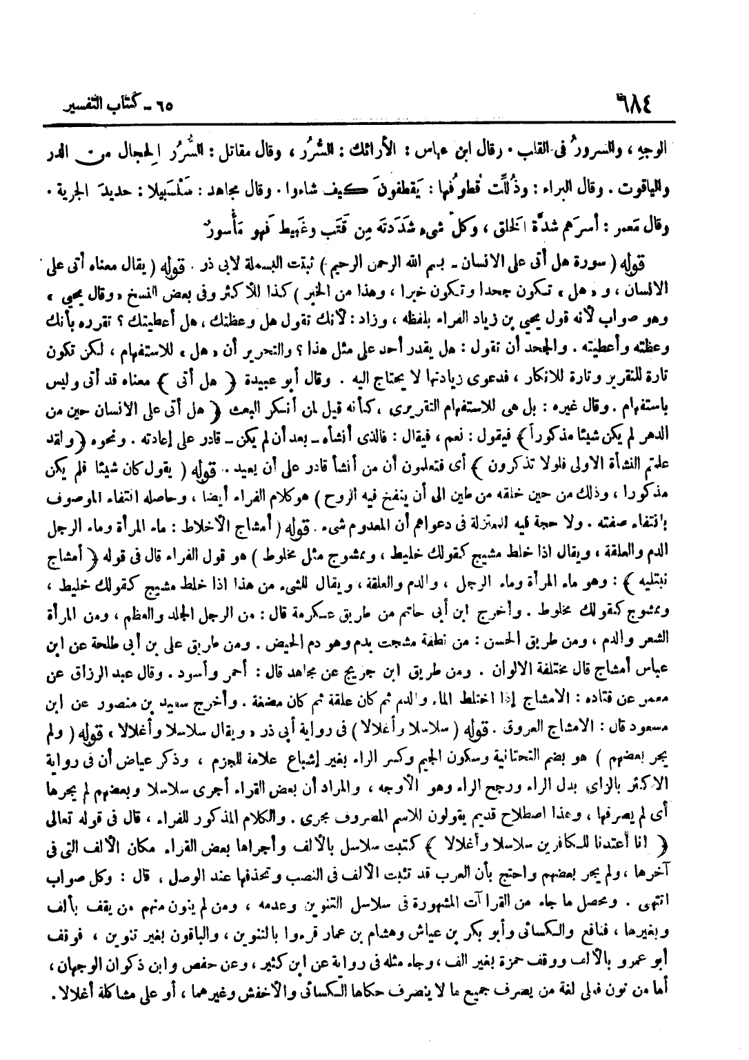 ثَبَتَتِ الْبَسْمَلَةُ لِأَبِي ذَرٍّ قَوْله يُقَالُ مَعْنَاهُ أَتَى عَلَى الْإِنْسَانِ وَهَلْ تَكُونُ جَحْدًا وَتَكُونُ خَبَرًا وَهَذَا مِنَ الْخَبَرِ كَذَا لِلْأَكْثَرِ وَفِي بَعْضِ النُّسَخِ وَقَالَ يَحْيَى وَهُوَ صَوَابٌ لِأَنَّهُ قَوْلُ يَحْيَى بْنِ زِيَادٍ الْفَرَّاءِ بِلَفْظِهِ وَزَادَ لِأَنَّكَ تَقُولُ هَلْ وَعَظْتُكَ هَلْ أَعْطَيْتُكَ تُقَرِّرُهُ بِأَنَّكَ وَعَظْتَهُ وَأَعْطَيْتَهُ وَالْجَحْدُ أَنْ تَقُولَ هَلْ يَقْدِرُ أَحَدٌ عَلَى مِثْلِ هَذَا وَالتَّحْرِيرُ أَنَّ هَلْ لِلِاسْتِفْهَامِ لَكِنْ تَكُونُ تَارَةً لِلتَّقْرِيرِ وَتَارَةً لِلْإِنْكَارِ فَدَعْوَى زِيَادَتِهَا لَا يُحْتَاجُ إِلَيْهِ وَقَالَ أَبُو عُبَيْدَة هَل أَتَى مَعْنَاهُ قَدْ أَتَى وَلَيْسَ بِاسْتِفْهَامٍ وَقَالَ غَيْرُهُ بَلْ هِيَ لِلِاسْتِفْهَامِ التَّقْرِيرِيِّ كَأَنَّهُ قِيلَ لِمَنْ أَنْكَرَ الْبَعْثَ هَلْ أَتَى عَلَى الْإِنْسَانِ حِينٌ مِنَ الدَّهْرِ لم يكن شَيْئا مَذْكُورا فَيَقُولُ نَعَمْ فَيُقَالُ فَالَّذِي أَنْشَأَهُ بَعْدَ أَنْ لَمْ يَكُنْ قَادِرٌ عَلَى إِعَادَتِهِ وَنَحْوُهُ وَلَقَدْ علمْتُم النشأة الأولى فلولا تذكرُونَ أَيْ فَتَعْلَمُونَ أَنَّ مَنْ أَنْشَأَ قَادِرٌ عَلَى أَنْ يُعِيدَ قَوْلُهُ يَقُولُ كَانَ شَيْئًا فَلَمْ يكن مَذْكُورا وَذَلِكَ من حِين خلقه من طِينٍ إِلَى أَنْ يُنْفَخَ فِيهِ الرُّوحُ هُوَ كَلَامُ الْفَرَّاءِ أَيْضًا وَحَاصِلُهُ انْتِفَاءُ الْمَوْصُوفِ بِانْتِفَاءِ صِفَتِهِ وَلَا حُجَّةَ فِيهِ لِلْمُعْتَزِلَةِ فِي دَعْوَاهُمْ أَنَّ الْمَعْدُومَ شَيْءٌ قَوْلُهُ أَمْشَاجٍ الْأَخْلَاطُ مَاءُ الْمَرْأَةِ وَمَاءُ الرَّجُلِ الدَّمُ وَالْعَلَقَةُ وَيُقَالُ إِذَا خُلِطَ مَشِيجٌ كَقَوْلِكَ خَلِيطٌ وَمَمْشُوجٌ مِثْلُ مَخْلُوطٍ هُوَ قَوْلُ الْفَرَّاءِ قَالَ فِي قَوْلِهِ أَمْشَاجٍ نبتليه وَهُوَ مَاءُ الْمَرْأَةِ وَمَاءُ الرَّجُلِ وَالدَّمُ وَالْعَلَقَةُ وَيُقَالُ لِلشَّيْءِ مِنْ هَذَا إِذَا خُلِطَ مَشِيجٌ كَقَوْلِك خليط وممشوج كَقَوْلِك مخلوط وَأخرج بن أَبِي حَاتِمٍ مِنْ طَرِيقِ عِكْرِمَةَ قَالَ مِنَ الرَّجُلِ الْجِلْدُ وَالْعَظْمُ وَمِنَ الْمَرْأَةِ الشَّعْرُ وَالدَّمُ وَمِنْ طَرِيقِ الْحَسَنِ مِنْ نُطْفَةٍ مُشِجَتْ بِدَمٍ وَهُوَ دَمُ الْحَيْضِ وَمِنْ طَرِيقِ عَلِيِّ بْنِ أَبِي طَلْحَةَ عَنِ بن عَبَّاسٍ أَمْشَاجٍ قَالَ مُخْتَلِفَةِ الْأَلْوَانِ وَمِنْ طَرِيقِ بن جُرَيْجٍ عَنْ مُجَاهِدٍ قَالَ أَحْمَرُ وَأَسْوَدُ وَقَالَ عَبْدُ الرَّزَّاقِ عَنْ مَعْمَرٍ عَنْ قَتَادَةَ الْأَمْشَاجُ إِذَا اخْتَلَطَ الْمَاءُ وَالدَّمُ ثُمَّ كَانَ عَلَقَةً ثُمَّ كَانَ مُضْغَةً وَأَخْرَجَ سَعِيدُ بْنُ مَنْصُورٍ عَن بن مَسْعُودٍ قَالَ الْأَمْشَاجُ الْعُرُوقُ قَوْلُهُ سَلَاسِلَا وَأَغْلَالًا فِي رِوَايَةِ أَبِي ذَرٍّ وَيُقَالُ سَلَاسِلًا وَأَغْلَالًا قَوْلُهُ وَلَمْ يُجْرِ بَعْضُهُمْ هُوَ بِضَمِّ التَّحْتَانِيَّةِ وَسُكُونِ الْجِيمِ وَكَسْرِ الرَّاءِ بِغَيْرِ إِشْبَاعٍ عَلَامَةً لِلْجَزْمِ وَذَكَرَ عِيَاضٌ أَنَّ فِي رِوَايَةِ الْأَكْثَرِ بِالزَّايِ بَدَلَ الرَّاءِ وَرَجَّحَ الرَّاءَ وَهُوَ الْأَوْجَهُ وَالْمُرَادُ أَنَّ بَعْضَ الْقُرَّاءِ أَجْرَى سَلَاسِلًا وَبَعْضُهُمْ لَمْ يُجْرِهَا أَيْ لَمْ يَصْرِفْهَا وَهَذَا اصْطِلَاحٌ قَدِيمٌ يَقُولُونَ لِلِاسْمِ الْمَصْرُوفِ مُجْرًى وَالْكَلَامُ الْمَذْكُورُ لِلْفَرَّاءِ قَالَ فِي قَوْلِهِ تَعَالَى إِنَّا أَعْتَدْنَا للْكَافِرِينَ سلاسلا وأغلالا كُتِبَتْ سَلَاسِلَ بِالْأَلِفِ وَأَجْرَاهَا بَعْضُ الْقُرَّاءِ مَكَانَ الْأَلِفِ الَّتِي فِي آخِرِهَا وَلَمْ يُجْرِ بَعْضُهُمْ وَاحْتج بَان الْعَرَب قد تئبت الْأَلِفَ فِي النَّصْبِ وَت