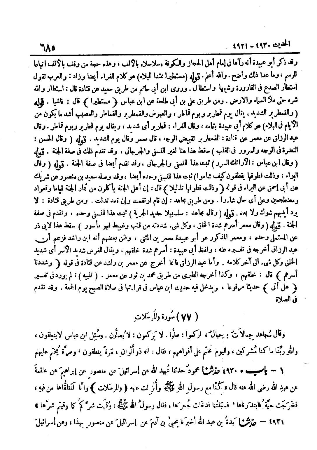 وَقَدْ ذَكَرَ أَبُو عُبَيْدَةَ أَنَّهُ رَآهَا فِي إِمَامِ أَهْلِ الْحِجَازِ وَالْكُوفَةِ سَلَاسِلَا بِالْأَلِفِ وَهَذِهِ حُجَّةُ مَنْ وَقَفَ بِالْأَلِفِ إِتْبَاعًا لِلرَّسْمِ وَمَا عَدَا ذَلِكَ وَاضِحٌ وَاللَّهُ أَعْلَمُ قَوْلُهُ مُسْتَطِيرًا مُمْتَدًّا الْبَلَاءَ هُوَ كَلَامُ الْفَرَّاءِ أَيْضًا وَزَادَ وَالْعَرَبُ تَقُولُ اسْتَطَارَ الصَّدْعُ فِي الْقَارُورَةِ وَشِبْهِهَا واستطال وروى بن أَبِي حَاتِمٍ مِنْ طَرِيقِ سَعِيدٍ عَنْ قَتَادَةَ قَالَ اسْتَطَارَ وَاللَّهِ شَرُّهُ حَتَّى مَلَأَ السَّمَاءَ وَالْأَرْضَ وَمِنْ طَرِيقِ عَلِيِّ بْنِ أَبِي طَلْحَةَ عَنِ بن عَبَّاسٍ مُسْتَطِيرًا قَالَ فَاشِيًا قَوْلُهُ وَالْقَمْطَرِيرُ الشَّدِيدُ يُقَال يَوْم قمطرير وَيَوْم قماطر والعبوس والقمطرير والقماطر والعصيب أَشد مَا يكون من الْأَيَّام فِي الْبَلَاءِ هُوَ كَلَامُ أَبِي عُبَيْدَةَ بِتَمَامِهِ وَقَالَ الْفَرَّاءُ قَمْطَرِيرٌ أَيْ شَدِيدٌ وَيُقَالُ يَوْمٌ قَمْطَرِيرٌ وَيَوْمٌ قُمَاطِرٌ وَقَالَ عَبْدُ الرَّزَّاقِ عَنْ مَعْمَرٍ عَنْ قَتَادَةَ الْقَمْطَرِيرُ تَقْبِيضُ الْوَجْهِ قَالَ معمر وَقَالَ يَوْم الشَّدِيدُ قَوْلُهُ وَقَالَ الْحَسْنُ النَّضْرَةُ فِي الْوَجْهِ وَالسُّرُورُ فِي الْقَلْبِ سَقَطَ هَذَا هُنَا لِغَيْرِ النَّسَفِيِّ وَالْجُرْجَانِيِّ وَقَدْ تَقَدَّمَ ذَلِكَ فِي صِفَةِ الْجنَّة قَوْله وَقَالَ بن عَبَّاسٍ الْأَرَائِكُ السُّرُرُ ثَبَتَ هَذَا لِلنَّسَفِيِّ وَالْجُرْجَانِيِّ وَقَدْ تَقَدَّمَ أَيْضًا فِي صِفَةِ الْجَنَّةِ قَوْلُهُ وَقَالَ الْبَرَاءُ وَذُلِّلَتْ قُطُوفُهَا يَقْطِفُونَ كَيْفَ شَاءُوا ثَبَتَ هَذَا لِلنَّسَفِيِّ وَحْدَهُ أَيْضًا وَقَدْ وَصَلَهُ سَعِيدُ بْنُ مَنْصُورٍ عَنْ شَرِيكٍ عَنْ أَبِي إِسْحَاقَ عَنِ الْبَرَاءِ فِي قَوْلِهِ وَذُلِّلَتْ قُطُوفُهَا تذليلا قَالَ إِنَّ أَهْلَ الْجَنَّةِ يَأْكُلُونَ مِنْ ثِمَارِ الْجَنَّةِ قِيَامًا وَقُعُودًا وَمُضْطَجِعِينَ وَعَلَى أَيِّ حَالٍ شَاءُوا وَمِنْ طَرِيقِ مُجَاهِدٍ إِنْ قَامَ ارْتَفَعَتْ وَإِنْ قَعَدَ تَدَلَّتْ وَمِنْ طَرِيقِ قَتَادَةَ لَا يَرُدُّ أَيْدِيَهُمْ شَوْكٌ وَلَا بُعْدٌ قَوْلُهُ وَقَالَ مُجَاهِدٌ سَلْسَبِيلَا حَدِيدُ الْجِرْيَةِ ثَبَتَ هَذَا لِلنَّسَفِيِّ وَحْدَهُ وَتَقَدَّمَ فِي صِفَةِ الْجَنَّةِ قَوْلُهُ وَقَالَ مَعْمَرٌ أَسْرَهُمْ شِدَّةُ الْخَلْقِ وَكُلُّ شَيْءٍ شَدَدْتَهُ مِنْ قَتَبٍ وَغَبِيطٍ فَهُوَ مَأْسُورٌ سَقَطَ هَذَا لِأَبِي ذَرٍّ عَنِ الْمُسْتَمْلِيِّ وَحْدَهُ وَمَعْمَرٌ الْمَذْكُورُ هُوَ أَبُو عُبَيْدَةَ مَعْمَرُ بْنُ الْمُثَنَّى وَظَنَّ بَعضهم أَنه بن رَاشِدٍ فَزُعِمَ أَنَّ عَبْدَ الرَّزَّاقِ أَخْرَجَهُ فِي تَفْسِيرِهِ عَنْهُ وَلَفْظُ أَبِي عُبَيْدَةَ أَسْرَهُمْ شِدَّةُ خَلْقِهِمْ وَيُقَالُ لِلْفَرَسِ شَدِيدُ الْأَسْرِ أَيْ شَدِيدُ الْخَلْقِ وَكُلُّ شَيْءٍ إِلَى آخِرِ كَلَامِهِ وَأَمَّا عَبْدُ الرَّزَّاقِ فَإِنَّمَا أَخْرَجَ عَنْ مَعْمَرِ بْنِ رَاشِدٍ عَنْ قَتَادَةَ فِي قَوْلِهِ وَشَدَدْنَا أَسْرَهُمْ قَالَ خَلْقَهُمْ وَكَذَا أَخْرَجَهُ الطَّبَرِيُّ مِنْ طَرِيقِ مُحَمَّدِ بْنِ ثَوْرٍ عَنْ مَعْمَرٍ تَنْبِيهٌ لَمْ يُورِدْ فِي تَفْسِيرِ هَلْ أَتَى حَدِيثًا مَرْفُوعًا وَيدخل فِيهِ حَدِيث بن عَبَّاسٍ فِي قِرَاءَتِهَا فِي صَلَاةِ الصُّبْحِ يَوْمَ الْجُمُعَة وَقد تقدم فِي الصَّلَاة