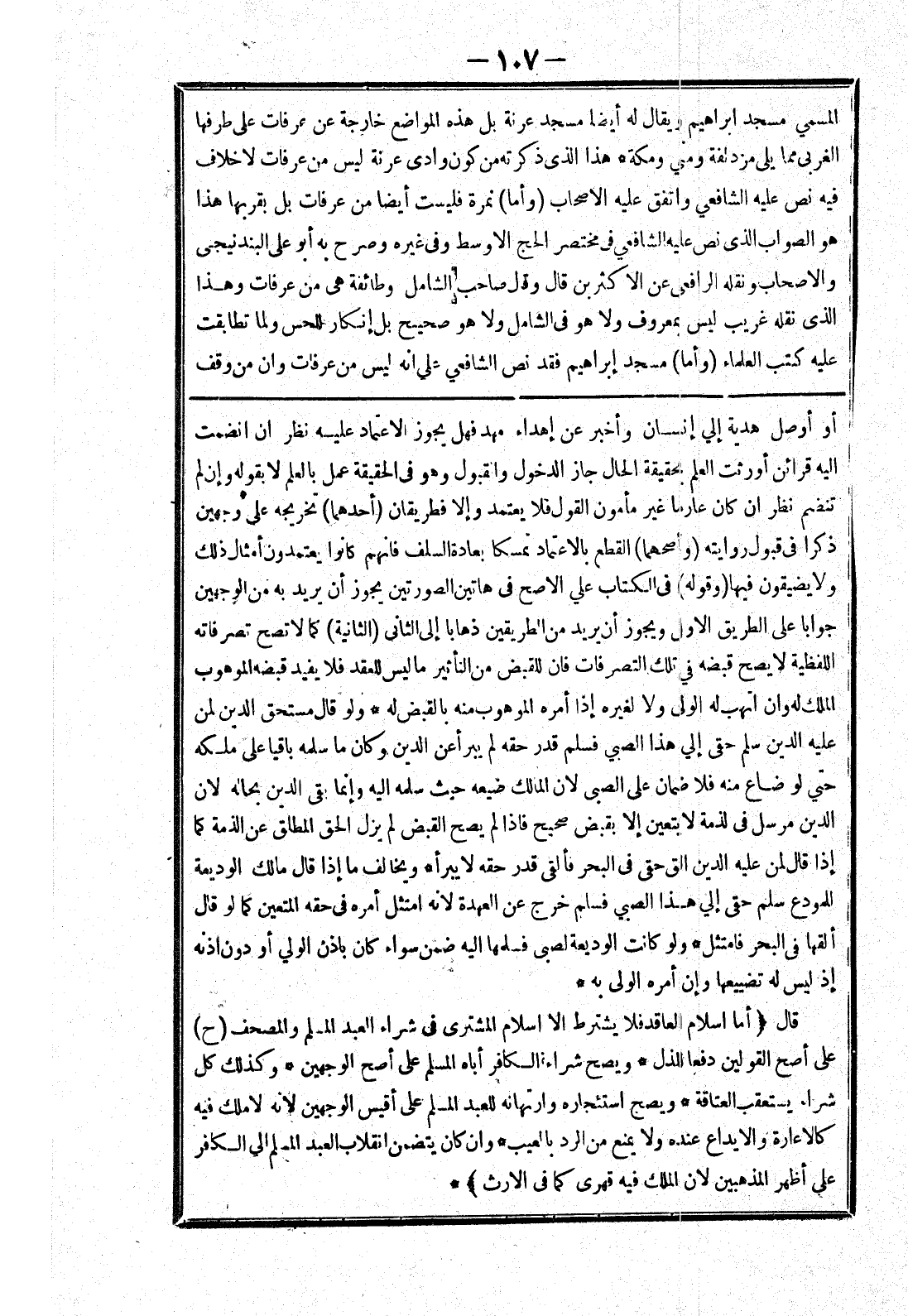 إذا قال لمن عليه الدين الق حقى في البحر فألقى قدر حقه لا يبرأ * ويخالف ما إذا قال مالك الوديعة للمودع سلم حقى إلي هذا الصبي فسلم خرج عن العهدة لانه امتثل أمره في حقه المتعين كما لو قال ألقها في البحر فامتثل * ولو كانت الوديعة لصبى فسلمها إليه ضمن سواء كان باذن الولي أو دون اذنه إذ ليس له تضييعها وإن أمره الولى به * قال (أما اسلام العاقد فلا يشترط الا اسلام المشترى في شراء العبد المسلم والمصحف (ح) على أصح القولين دفعا للذل * ويصح شراء الكافر أباه المسلم على أصح الوجهين * وكذلك كل شراء يستعقب العتاقة * ويصح استئجاره وارتهانه للعبد المسلم على أقيس الوجهين لانه لا ملك فيه كالاعارة والايداع عنده ولا يمنع من الرد بالعيب * وان كان يتضمن انقلاب العبد المسلم الي الكافر على أظهر المذهبين لان الملك فيه قهرى كما في الارث) *