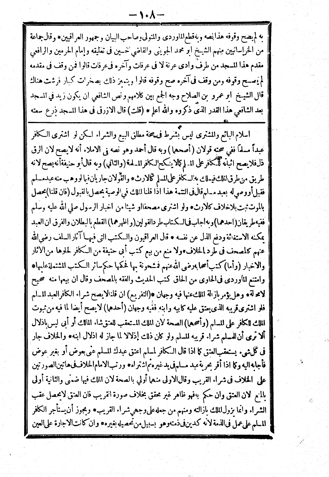اسلام البائع والمشترى ليس بشرط في صحة المطلق البيع والشراء لكن لو اشترى الكافر عبدا مسلما ففي صحته قولان (أصحهما) وبه قال أحمد وهو نصه في الاملاء أنه لا يصح لان الرق ذل فلا يصح اثباته للكافر على المسلم كما لا ينكح الكافر المسلمة (والثاني) وبه قال أبو حنيفة أنه يصح لانه طريق من طرق الملك فيملك به الكافر على المسلم كالارث * والقولان جاريان فيما لو وهب منه عبد مسلم فقيل أو وصي له بعبد مسلم قال في التتمة هذا إذا قلنا الملك في الوصية يحصل بالقبول (فان قلنا) يحصل بالموت ثبت بلا خلاف كالارث * ولو اشترى مصحفا أو شيئا من اخبار الرسول صلي الله عليه وسلم ففيه طريقان (احدهما) وبه اجاب في الكتاب طرد القولين (واظهرهما) القطع بالبطلان والفرق ان العبد يمكنه الاستغاثة ودفع الذل عن نفسه * قال العراقيون والكتب التى فيها آثار السلف رضي الله عنهم كالمصحف في طرد الخلاف * ولا منع من بيع كتب أبى حنيفة من الكافر لحلوها من الاثار والاخبار (وأما) كتب أصحابه رضى الله عنهم فمشحونة بها فحكمها حكم سائر الكتب المشتملة عليها * وامتنع الماوردى في الحاوى من الحاق كتب الحديث والفقه بالمصحف وقال ان بيعها منه صحيح لا محالة * وهل يؤمر بازالة الملك عنها فيه وجهان * (التفريع) ان قلنا لا يصح شراء الكافر العبد المسلم