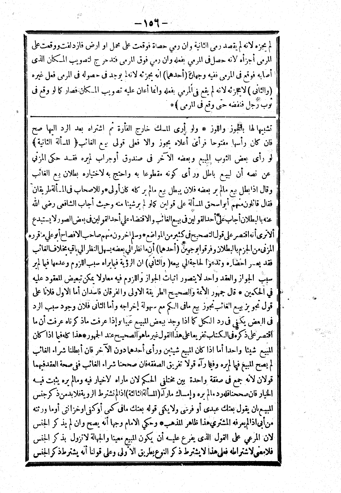 تشبيها لها بالجوز واللوز * ولو أرى المسك خارج الفارة ثم اشتراه بعد الرد إليها صح فان كان رأسها مفتوحا فرأى أعلاه يجوز والا فعلى قولى بيع الغائب (المسألة الثانية) لو رأى بعض الثوب المبيع وبعضه الآخر في صندوق أو جراب لم يره فقد حكى المزني عن نصه أن لبيع باطل ورأى كونه مقطوعا به واحتج به لاختيار بطلان بيع الغائب وقال إذا بطل بيع ما لم ير بعضه فلان يبطل بيع ما لم ير كله كان أولى * وللاصحاب في المسألة طريقان فقال قائلون منهم أبو إسحق المسألة على قولين كما لو لم ير شيئا منه وحيث أجاب الشافعي رضي الله عنه بالبطلان أجاب على أحد القولين في بيع الغائب والاقتضاء علي أحد القولين في بعض الصور لا يستبدع ألا ترى أنه اقتصر على قول التصحيح في كثير من المواضع * وسلم اخرون منهم صاحب الافصاح أبو علي ما قرره المزني من الجزم بالبطلان وفرقوا بوجهين (أحدهما) أن ما نظر الي بعضه يسهل النظر الي باقيه بخلاف الغائب