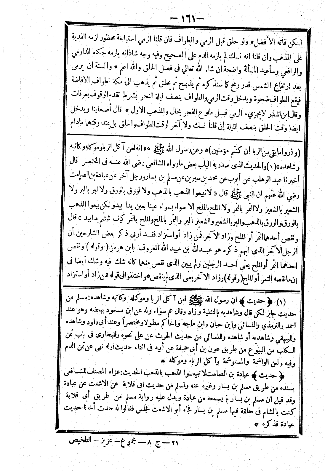 (وذروا ما بقى من الربا ان كنتم مؤمنين) * وعن رسول الله صلى الله عليه وسلم * (انه لعن آكل الربا وموكله وكاتبه وشاهده) والحديث الذى صدر به الباب بعض ما رواه الشافي رضى الله عنه في المختصر قال أخبرنا عبد الوهاب عن أيوب عن محمد بن سيرين عن مسلم بن يسار ورجل آخر عن عبادة بن الصامت رضي الله عنهم ان النبي صلى الله عليه وسلم قال (لا تبيعوا الذهب بالذهب ولا الورق بالورق ولا البر بالبر ولا الشعير بالشعير ولا التمر بالتمر ولا الملح بالملح الا سواء بسواء عينا بعين يدا بيد ولكن بيعوا الذهب بالورق والورق بالذهب والبر بالشعير والشعير البر والتمر بالملح والملح بالتمر كيف شئتم يدا بيد) قال ونقص أحدهما التمر أو الملح وزاد الآخر فمن زاد أو استزاد فقد أربى ذكر بعض الشارحين أن الرجل الآخر الذى ابهم ذكره هو عبد الله بن عبيد الله المعروف بابن هرمز (وقوله) ونقص احدهما التمر أو الملح يعنى احد الرجلين ولم يبين الذى نقص منهما كانه شك فيه وشك أيضا في ان ما نقصه التمر أو الملح (وقوله) وزاد الآخر يعنى الذى لم ينقص * واختلفوا في قوله فمن زاد أو استزاد