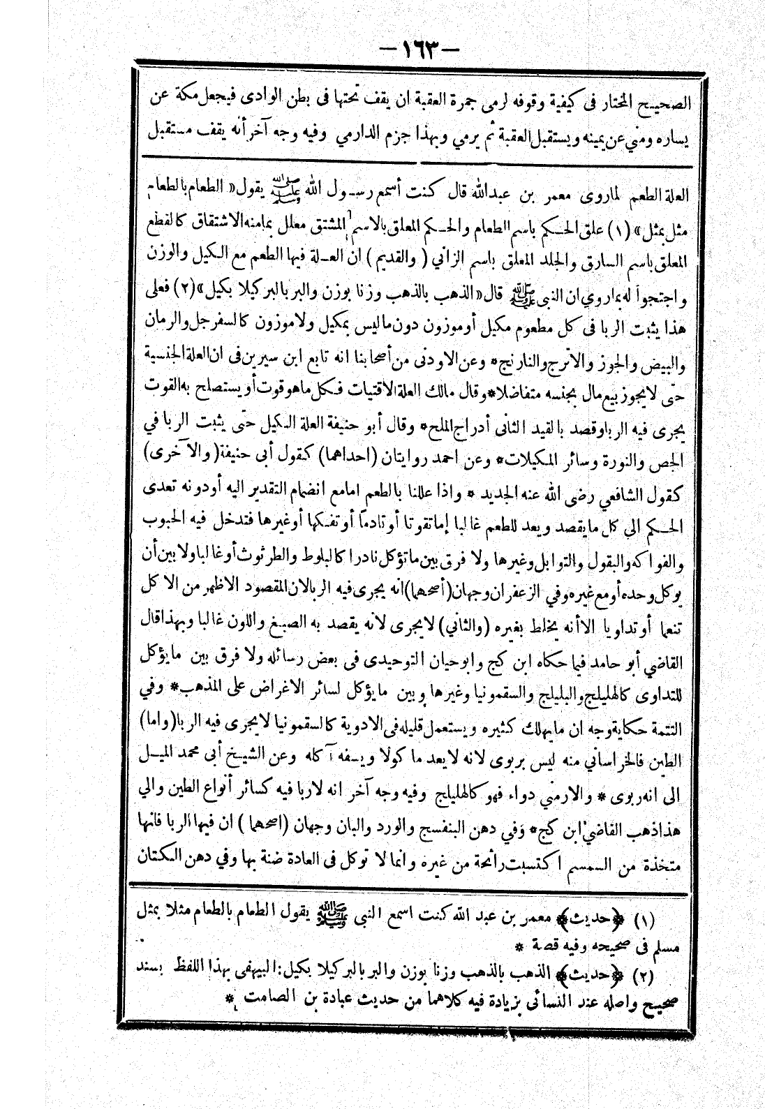 العلة الطعم لما روى معمر بن عبد الله قال كنت أسمع رسول الله صلى الله عليه وسلم يقول (الطعام بالطعام مثل بمثل) علق الحكم باسم الطعام والحكم المعلق بالاسم المشتق معلل بما منه الاشتقاق كالقطع المعلق باسم السارق والجلد المعلق باسم الزاني (والقديم) ان العلة فيها الطعم مع الكيل والوزن واجتجوا له بما روي ان النبي صلى الله عليه وسلم قال (الذهب بالذهب وزنا بوزن والبر بالبر كيلا بكيل) فعلى هذا يثبت الربا في كل مطعوم مكيل أو موزون دون ما ليس بمكيل ولا موزون كالسفرجل والرمان والبيض والجوز والاترج والنارنج * وعن الاودنى من أصحابنا انه تابع ابن سيرين في ان العلة الجنسية حتى لا يجوز بيع مال بجنسه متفاضلا * وقال مالك العلة الاقتيات فكل ما هو قوت أو يستصلح به القوت يجرى فيه الربا وقصد بالقيد الثاني أدراج الملح * وقال أبو حنيفة العلة الكيل حتى يثبت الربا في الجص والنورة وسائر المكيلات * وعن احمد روايتان (احداهما) كقول أبى حنيفة (والآخري) كقول الشافعي رضى الله عنه الجديد * وإذا عللنا بالطعم اما مع انضمام التقدير إليه أو دونه تعدى الحكم إلى كل ما يقصد ويعد للطعم غالبا إما تقوتا أو تادما أو تفكها أو غيرها فتدخل فيه الحبوب والفواكه والبقول والتوابل وغيرها ولا فرق بين ما تؤكل نادرا كالبلوط والطرثوث أو غالبا ولا بين أن يوكل وحده أو مع غيره وفي الزعفران وجهان (أصحهما) انه يجرى فيه الربا لان المقصود الاظهر من الاكل تنعما أو تداويا الا أنه يخلط بغيره (الثاني) لا يجرى لانه يقصد به الصبغ واللون غالبا وبهذا قال القاضي أبو حامد فيما حكاه ابن كج وابو حيان التوحيدي في بعض رسائله ولافرق بين ما يؤكل للتداوي كالهليلج والبليلج والسقمونيا وغيرها وبين ما يؤكل لسائر الاغراض على المذهب * وفي التتمة حكاية وجه ان ما يهلك كثيره ويستعمل قليله في الادوية كالسقمونيا لا يجرى فيه الربا (واما) الطين فالخراساني منه ليس بربوى لانه لا يعد ماكولا ويسفه آكله وعن الشيخ أبى محمد الميل إلى انه ربوي * والارمني دواء فهو كالهليلج وفيه وجه آخر انه لا ربا فيه كسائر أنواع الطين والي هذا ذهب القاضي ابن كج * وفي دهن البنفسج والورد والبان وجهان (اصحهما) ان فيها الربا فانها متخذة من السمسم اكتسبت رائحة من غيره وانما لا توكل في العادة ضنة بها وفي دهن الكتان