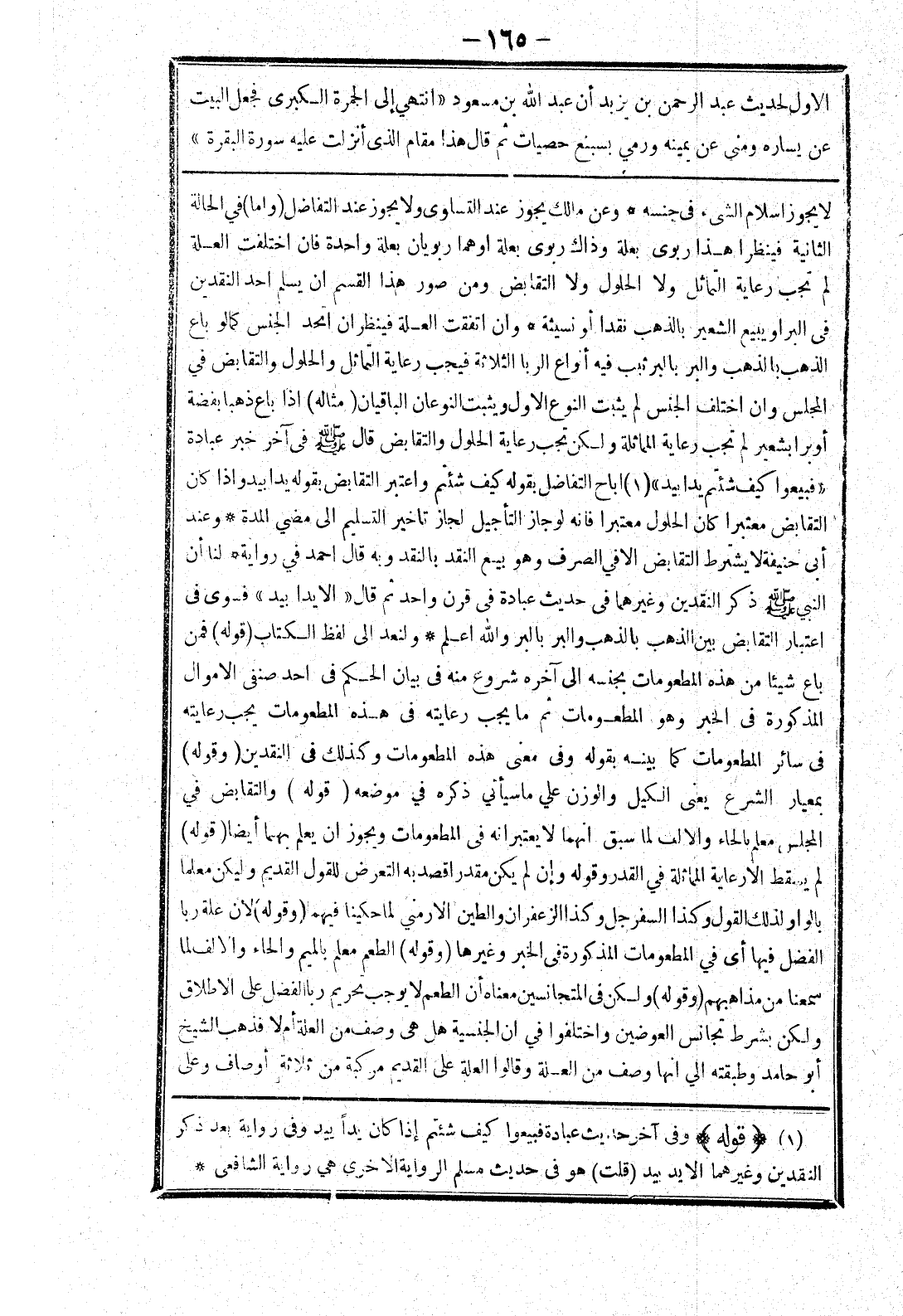 الثانية فينظرا هذا ربوي بعلة وذاك ربوي بعلة اوهما ربويان بعلة واحدة فان اختلفت العلة لم تجب رعاية التماثل ولا الحلول ولا التقابض ومن صور هذا القسم ان يسلم احد النقدين في البر أو يبيع الشعير بالذهب نقدا أو نسيئة * وان اتفقت العلة فينظران اتحد الجنس كما لو باع الذهب بالذهب والبر بالبر ثبب فيه أنواع الربا الثلاثة فيجب رعاية التماثل والحلول والتقابض في المجلس وان اختلف الجنس لم يثبت النوع الاول ويثبت النوعان الباقيان (مثاله) إذا باع ذهبا بفضة أو برا بشعير لم تجب رعاية المماثلة ولكن تجب رعاية الحلول والتقابض قال صلى الله عليه وسلم في آخر خبر عبادة (فبيعوا كيف شئتم يدا بيد) اباح التفاضل بقوله كيف شئتم واعتبر التقابض بقوله يدا بيدا وإذا كان التقابض معتبرا كان الحلول معتبرا فانه لو جاز التأجيل لجاز تأخير التسليم إلى مضي المدة * وعند أبى حنيفة لا يشترط التقابض الا في الصرف وهو بيع النقد بالنقد وبه قال احمد في رواية * لنا أن النبي صلى الله عليه وسلم ذكر النقدين وغيرهما في حديث عبادة في قرن واحد ثم قال (الا يدا بيد) فسوى في اعتبار التقابض بين الذهب بالذهب والبر بالبر والله اعلم * ولنعد إلى لفظ الكتاب (قوله) فمن باع شيئا من هذه المطعومات بجنسه إلى آخره شروع منه في بيان الحكم في احد صنفي الاموال المذكورة في الخبر وهو المطعومات ثم ما يجب رعايته في هذه المطعومات يجب رعايته في سائر المطعومات كما بينه بقوله وفى معنى هذه المطعومات وكذلك في النقدين (وقوله) بمعيار الشرع يعنى الكيل والوزن علي ما سيأتي ذكره في موضعه (قوله) والتقابض في المجلس معلم بالحاء والالف لما سبق انهما لا يتعبرانه في المطعومات ويجوز ان يعلم بهما أيضا (قوله) المجلس معلم بالحاء والالف لما سبق انهما لا يعتبرانه في المطعومات ويجوزان يعلم بهما أيضا (قوله) لم يسقط الارعاية المماثلة في القدر وقوله وإن لم يكن مقدرا قصد به التعرض للقول القديم وليكن معلما بالواو لذلك القول وكذا السفر جل وكذا الزعفران والطين الارمني لما حكينا فيهما (وقوله) لان علة ربا الفضل فيها أي في المطعومات المذكورة في الخبر وغيرها (وقوله) الطعم معلم بالميم والحاء والالف لما سمعنا من مذاهبهم (وقوله) ولكن في المتجانسين معناه أن الطعم لا يوجب تحريم ربا الفضل على الاطلاق ولكن بشرط تجانس العوضين واختلفوا في ان الجنسية هل هي وصف من العلة أم لا فذهب الشيخ