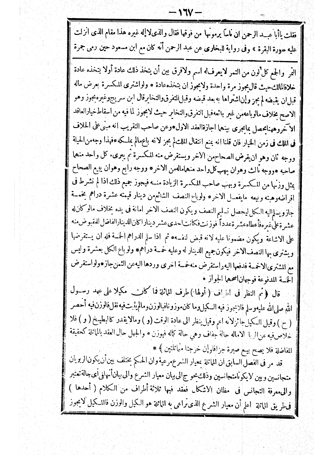 خلاص فيه عن الربا الا ماله حالة جفاف وهي حالة كماله فيوزن * والجهل حال العقد بالمماثلة كحقيقة المفاضلة فلا يصح بيع صبرة جزافا وإن خرجتا متماثلتين) * قد مر في الفصل السابق ان المماثلة بمعيار الشرع مرعية وان الحكم يختلف بين أن يكون الربويان متجانسين وبين لا يكونا متجانسين وذلك يحوج إلى بيان معيار الشرع والى بيان أنها في أي حالة تعتبر والى معرفة التجانس في مظان الاشكال فعقد فيها ثلاثة أطراف من الكلام (أحدها) في طرق الماثلة اعلم أن معيار الشرع الذى تراعى به المماثلة هو الكيل والوزن فالمكيل لا يجوز
