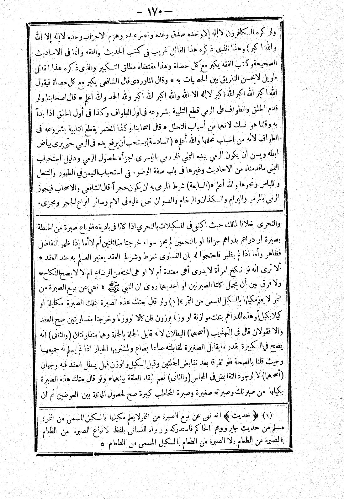 والتحرى خلافا لمالك حيث اكتفى في المكيلات بالتحري إذا كانا في بادية * فلو باع صبرة من الحنطة بصبرة أو دراهم بدراهم جزافا أو بالتخمين لم يجز سواء خرجتا متماثلتين أم لا أما إذا ظهر التفاضل فظاهر وأما إذا لم يظهر فاحتجوا له بان التساوى شرط وشرط العقد يعتبر العلم به عند العقد * ألا ترى انه لو نكح امرأة لا يدرى أهى معتدة أم لا أو هي اخته من الرضاع ام لا لا يصح النكاح * ولا فرق بين أن يجهل كلتا الصبرتين أو احديهما روى ان النبي صلى الله عليه وسلم (نهي عن بيع الصبرة من التمر لا يعلم مكيلها بالكيل المسمى من التمر) ولو قال بعتك هذه الصبرة بتلك الصبرة مكايلة أو كيلا بكيل أو هذه الدراهم بتلك موازنة أو وزنا بوزن فان كالا أو وزنا وخرجتا متساويتين صح العقد والا فقولان قال في التهذيب (أصحهما) البطلان لانه قابل الجملة بالجملة وهما متفاوتتان (والثانى) انه يصح في الكبيرة بقدر ما يقابل الصغيرة لمقابلته صاعا بصاع ولمشتريها الخيار إذا لم يسلم له جميعها وحيث قلنا بالصحة فلو تفرقا بعد تقابض الجملتين وقبل الكيل والوزن فهل يبطل العقد فيه وجهان (أصحهما) لا لوجود التقابض في المجلس (والثانى) نعم لبقاء العلقة بينهما * ولو قال بعتك هذه الصبرة