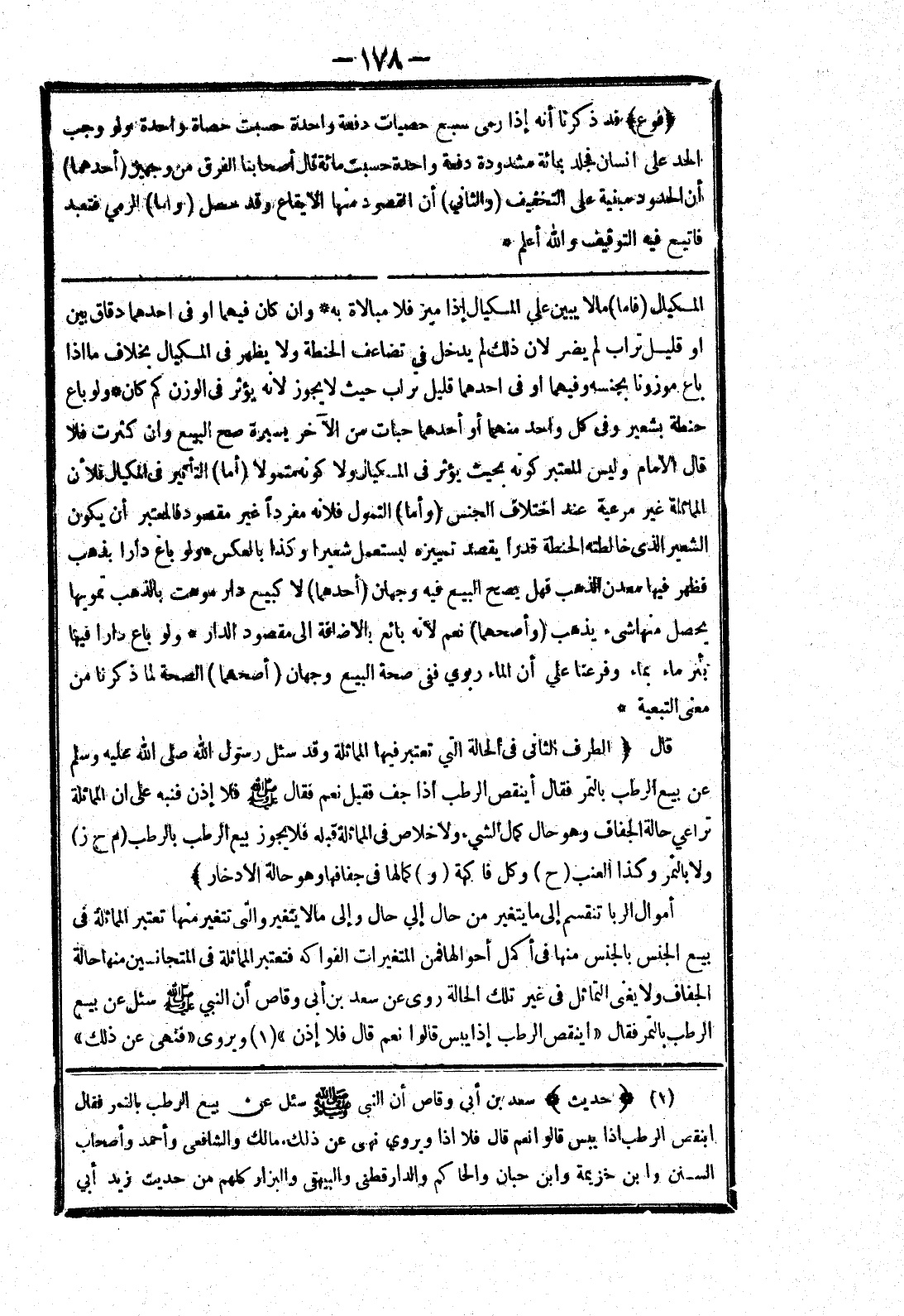 قال (الطرف الثاني في الحالة التي تعتبر فيها المماثلة وقد سئل رسول الله صلى الله عليه وسلم عن بيع الرطب بالتمر فقال أينقص الرطب إذا جف فقيل نعم فقال صلى الله عليه وسلم فلا إذن فنبه على ان المماثلة تراعي حالة الجفاف وهو حال كمال الشئ ولا خلاص في المماثلة قبله فلا يجوز بيع الرطب بالرطب (م ح ز) ولا بالتمر وكذا العنب (ح) وكل فاكهة (و) كمالها في جفافها وهو حالة الادخار) أموال الربا تنقسم إلى ما يتغير من حال إلى حال وإلى ما لا يتغير والتى تتغير منها تعتبر المماثلة في بيع الجنس بالجنس منها في أكمل أحوالها فمن المتغيرات الفواكه فتعتبر المماثلة في المتجانسين منها حالة الجفاف ولا يغنى التماثل في غير تلك الحالة روى عن سعد بن أبى وقاص أن النبي صلى الله عليه وسلم سئل عن بيع الرطب بالتمر فقال (اينقص الرطب إذا يبس قالوا نعم قال فلا إذن) ويروى (فنهى عن ذلك)