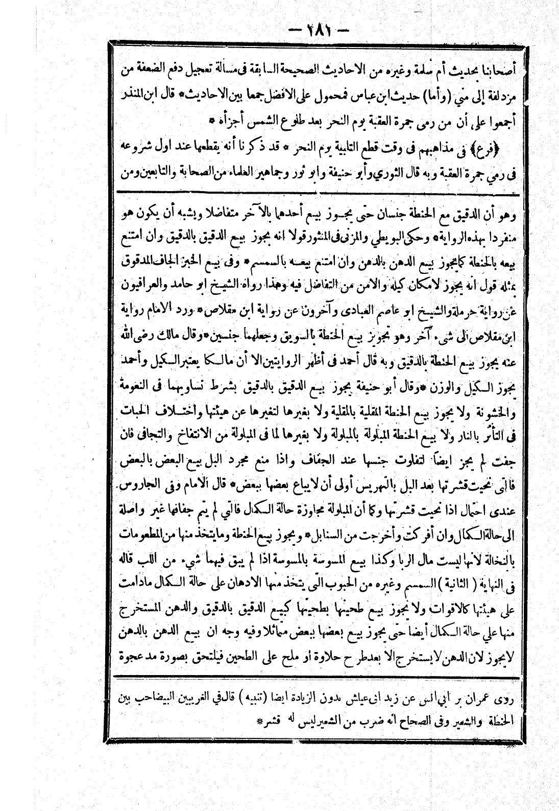 منفردا بهذه الرواية * وحكى البويطي والمزنى في المنثور قولا انه يجوز بيع الدقيق بالدقيق وان امتنع بيعه بالحنطة كما يجوز بيع الدهن بالدهن وان امتنع بيعه بالسمسم * وفى بيع الخبز الجاف المدقوق بمثله قول انه يجوز لامكان كيله والا من من التفاضل فيه وهذا رواه الشيخ ابو حامد والعراقيون عن رواية حرملة والشيخ ابو عاصم العبادي وآخرون عن رواية ابن مقلاص * ورد الامام رواية ابن مقلاص إلى شئ آخر وهو تجويز بيع الحنطة بالسويق وجعلهما جنسين * وقال مالك رضى الله عنه يجوز بيع الحنطة بالدقيق وبه قال أحمد في أظهر الروايتين الا أن مالكا يعتبر الكيل وأحمد يجوز الكيل والوزن * وقال أبو حنيفة يجوز بيع الدقيق بالدقيق بشرط تساويهما في النعومة والخشونة ولا يجوز بيع الحنطة المقلية بالمقلية ولا بغيرها لتغيرها عن هيئتها واختلاف الحبات في التأثر بالنار ولا بيع الحنطة المبلولة بالمبلولة ولا بغيرها لما في المبلولة من الانتفاخ والتجافى فان جفت لم يجز ايضا لتفاوت جنسها عند الجفاف وإذا منع مجرد البل بيع البعض بالبعض فالتى نحيت قشرتها بعد البل بالتهريس أولى أن لا يباع بعضها ببعض * قال الامام وفى الجاروس عندي احتمال إذا نحيت قشرتها وكما أن المبلولة مجاوزة حالة الكمال فالتي لم يتم جفافها غير واصلة إلى حالة الكمال وان أفركت واخرجت من السنابل * ويجوز بيع الحنطة وما يتخذ منها من المطعومات بالنخالة لانها ليس مال الربا وكذا بيع المسوسة بالمسوسة إذا لم يبق فيها شئ من اللب قاله في النهاية (الثانية) السمسم وغيره من الحبوب التى يتخذ منها الادهان على حالة الكمال ما دامت على هيئتها كالاقوات ولا نجوز بيع طحينها بطحينها كبيع الدقيق بالدقيق والدهن المستخرج منها علي حالة الكمال ايضا حتى يجوز بيع بعضها ببعض مماثلا وفيه وجه ان بيع الدهن بالدهن لا يجوز لان الدهن لا يستخرج الا بعد طرح حلاوة أو ملح على الطحين فيلتحق بصورة مد عجوة