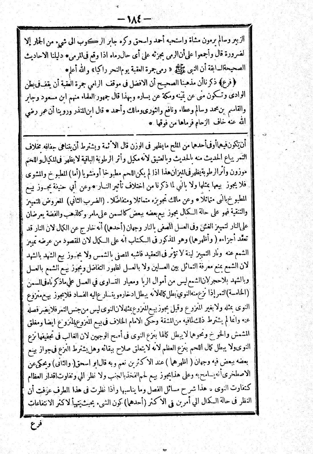 أن يكون فيهما أو في أحدهما من الملح ما يظهر في الوزن قال الائمة ويشترط أن يتناهى جفافه بخلاف التمر يباع الحديث منه بالحديث وبالعتيق لانه مكيل واثر الرطوبة الباقية لا يظهر في المكيال واللحم موزون وأثر الرطوبة يظهر في الميزان هذا إذا لم يكن اللحم مطبوخا أو مشويا (أما) المطبوخ والمشوى فلا يجوز بيعها بمثلها ولا بالني لما ذكرنا من اختلاف تأثير النار * وعن أبي حنيفة يجز بيع المطبوخ بالنى متماثلا * وعن مالك تجويزه متماثلا ومتفاضلا.