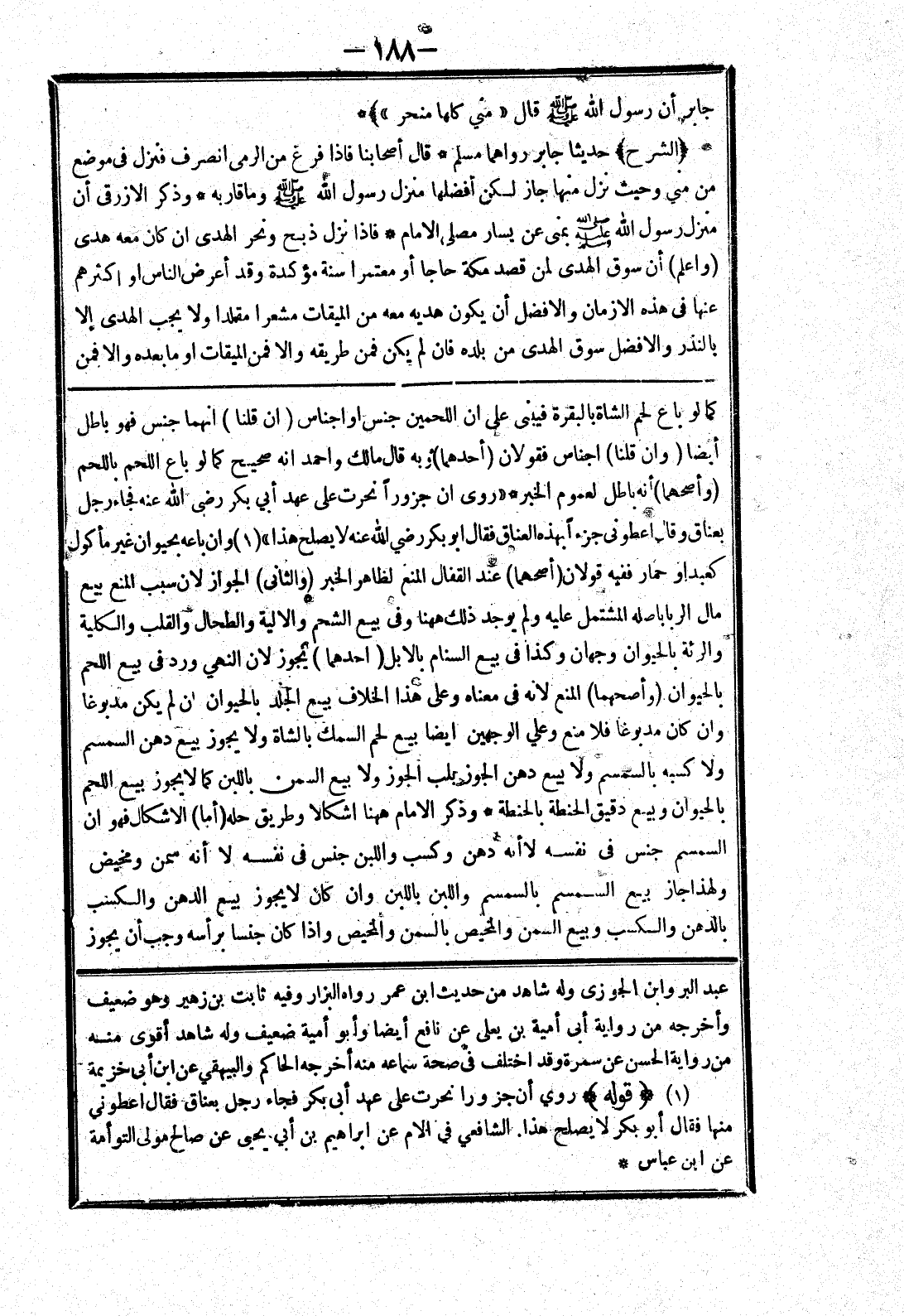 كما لو باع لحم الشاة بالبقرة فيبنى على ان اللحمين جنس أو اجناس (ان قلنا) انهما جنس فهو باطل أيضا (وان قلنا) اجناس فقولان (أحدهما) وبه قال مالك واحمد انه صحيح كما لو باع اللحم باللحم (وأصحهما) أنه باطل لعموم الخبر * (روى ان جزورا نحرت على عهد أبي بكر رضى الله عنه فجاء رجل بعناق وقال اعطوني جزءا بهذه العناق فقال ابو بكر رضي الله عنه لا يصلح هذا) وان باعه بحيوان غير مأكول كعبد أو حمار ففيه قولان (أصحهما) عند القفال المنع لظاهر الخبر (والثانى) الجواز لان سبب المنع بيع مال الربا باصلة المشتمل عليه ولم يوجد ذلك ههنا وفى بيع الشحم والالية والطحال والقلب والكلية والرئة بالحيوان وجهان وكذا في بيع السنام بالابل (احدهما) يجوز لان النهى ورد في بيع اللحم