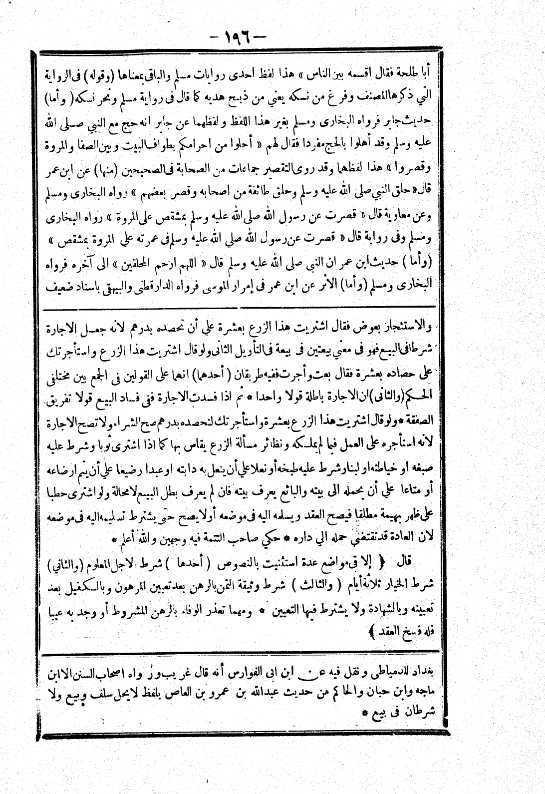 الصفقة * ولو قال اشتريت هذا الزرع بعشرة واستأجرتك لتحصده بدرهم صح الشراء ولا تصح الاجارة لانه استأجره على العمل فيما لم يملكه ونظائر مسألة الزرع يقاس بها كما إذا اشترى ثوبا وشرط عليه صبغة أو خياطته أو لبنا وشرط عليه طبخه أو نعلا علي أن ينعل به دابته أو عبدا رضيعا علي أن يتم ارضاعه أو متاعا على أن يحمله إلى بيته والبائع يعرف بيته فان لم يعرف بطل البيع لا محالة ولو اشترى حطبا على ظهر بهيمة مطلقا فيصح العقد ويسمله إليه في موضعه أو لا يصح حتى يشترط تسلمه إليه في موضعه لان العادة قد تقتضي حمله الي داره * حكي صاحب التتمة فيه وجهين والله أعلم * قال (إلا في مواضع عدة استثنيت بالنصوص (أحدها) شرط الاجل المعلوم (والثاني) شرط الخيار ثلاثة أيام (والثالث) شرط وثيقة الثمن بالرهن بعد تعيين المرهون وبالكفيل بعد تعيينه وبالشهادة ولا يشترط فيها التعيين * ومهما تعذر الوفاء بالرهن المشروط أو وجد به عيبا فله فسخ العقد)