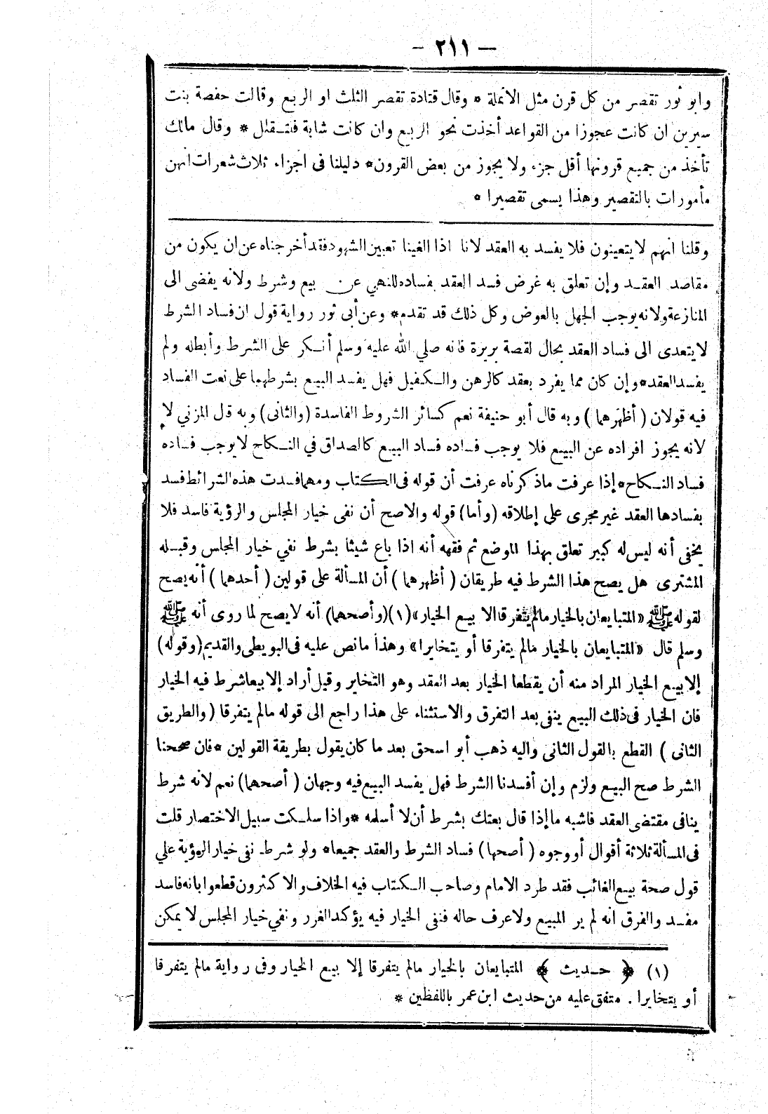 وقلنا انهم لا يتعينون فلا يفسد به العقد لانا إذا الغينا تعبين الشهور فقد أخرجناه عن ان يكون من مقاصد العقد وإن تعلق به غرض فسد العقد بفساده للنهي عن بيع وشرط ولانه يفضى إلى المنازعة ولانه يوجب الجهل بالعوض وكل ذلك قد تقدم * وعن أبى ثور رواية قول ان فساد الشرط لا يتعدى إلى فساد العقد بحال لقصة بريرة فانه صلي الله عليه وسلم أنكر على الشرط وأبطله ولم يفسد العقد * وإن كان مما يفرد بعقد كالرهن والكفيل فهل يفسد البيع بشرطهما على نعت الفساد فيه قولان (أظهرهما) وبه قال أبو حنيفة نعم كسائر الشروط الفاسدة (والثانى) وبه قال المزني لا لانه يجوز افراده عن البيع فلا يوجب فساده فساد البيع كالصداق في النكاح لا يوجب فساده فساد النكاح * إذا عرفت ما ذكرناه عرفت أن قوله في الكتاب ومهما فسدت هذه الشرائط فسد بفسادها العقد غير مجرى على إطلاقه (وأما) قوله والاصح أن نفى خيار المجلس والرؤية فاسد فلا يخفى أنه ليس له كبير تعلق بهذا الموضع ثم فقهه أنه إذا باع شيئا بشرط نفي خيار المجلس وقبله المشترى هل يصح هذا الشرط فيه طريقان (أظهرهما) أنه المسألة على قولين (أحدهما) أنه يصح لقوله صلى الله عليه وسلم (المتبايعان بالخيار ما لم يتفرقا الا بيع الخيار) (وأصحهما) أنه لا يصح لما روى أنه صلى الله عليه وسلم