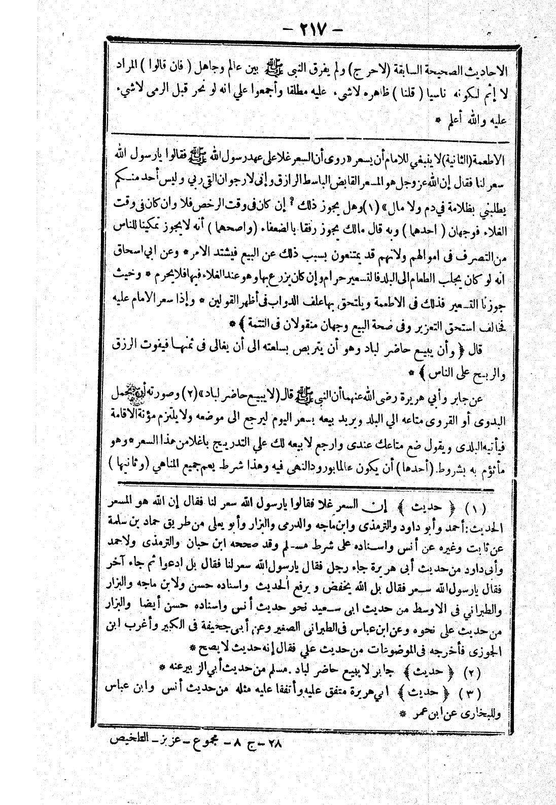 الاطعمة (الثانية) لا ينبغي للامام أن يسعر (روى أن السعر غلا على عهد رسول الله صلى الله عليه وسلم فقالوا يارسول الله سعر لنا فقال إن الله عزوجل هو المسعر القابض الباسط الرازق وإنى لارجو ان القى ربي وليس أحد منكم يطلبني بظلامة في دم ولا مال) وهل يجوز ذلك؟ إن كان في وقت الرخص فلا وان كان في وقت الغلاء فوجهان (احدهما) وبه قال مالك يجوز رفقا بالضعفاء (واصحهما) أنه لا يجوز تمكينا للناس من التصرف في اموالهم ولانهم قد يمتنعون بسبب ذلك عن البيع فيشتد الامر * وعن ابي اسحاق انه لو كان يجلب الطعام إلى البلد فالتسعير حرام وإن كان يزرع بها وهو عند الغلاء فيها فلا يحرم * وحيث جوزنا التسعير فذلك في الاطعمة ويلتحق بها علف الدواب في أظهر القولين * وإذا سعر الامام عليه فخالف استحق التعزير وفى صحة البيع وجهان منقولان في التتمة) *