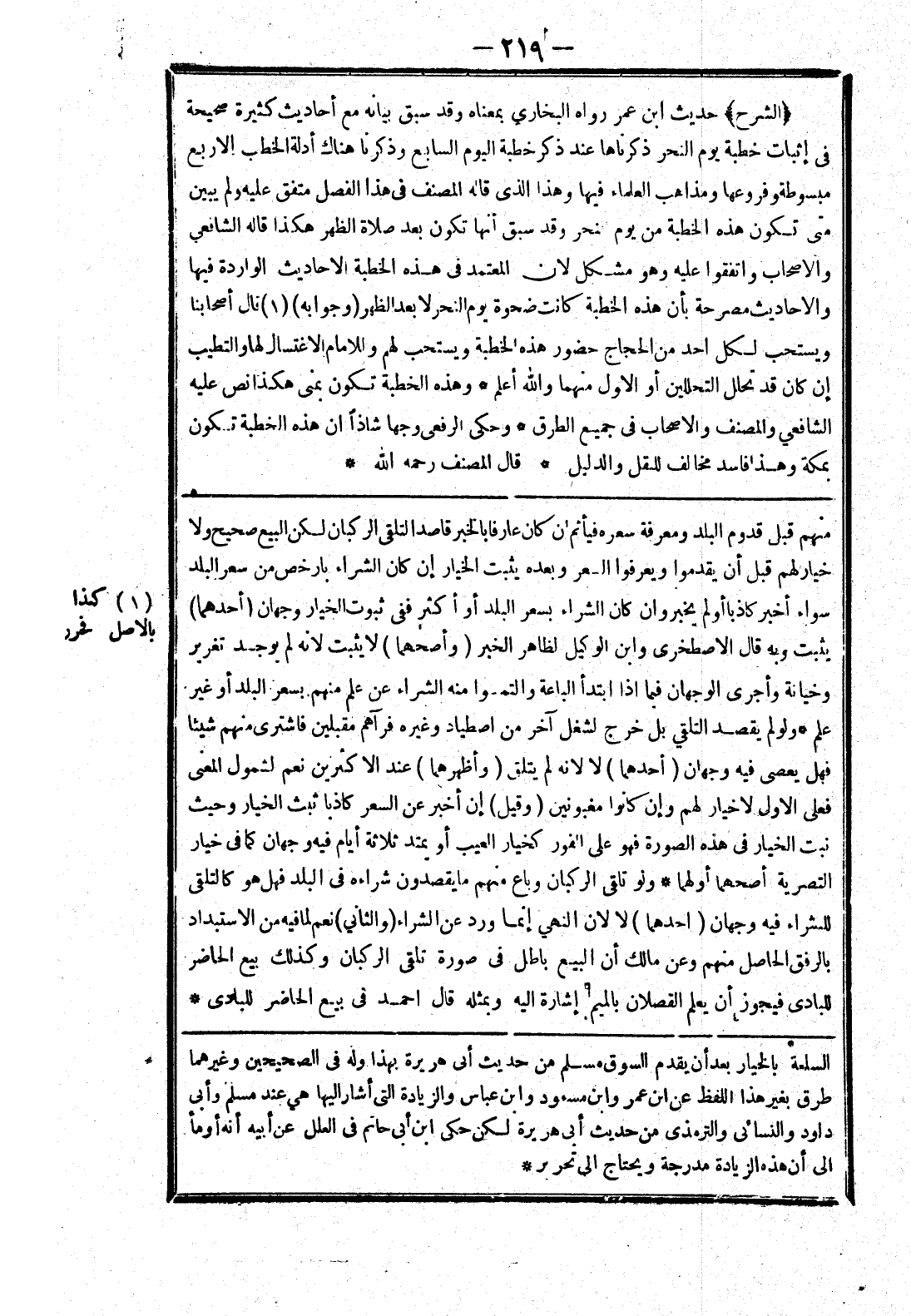 منهم قبل قدوم البلد ومعرفة سعره فيأثم ان كان عارفا بالخبر قاصدا لتلقى الركبان لكن البيع صحيح ولا خيار لهم قبل أن يقدموا ويعرفوا السعر وبعده يثبت الخيار إن كان الشراء بارخص من سعر البلد سواء أخبر كاذبا أولم يخبر وان كان الشراء بسعر البلد أو أكثر ففى ثبوت الخيار وجهان (أحدهما) يثبت وبه قال الاصطخرى وابن الوكيل لظاهر الخبر (وأصحهما) لا يثبت لانه لم يوجد تغرير وخيانة وأجرى الوجهان فيما إذا ابتدأ الباعة والتمسوا منه الشراء عن علم منهم بسعر البلد أو غير علم * ولو لم يقصد التلقي بل خرج لشغل آخر من اصطياد وغيره فرآهم مقبلين فاشترى منهم شيئا فهل يعصى فيه وجهان (أحدهما) لا لانه لم يتلق (واظهرهما) عند الاكثرين نعم لشمول المعنى فعلى الاول لا خيار لهم وإن كانوا مغبونين (وقيل) إن أخبر عن السعر كاذبا ثبت الخيار وحيث نبت الخيار في هذه الصورة فهو على الفور كخيار العيب أو يمتد ثلاثة أيام فيه وجهان كما في خيار التصرية أصحهما أولهما * ولو تلقى الركبان وباع منهم ما يقصدون شراءه في البلد فهل هو كالتلقي للشراء فيه وجهان (احدهما) لا لان النهي إنما ورد عن الشراء (والثاني) نعم لما فيه من الاستبداد بالرفق الحاصل منهم وعن مالك أن البيع باطل في صورة تلقى الركبان وكذلك بيع الحاضر للبادى فيجوز أن يعلم القصلان بالميم إشارة إليه وبمثله قال احمد في بيع الحاضر للبادى *
