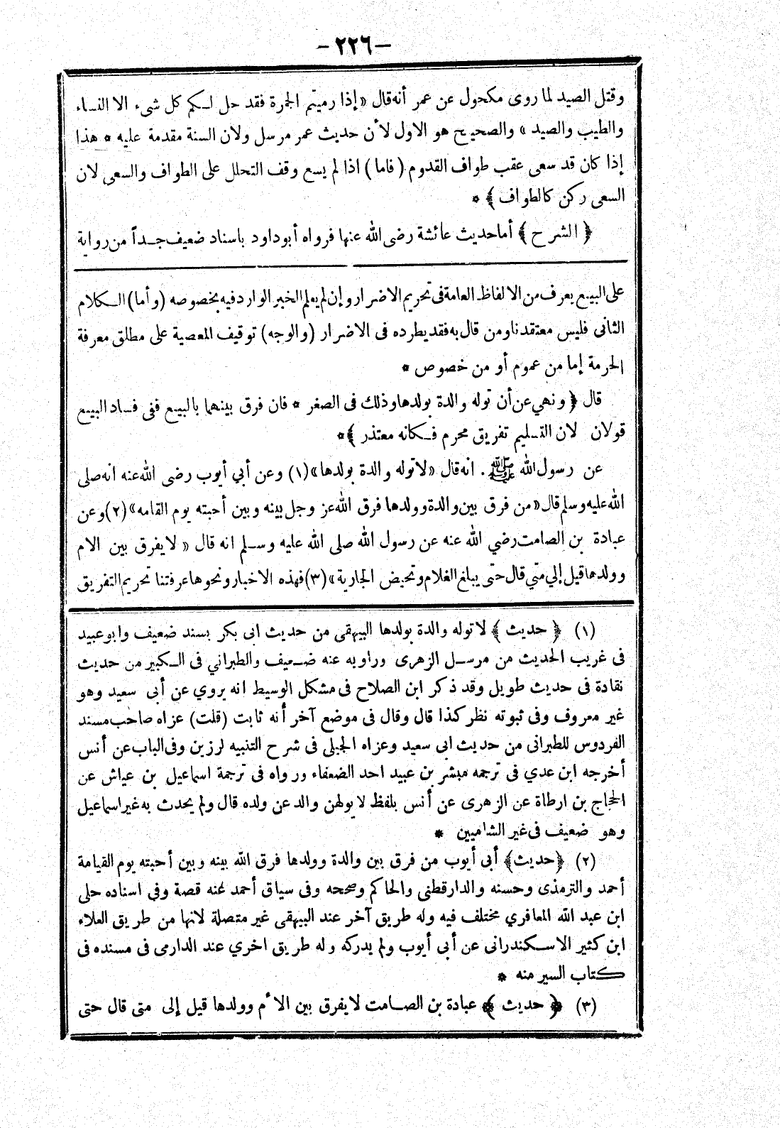 انه قال (لا توله والدة بولدها) وعن أبي أيوب رضى الله عنه انه صلى الله عليه وسلم قال (من فرق بين والدة وولدها فرق الله عزوجل بينه وبين أحبته يوم القامة) وعن عبادة بن الصامت رضي الله عنه عن رسول الله صلى الله عليه وسلم انه قال (لا يفرق بين الام وولدها قيل إلي متي قال حتى يبلغ الغلام وتحيض الجارية) فهده الاخبار ونحوها عرفتنا تحريم التفريق