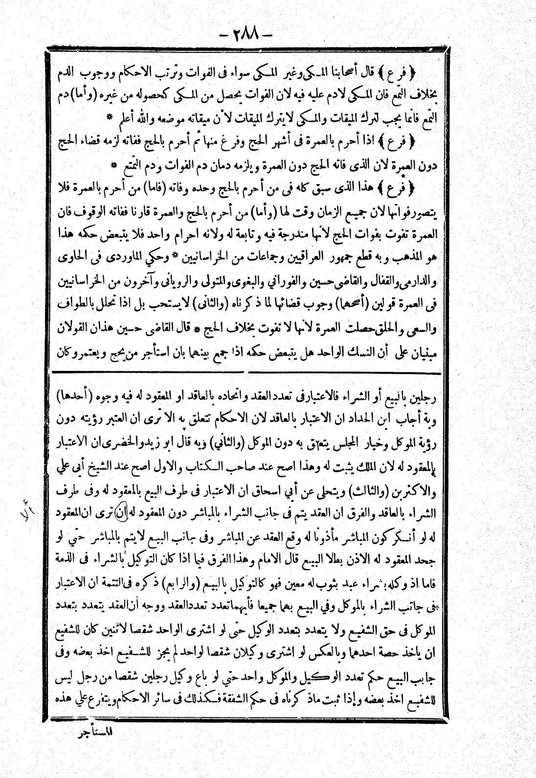 رجلين بالبيع أو الشراء فالاعتبار في تعدد العقد واتحاده بالعاقد أو المعقود له فيه وجوه (أحدها) وبة أجاب ابن الحداد ان الاعتبار بالعاقد لان الاحكام تتعلق به الا ترى ان العتبر؟ رؤيته دون رؤية الموكل وخيار المجلس يتعلق به دون الموكل (والثاني) وبه قال ابو زيد والخضري ان الاعتبار بالمعقود له لان الملك يثبت له وهذا اصح عند صاحب الكتاب والاول اصح عند الشيخ أبي على والاكثرين (والثالث) ويتحلى عن أبي اسحاق ان الاعتبار في طرف البيع بالمعقود له وفي طرف الشراء بالعاقد والفرق ان العقد يتم في جانب الشراء بالمباشر دون المعقود له ان ترى ان المعقود له لو أنكر كون المباشر مأذونا له وقع العقد عن المباشر وفي جانب البيع لا يتم بالمباشر حتى لو جحد المعقود له الاذن بطلا البيع قال الامام وهذا الفرق فيما إذا كان التوكيل بالشراء في الذمة