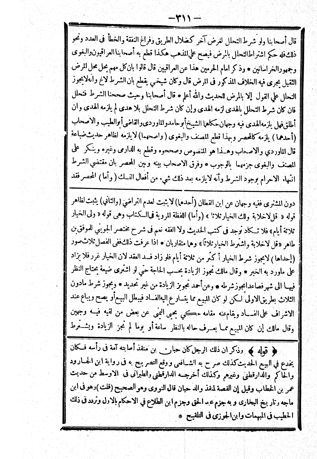 ثلاثة أيام) فلا تكاد توجد في كتب الحديث ولا الفقه نعم في شرح مختصر الجويني للموفق بن طاهر (قل لا خلابة واشترط الخيار ثلاثا) وهما متقاربان * إذا عرفت ذلك ففي الفصل ثلاث صور (إحداها) لا يجوز شرط الخيار أكثر من ثلاثة أيام فلو زاد فسد العقد لان الخيار غرر فلا يزاد على ما ورد به الخبر * وقال مالك تجوز الزيادة بحسب الحاجة حتى لو اشترى ضيعة يحتاج النظر فيها إلى شهر فصاعدا يجوز شرطه * وعن أحمد تجويز الزيادة من غير تحديد * ويجوز شرط ما دون الثلاث بطريق الاولى لكن لو كان المبيع مما يتسارع إليه الفساد فيبطل البيع أو يصح ويباع عند الاشراف على الفساد ويقام عنه مقامه حكي يحيى اليمني عن بعض من لقيه فيه وجهين وقال مالك إن كان المبيع مما يعرف حاله بالنظر ساعة أو يوما لم تجز الزيادة ويشترط