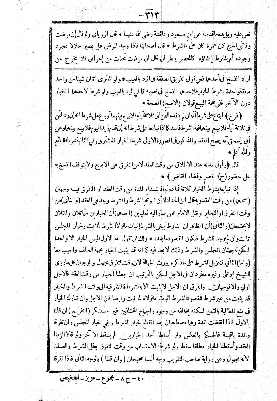 اراد الفسخ في أحدهما فعلى قولى تفريق الصفقة في الرد بالعيب * ولو اشترى اثنان شيئا من واحد صفقة واحدة بشرط الخيار فلاحدهما الفسخ في نصيبه كما في الرد بالعيب ولو شرط لاحدهما الخيار دون الاخر ففي صحة البيع قولان (الاصح) الصحة * (فرع) ابتاع على شرط أنه ان لم ينقده الثمن إلى ثلاثة أيام فلا بيع بينهما أو باع على شرط انه إن رد الثمن في ثلاثة أيام فلا بيع بينهما فهذا شرط فاسد كما إذا تبايعا على شرط انه إن قدم زيد اليوم فلا بيع بينهما وعن أبي إسحق أنه يصح العقد والمذكور في الصورة الاولى شرط الخيار للمشتري وفي الثانية شرطه للبائع والله أعلم * قال (وأول مدته عند الاطلاق من وقت العقد لا من التفرق على الاصح ولا يتوقف الفسخ به على حضور (ح) لخصم وقضاء القاضي) * إذا تبايعا بشرط الخيار ثلاثة فما دونها فابتداء المدة من وقت العقد أو التفرق فيه وجهان (اصحهما) من وقت العقد وبه قال ابن الحداد لان ثبوته بالشرط والشرط وجد في العقد (والثاني) من وقت التفرق أو التخاير ونقل الامام عمن صار إليه تعليلين (احدهما) أن الخيارين متماثلان والمثلان لا يجتمعان (والثاني) أن الظاهر ان الشارط يبغي بالشرط إثبات ما لولا الشرط لما ثبت وخيار المجلس ثابت وان لم يوجد الشرط فيكون المقصود ما بعده * ولك ان تقول اما الاول فليس الخيار الا واحدا لكن له جهتان المجلس والشرط وذلك لا بعد فيه كما انه قد يثبت الخيار بجهة الخلف والعيب معا (واما) الثاني فتنزيل الشرط على ما ذكره يورث الجهالة لان وقت التفرق مجهول والوجهان على ما روي الشيخ ابو على وغيره مطردان في الاجل لكن بالترتيب ان جعلنا الخيار من وقت العقد فالاجل اولى والا فوجهان والفرق ان الاجل لا يثبت الا بالشرط فالنظر فيه إلى وقت الشرط والخيار قد يثبت من غير شرط فمقصود الشرط اثبات ما لولاه لما ثبت وايضا فان الاجل وان شارك الخيار في منع المطالبة بالثمن لكنه يخالفه من وجوه واجتماع المختلفين غير مستنكر (التفريع) ان قلنا بالاول فإذا انقضت المدة وهما مصطحبان بعد انقطع خيار الشرط وبقي خيار المجلس وان تفرقا