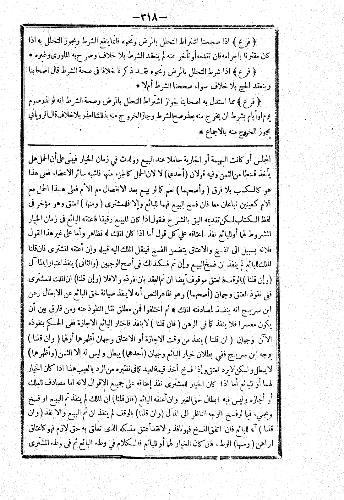 المجلس أو كانت البهيمة أو الجارية حاملا عند البيع وولدت في زمان الخيار فيبني على أن الحمل هل يأخذ قسطا من الثمن وفيه قولان (أحدهما) لا لان الحمل كالجزء منها فاشبه سائر الاعضاء فعلى هذا هو كالكسب بلا فرق (وأصحهما) نعم كما لوبيع بعد الانفصال مع الام فعلى هذا الحمل مع الام كعينين تباعان معا فان فسخ البيع فهما للبائع وإلا فللمشتري (ومنها) العتق وهو مؤخر في لفظ الكتاب لكن تقديمه اليق بالشرح فنقول إذا كان المبيع رقيقا فاعتقه البائع في زمان الخيار المشروط لهما أو للبائع نفذ اعتاقه على كل قول اما إذا كان الملك له فظاهر واما على غير هذا القول فلانه بسبيل إلى الفسخ والاعتاق يتضمن الفسخ فينقل الملك إليه قبيله وان أعتقه المشترى فان قلنا الملك للبائع لم ينفذ ان فسخ البيع وان تم فكذلك في أصح الوجهين (والثاني) ينفذ اعتبارا بالمال (وان قلنا) بالوقف فالعتق موقوف ايضا ان تم العقد بان نفوذه والا فلا (وان قلنا) ان الملك للمشترى ففي نفوذ العتق وجهان (أصحهما) وهو ظاهر النص انه لا ينفذ صيانة لحق البائع عن الابطال وعن ابن سريج انه ينفذ لمصادفته الملك * ثم اختلفوا فمن مطلق نقل النفوذ عنه ومن فارق بين ان يكون معسرا فلا ينفذ كما في الرهن (فان قلنا) لا ينفذ فاختار البائع الاجازة ففي الحكم بنفوذه الان وجهان (ان قلنا) ينفذ من وقت الاجازة أو الاعتاق وجهان أظهرهما أولهما (وان قلنا)