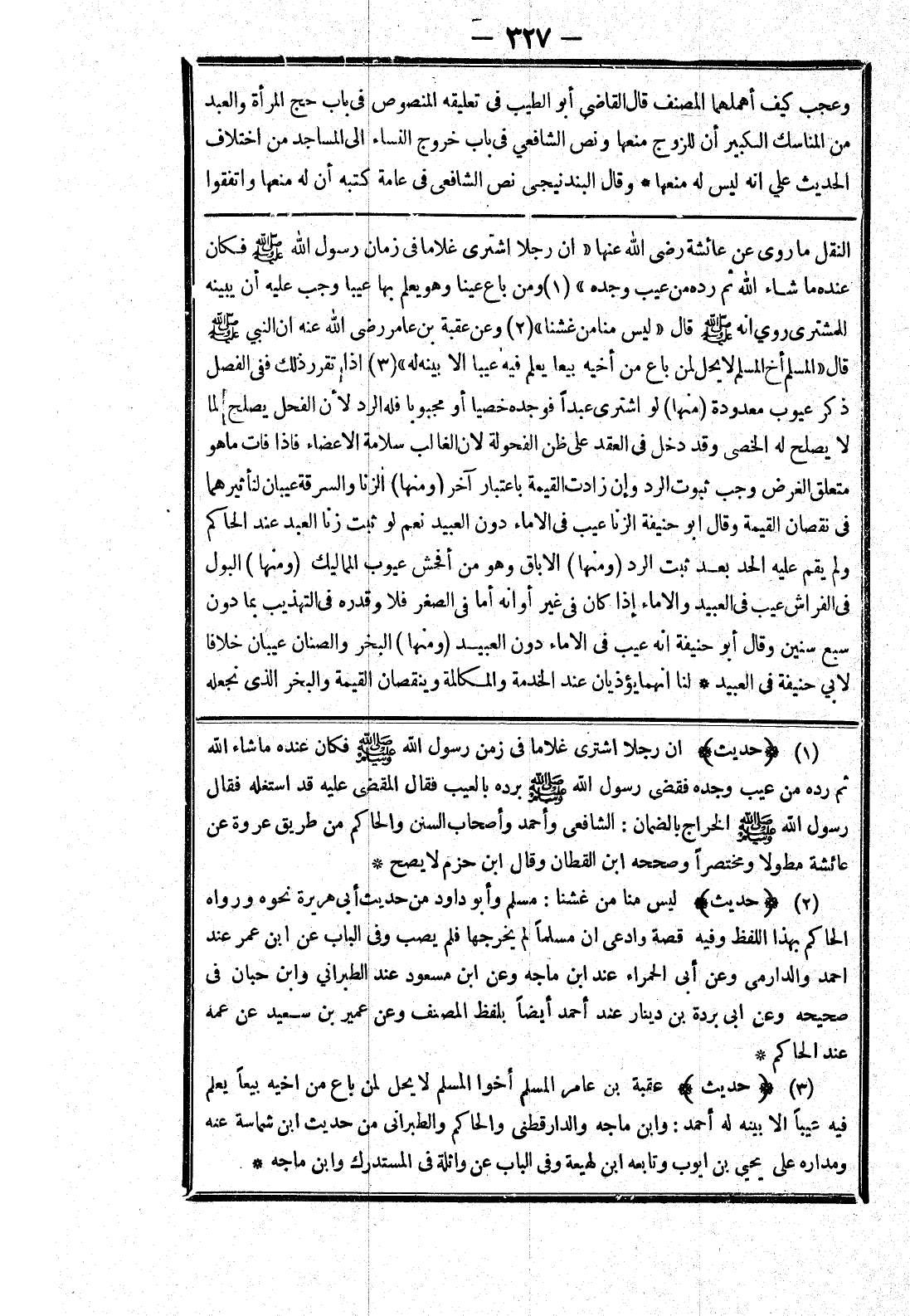 النقل ما روي عن عائشة رضي الله عنها (ان رجلا اشترى غلاما في زمان رسول الله صلى الله عليه وسلم فكان عنده ما شاء الله ثم رده من عيب وجده) ومن باع عينا وهو يعلم بها عيبا وجب عليه أن يبينه للمشتري روي انه صلى الله عليه وسلم قال (ليس منا من غشنا) وعن عقبة بن عامر رضي الله عنه ان النبي صلى الله عليه وسلم قال (المسلم أخ المسلم لا يحل لمن باع من أخيه بيعا يعلم فيه عيبا الا بينه له) إذا تقرر ذلك ففي الفصل ذكر عيوب معدودة (منها) لو اشترى عبدا فوجده خصيا أو مجبوبا فله الرد لان الفحل يصلح لما