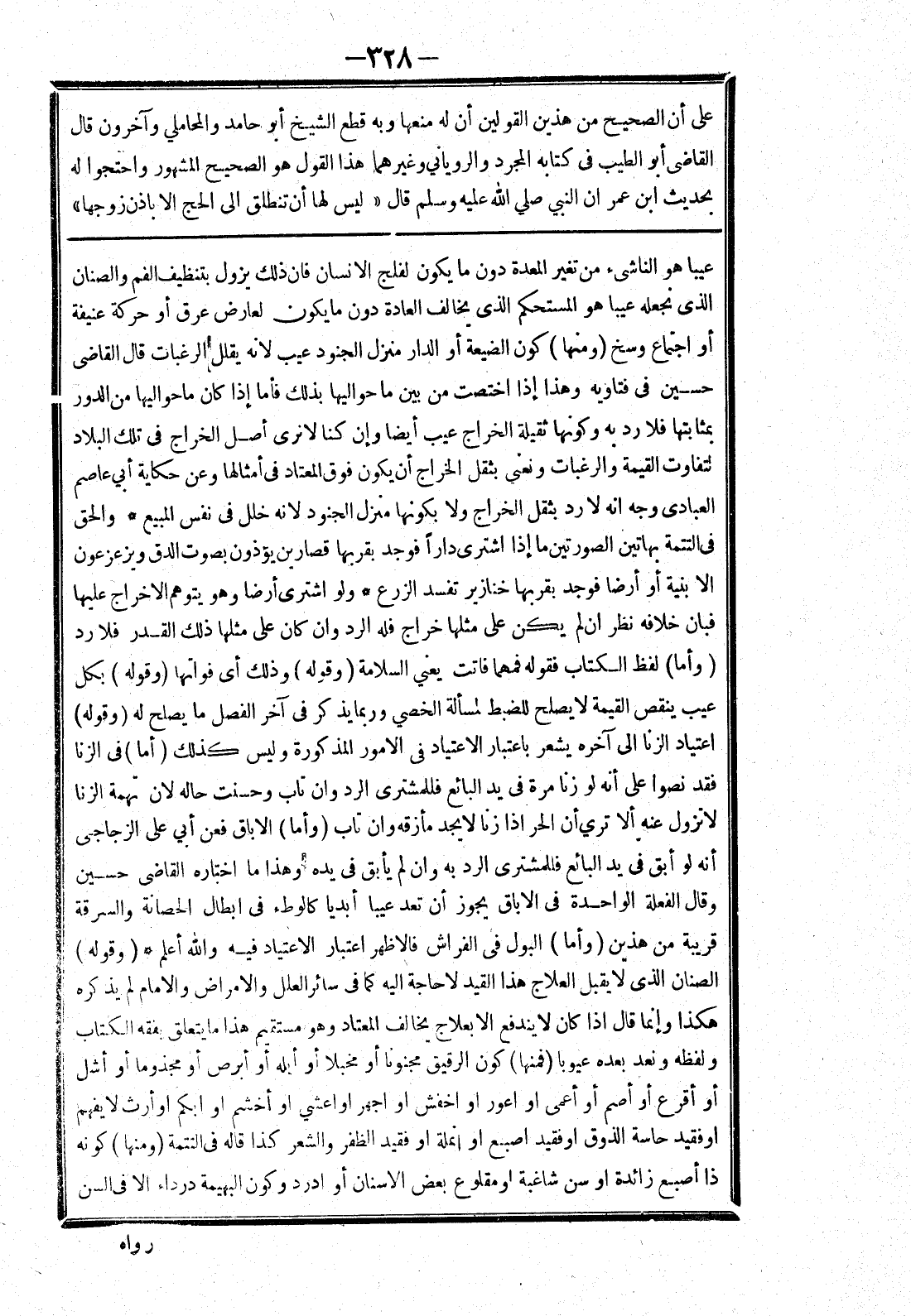 لا تزول عنه ألا تري أن الحر إذا زنا لا يجد مأزقه وان تاب (وأما) الاباق فعن أبي علي الزجاجي أنه لو أبق في يد البائع فللمشتري الرد به وان لم يأبق في يده وهذا ما اختاره القاضي حسين وقال الفعلة الواحدة في الاباق يجوز أن تعد عيبا أبديا كالوطئ في ابطال الحصانة والسرقة قريبة من هذين (وأما) البول في الفراش فالاظهر اعتبار الاعتياد فيه والله أعلم * (وقوله) الصنان الذي لا يقبل العلاج هذا القيد لا حاجة إليه كما في سائر العلل والامراض والامام لم يذكره هكذا وإنما قال إذا كان لا يندفع الا بعلاج يخالف المعتاد وهو مستقيم هذا ما يتعلق بفقه الكتاب ولفظه ونعد بعده عيوبا (فمنها) كون الرقيق مجنونا أو مخبلا أو أبله أو أبرص أو مجذوما أو أشل أو أقرع أو أصم أو أعمى أو اعور أو اخفش أو اجهر أو اعشى أو أخشم أو أبكم أو أرث لا يفهم أو فقيد حاسة الذوق أو فقيد اصبع أو انملة أو فقيد الظفر والشعر كذلك قاله في التتمة (ومنها) كونه ذا أصبع زائدة أو سن شاغبة أو مقلوع بعض الاسنان أو ادرد وكون البهيمة درداء الا في السن