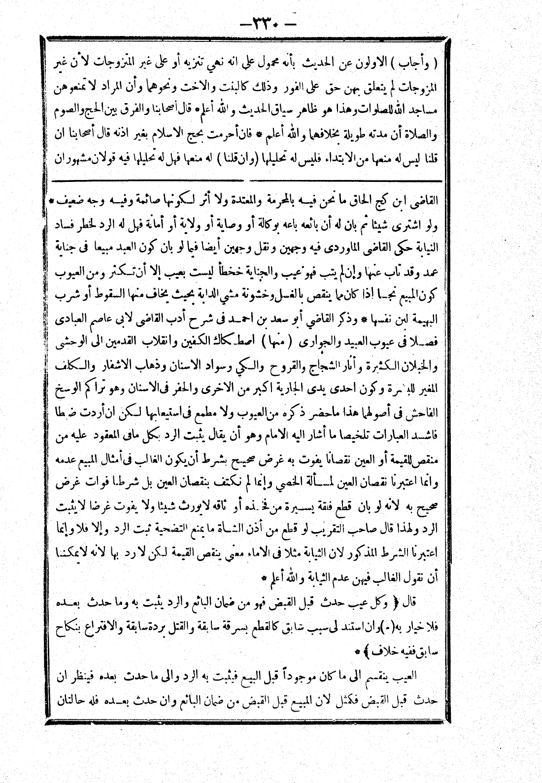 القاضي ابن كج الحاق ما نحن فيه بالمحرمة والمعتدة ولا أثر لكونها صائمة وفيه وجه ضعيف * ولو اشترى شيئا ثم بان له أن بائعه باعه بوكالة أو وصاية أو ولاية أو أمانة فهل له الرد لخطر فساد النيابة حكى القاضي الماوردي فيه وجهين ونقل وجهين ايضا فيما لو بان كون العبد مبيعا في جناية عمد وقد تاب عنها وإن لم يتب فهو عيب والجناية خطأ ليست بعيب إلا أن تكثر ومن العيوب كون المبيع نجسا إذا كان مما ينقص بالغسل وخشونة مشي الدابة بحيث يخاف منها السقوط أو شرب البهيمة لبن نفسها * وذكر القاضي أبو سعد بن احمد في شرح أدب القاضي لابي عاصم العبادي فصلا في عيوب العبيد والجواري (منها) اصطكاك الكفين وانقلاب القدمين إلى الوحشي والخبلان الكثيرة واثار الشجاج والقروح والكي وسواد الاسنان وذهاب الاشفار والكلف المغير للبشرة وكون احدى يدي الجارية اكبر من الاخرى والحفر في الاسنان وهو تراكم الوسخ