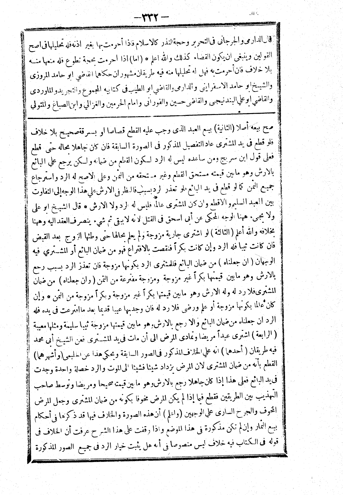 بخلافه والله أعلم (الثالثة) لو اشترى جارية مزوجة ولم يعلم بحالها حتى وطئها الزوج بعد القبض فان كانت ثيبا فله الرد وإن كانت بكرا فنقصت بالافتراع فهو من ضمان البائع أو المشتري فيه الوجهان (ان جعلناه) من ضمان البائع فللمشترى الرد بكونها مزوجة فان تعذر الرد بسبب رجع بالارش وهو ما بين قيمتها بكرا غير مزوجة مزوجة مفترعة من الثمن (وان جعلناه) من ضمان المشتري فلا رد له وله الارش وهو ما بين قيمتها بكرا غير مزوجة وبكرا مزوجة من الثمن * وان كان عالما بكونها مزوجة أو علم ورضي فلا رد له فان وجد بها عيبا قديما بعد ما افترعت في يده فله الرد ان جعلناه من ضمان البائع والا رجع بالارش وهو ما بين قيمتها مزوجة ثيبا سليمة ومثلها معيبة (الرابعة) اشترى عبدا مريضا وتمادي المرض إلى أن مات في يد المشتري فعن الشيخ أبي محمد فيه طريقان (أحدهما) انه على الخلاف المذكور في الصور السابقة ويحكي هذا عن الحليمي (وأشهرهما) القطع بأنه من ضمان المشتري لان المرض يزداد شيئا فشيئا إلى الموت والرد خصلة واحدة وجدت في يد البائع فعلى هذا إذا كان جاهلا رجع بالارش وهو ما بين قيمته صحيحا ومريضا وتوسط صاحب التهذيب بين الطريقين فقطع فيما إذا لم يكن المرض مخوفا بكونه من ضمان المشتري وجعل المرض المخوف والجرح الساري على الوجهين (واعلم) أن هذه الصورة والخلاف فيها قد ذكرها في أحكام بيع الثمار وإن لم تكن مذكورة في هذا الموضع وإذا وقفت على هذا الشرح عرفت أن الخلاف في قوله في الكتاب فيه خلاف ليس منصوصا في أنه هل يثبت خيار الرد في جميع الصور المذكورة