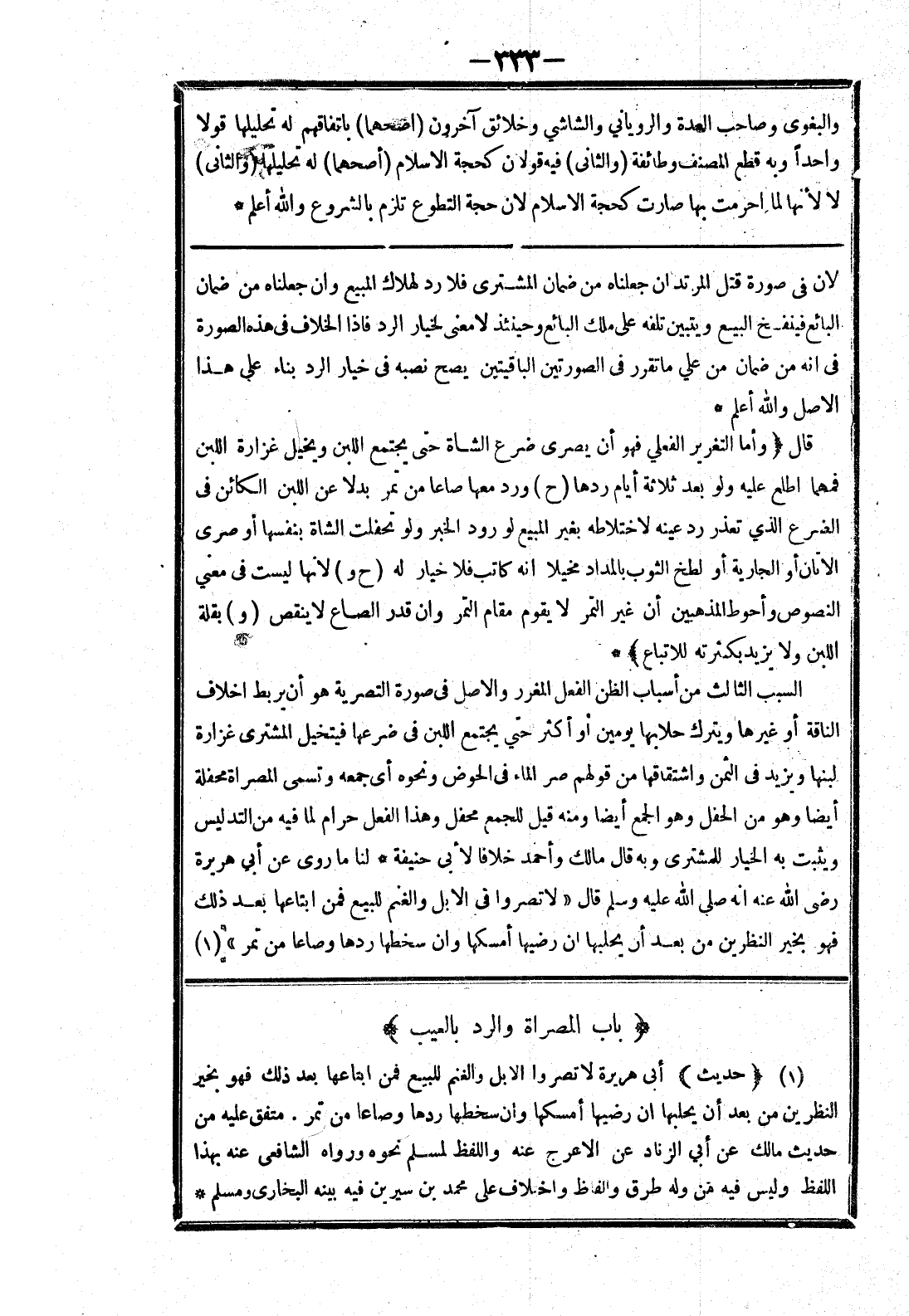 الضرع الذي تعذر رد عينه لاختلاطه بغير المبيع لورود الخبر ولو تحفلت الشاة بنفسها أو صرى الاتان أو الجارية أو لطخ الثوب بالمداد مخيلا انه كاتب فلا خيار له (ح و) لانها ليست في معنى النصوص وأحوط المذهبين أن غير التمر لا يقوم مقام التمر وان قدر الصاع لا ينقص (و) بقلة اللبن ولا يزيد بكثرته للاتباع) * السبب الثالث من أسباب الظن الفعل المغرر والاصل في صورة التصرية هو أن يربط اخلاف الناقة أو غيرها ويترك حلابها يومين أو أكثر حتى يجتمع اللبن في ضرعها فيتخيل المشتري غزارة لبنها ويزيد في الثمن واشتقاقها من قولهم صر الماء في الحوض ونحوه أي جمعه وتسمى المصراة محفلة أيضا وهو من الحفل وهو الجمع أيضا ومنه قيل للجمع محفل وهذا الفعل حرام لما فيه من التدليس ويثبت به الخيار للمشتري وبه قال مالك وأحمد خلافا لابي حنيفة * لنا ما روي عن أبي هريرة رضى الله عنه انه صلى الله عليه وسلم قال (لا تصروافي الابل والغنم للبيع فمن ابتاعها بعد ذلك فهو بخير النظرين من بعد أن يحلبها ان رضيها أمسكها وان سخطها ردها وصاعا من تمر)