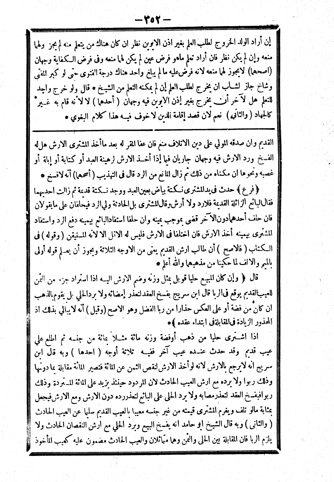 القديم وان صدقه المولى على دين الاتلاف منع فان عفا المقر له بعد ما أخذ المشتري الارش هل له الفسخ ورد الارش فيه وجهان جاريان فيما إذا أخذ الارش لرهينة العبد أو كتابة أو إبلة أو غصبه ونحوها ان مكناه من ذلك ثم زال المانع من الرد قال في التهذيب (أصحهما) أنه لا فسخ * (فرع) حدث في يد المشتري نكتة بياض بعين العبد ووجد نكتة قديمة ثم زالت احديهما فقال البائع الزائلة القديمة فلا رد ولا أرش وقال المشتري بل الحادثة ولي ارد فيحلفان على ما يقولان فان حلف احدهما دون الاخر قضى بموجب يمينه وان حلفا استفاد البائع بيمينه دفع الرد واستفاد المشتري بيمينه أخذ الارش فان اختلفا في الارش فليس له الاقل الا لانه المستيقن (وقوله) في الكتاب (فالاصح) أن طالب ارش القديم يعنى من الاوجه الثلاثة ويجوز أن يعلم قوله أولى بالميم والالف لما حكينا من مذهبهما والله أعلم * قال (وإن كان المبيع حليا قوبل بمثل وزنه وضم الارش إليه إذا استراد جزء من الثمن للعيب القديم يوقع في الربا قال ابن سريج بفسخ العقد لتعذر إمضائه ولا برد الحلي بل يقوم بالذهب ان كان من فضة أو على العكس حذارا من ربا الفضل وهو الاصح (وقيل) أنه لا يبالي بذلك إذ المحذور الزيادة في المقابلة في ابتداء عقده) * إذا اشترى حليا من ذهب أو فضة وزنه مائة مثلا بمائة من جنسه ثم اطلع على عيب قديم وقد حدث عنده عيب آخر ففيه ثلاثة أوجه (احدها) وبه قال ابن سريج انه لا يرجع بالارش لانه لو أخذ الارش لنقص الثمن عن المائة فتصير المائة مقابلة بما دونها وذلك ربوا ولا يرده مع ار ش العيب الحادث لان المردود حينئذ يزيد على المائة المستردة وذلك ربوا فبفسخ العقد لتعذر مصابه ولا يرد الحلي على البائع لتعذر رده دون الارش ومع الارش فيجعل بمثابة مالو تلف ويغرم المشتري قيمته من غير جنسه معيبا بالعيب القديم سليما عن العيب الحادث (والثاني) وبه قال الشيخ أبو حامد انه يفسخ البيع ويرد الحلي مع ارش النقصان الحادث ولا
