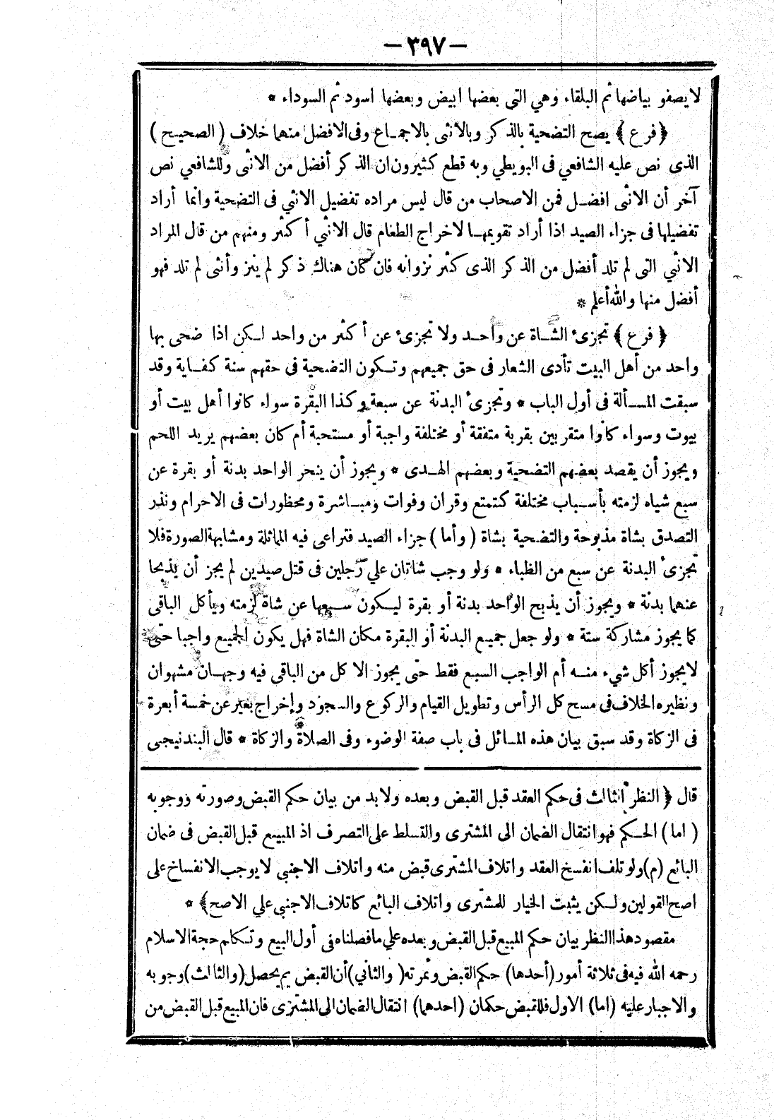قال (النظر الثالث في حكم العقد قبل القبض وبعده ولابد من بيان حكم القبض وصورته ووجوبه (اما) الحكم فهو انتقال الضمان إلى المشتري والتسلط على التصرف إذ المبيع قبل القبض في ضمان البائع (م) ولو تلف انفسخ العقد واتلاف المشتري قبض منه واتلاف الاجنبي لا يوجب الانفساخ على