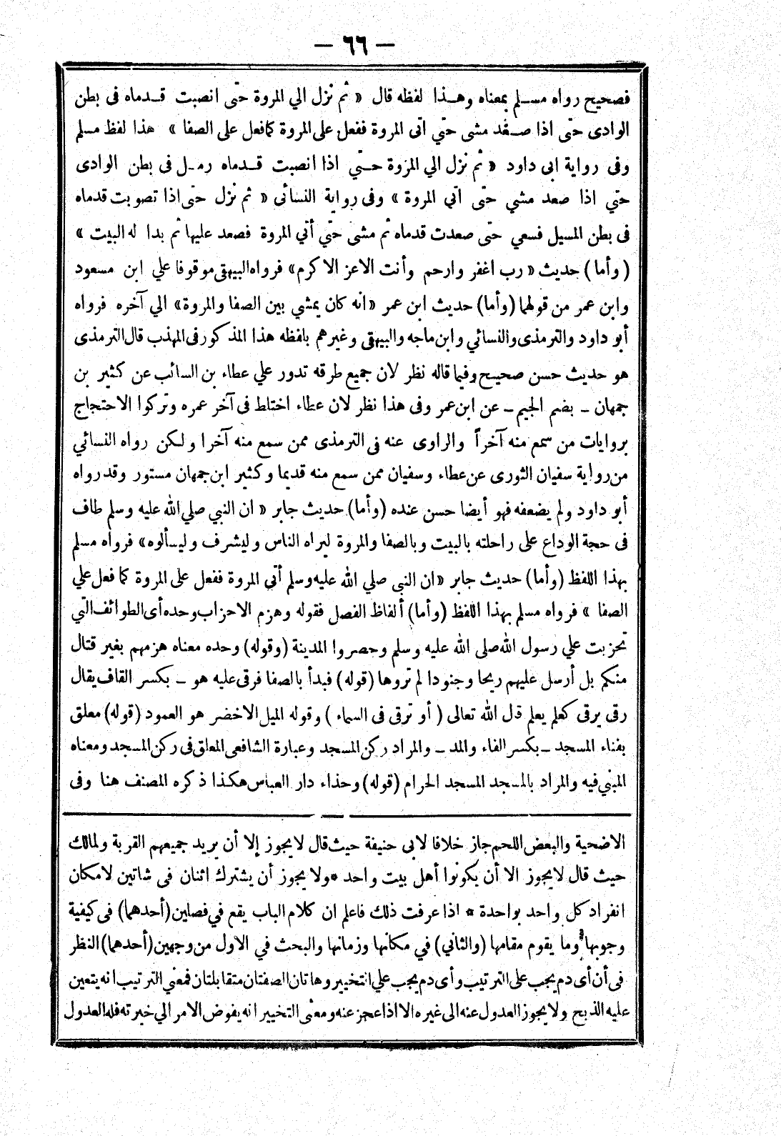 الاضحية والبعض اللحم جاز خلافا لابي حنيفة حيث قال لا يجوز إلا أن يريد جميعهم القربة ولمالك حيث قال لا يحوز الا أن يكونوا أهل بيت واحد * ولايجوز أن يشترك اثنان في شاتين لامكان انفراد كل واحد بواحدة * إذا عرفت ذلك فاعلم ان كلام الباب يقع في فصلين (أحدهما) في كيفية وجوبها وما يقوم مقامها (والثاني) في مكانها وزمانها والبحث في الاولى من وجهين (أحدهما) النظر في أن أي دم يجب على الترتيب واى دم يجب علي التخيير وهاتان الصفتنا متقابلتان فمعني الترتيب انه يتعين عليه الذبح ولا يجوز العدول عنه إلى غيره الا إذا عجز عنه ومعنى التخيير انه يفوض الامر الي خيرته فله العدول