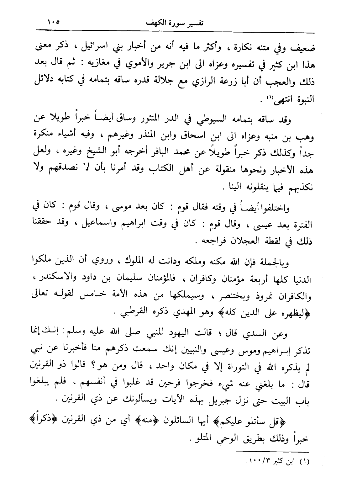 وعن السدي قال؛ قالت اليهود للنبي صلى الله عليه وسلم: إنك إنما تذكر إبراهيم وموسى وعيسى والنبيين إنك سمعت ذكرهم منا فأخبرنا عن نبي لم يذكره الله في التوراة إلا في مكان واحد، قال " ومن هو؟ " قالوا ذو القرنين قال: " ما بلغني عنه شيء " فخرجوا فرحين قد غلبوا في أنفسهم، فلم يبلغوا باب البيت حتى نزل جبريل بهذه الآيات