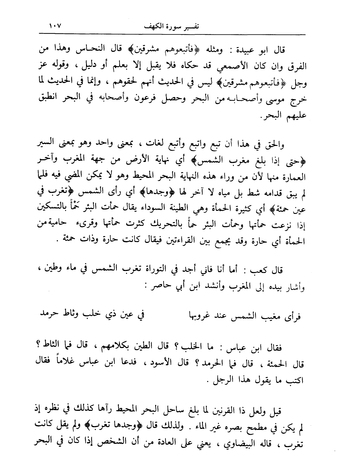 قال كعب: أما أنا فإني أجد في التوراة تغرب الشمس في ماء وطين، وأشار بيده إلى المغرب وأنشد ابن أبي حاصر: