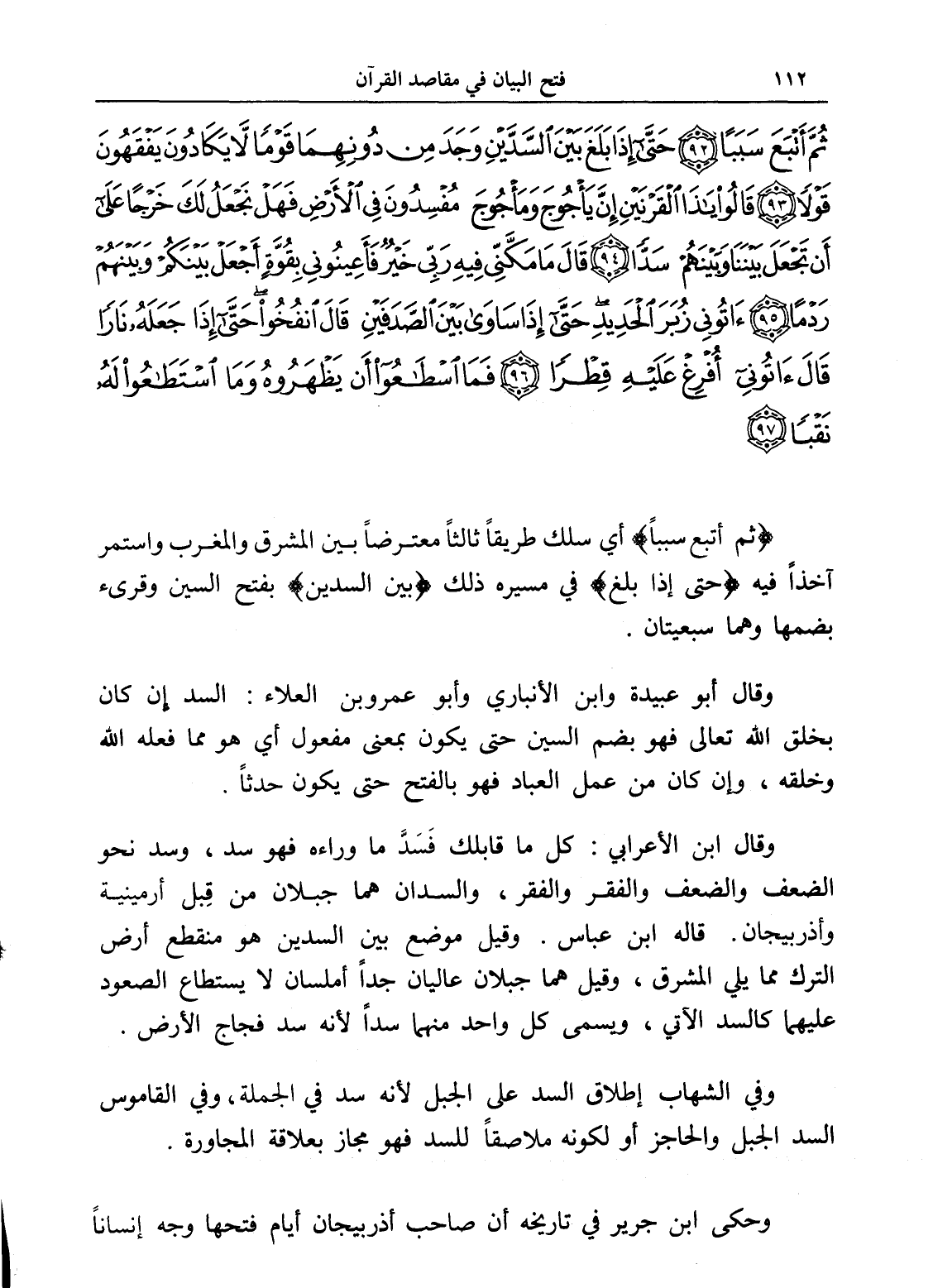 ثُمَّ أَتْبَعَ سَبَبًا (92) حَتَّى إِذَا بَلَغَ بَيْنَ السَّدَّيْنِ وَجَدَ مِنْ دُونِهِمَا قَوْمًا لَا يَكَادُونَ يَفْقَهُونَ قَوْلًا (93) قَالُوا يَا ذَا الْقَرْنَيْنِ إِنَّ يَأْجُوجَ وَمَأْجُوجَ مُفْسِدُونَ فِي الْأَرْضِ فَهَلْ نَجْعَلُ لَكَ خَرْجًا عَلَى أَنْ تَجْعَلَ بَيْنَنَا وَبَيْنَهُمْ سَدًّا (94) قَالَ مَا مَكَّنِّي فِيهِ رَبِّي خَيْرٌ فَأَعِينُونِي بِقُوَّةٍ أَجْعَلْ بَيْنَكُمْ وَبَيْنَهُمْ رَدْمًا (95) آتُونِي زُبَرَ الْحَدِيدِ حَتَّى إِذَا سَاوَى بَيْنَ الصَّدَفَيْنِ قَالَ انْفُخُوا حَتَّى إِذَا جَعَلَهُ نَارًا قَالَ آتُونِي أُفْرِغْ عَلَيْهِ قِطْرًا (96) فَمَا اسْطَاعُوا أَنْ يَظْهَرُوهُ وَمَا اسْتَطَاعُوا لَهُ نَقْبًا (97)