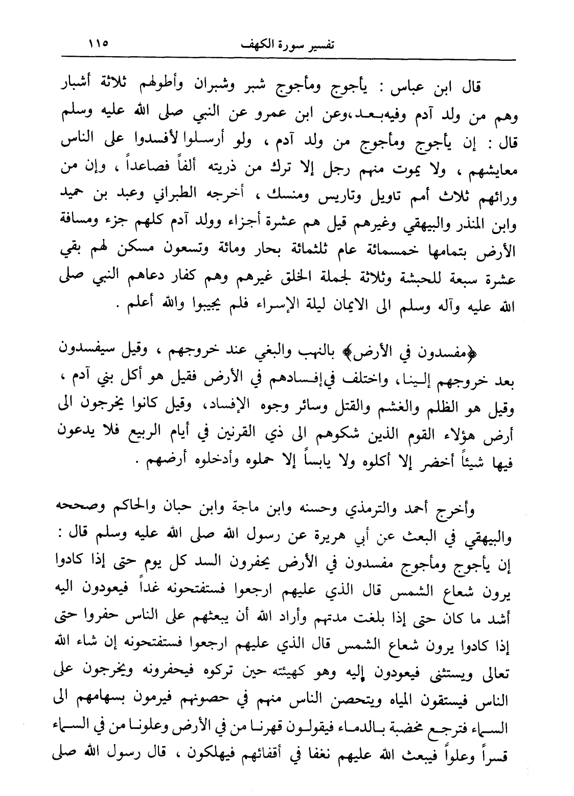 وأخرج أحمد والترمذي وحسنه وابن ماجة وابن حبان والحاكم وصححه والبيهقي في البعث عن أبي هريرة عن رسول الله صلى الله عليه وسلم قال: " إن يأجوج ومأجوج مفسدون في الأرض يحفرون السد كل يوم حتى إذا كادوا يرون شعاع الشمس قال الذي عليهم ارجعوا فستفتحونه غداً فيعودون إليه أشد ما كان حتى إذا بلغت مدتهم وأراد الله أن يبعثهم على الناس حفروا حتى إذا كادوا يرون شعاع الشمس قال الذي عليهم ارجعوا فستفتحونه إن شاء الله تعالى ويستثنى فيعودون إليه وهو كهيئته حين تركوه فيحفرونه ويخرجون على الناس فيستقون المياه ويتحصن الناس منهم في حصونهم فيرمون بسهامهم إلى السماء فترجع مخضبة بالدماء فيقولون قهرنا من في الأرض وعلونا من في السماء قسراً وعلواً فيبعث الله عليهم نغفا في أقفائهم فيهلكون، قال رسول الله صلى