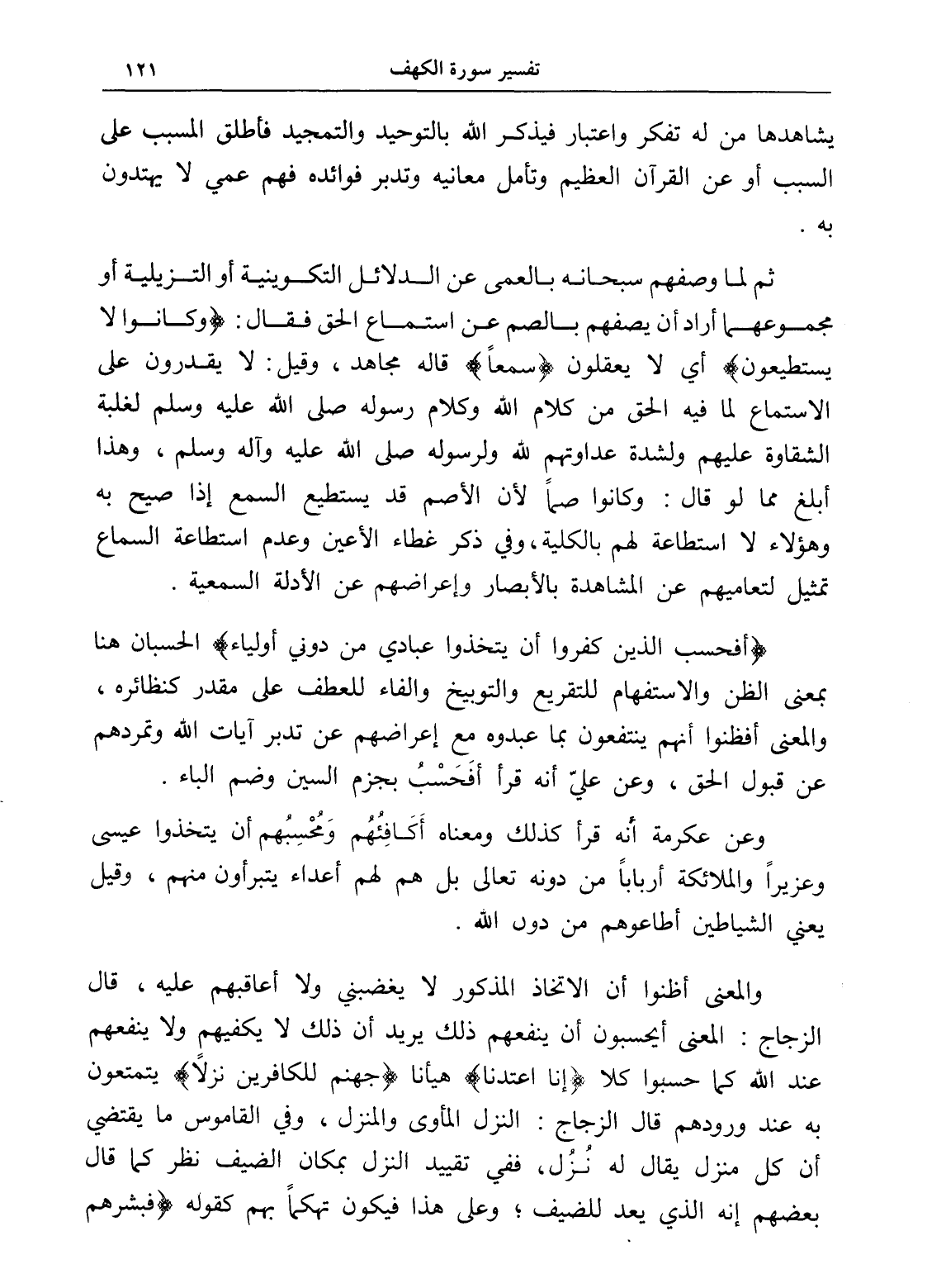 (أفحسب الذين كفروا أن يتخذوا عبادي من دوني أولياء) الحسبان هنا بمعنى الظن والاستفهام للتقريع والتوبيخ والفاء للعطف على مقدر كنظائره، والمعنى أفظنوا أنهم ينتفعون بما عبدوه مع إعراضهم عن تدبر آيات الله وتمردهم عن قبول الحق، وعن عليّ أنه قرأ أفَحَسْبُ بجزم السين وضم الباء.
