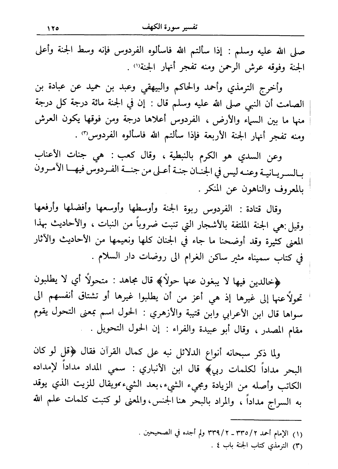 وقال قتادة: الفردوس ربوة الجنة وأوسطها وأوسعها وأفضلها وأرفعها وقيل: هي الجنة الملتفة بالأشجار التي تنبت ضروباً من النبات، والأحاديث بهذا المعنى كثيرة وقد أوضحنا ما جاء في الجنان كلها ونعيمها من الأحاديث والآثار في كتاب سميناه مثير ساكن الغرام إلى روضات دار السلام.