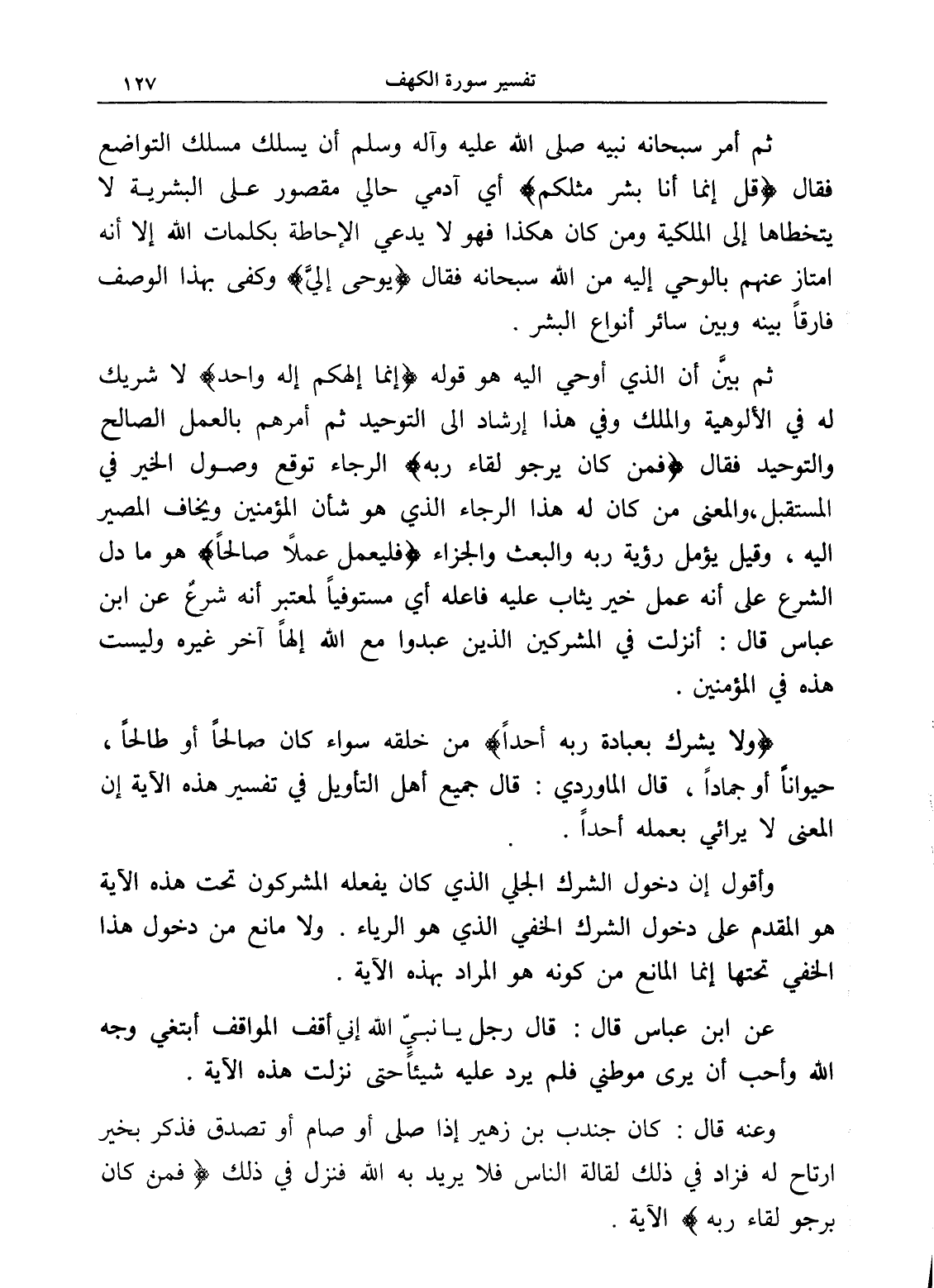 (ولا يشرك بعبادة ربه أحداً) من خلقه سواء كان صالحاً أو طالحاً، حيواناً أو جماداً، قال الماوردي: قال جميع أهل التأويل في تفسير هذه الآية إن المعنى لا يرائي بعمله أحداً.