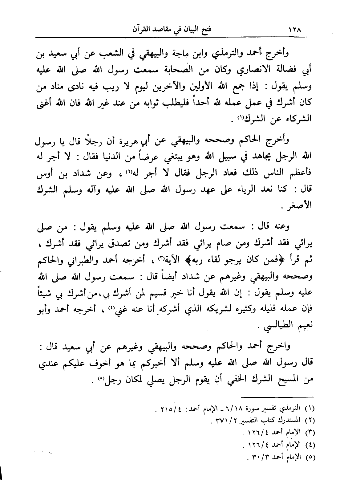 واخرج أحمد والحاكم وصححه والبيهقي وغيرهم عن أبي سعيد قال: قال رسول الله صلى الله عليه وسلم " ألا أخبركم بما هو أخوف عليكم عندي من المسيح الشرك الخفي أن يقوم الرجل يصلي لمكان رجل " (¬5).